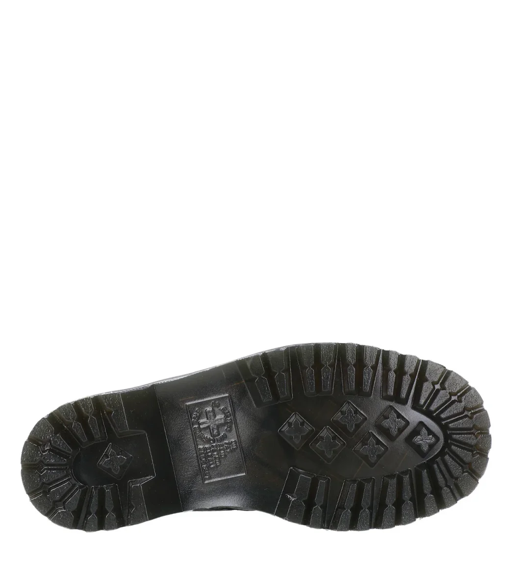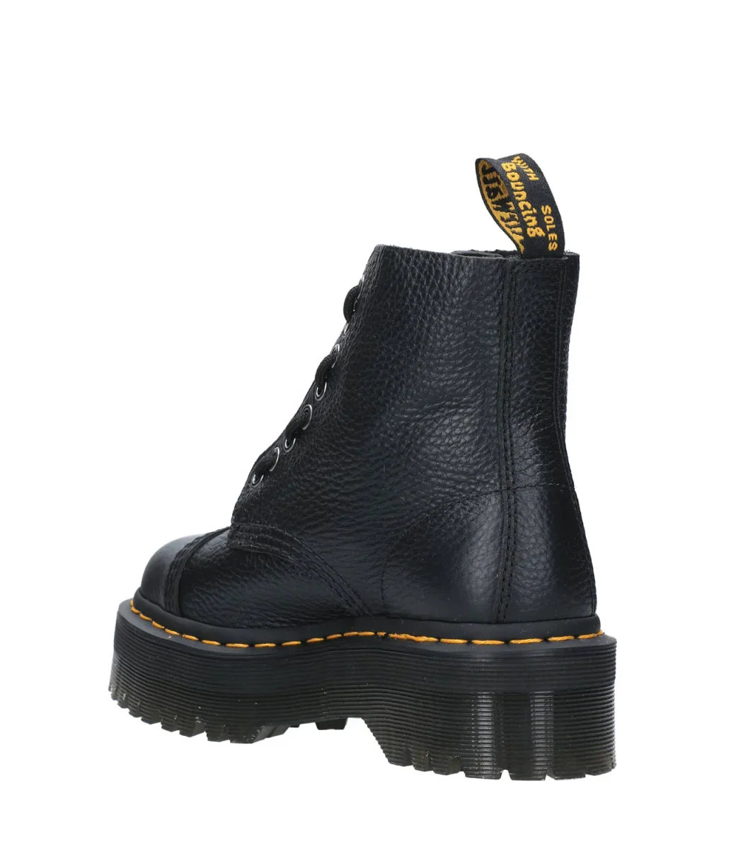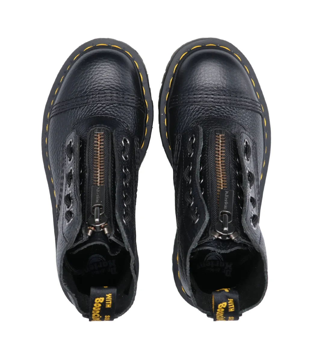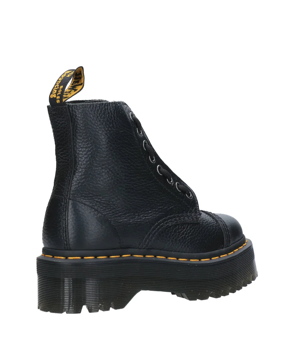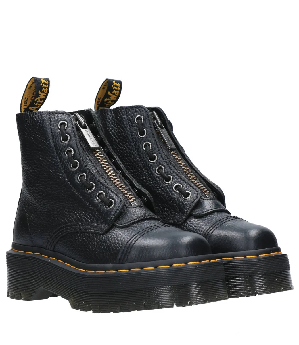 Anfibio Dr Martens Sinclair in pelle martellata Milled resistente e al tempo stesso elastica e morbida al tatto sin dal primo utilizzo, chisura con lacci frontali e zip laterale, cuciture gialle. Stivali dal carattere forte poggiano su una suola platform Quad torreggiante.