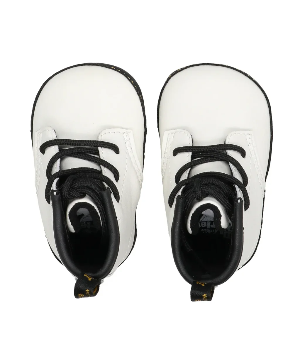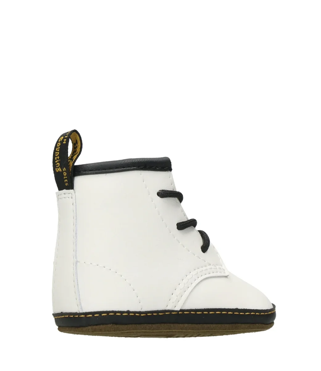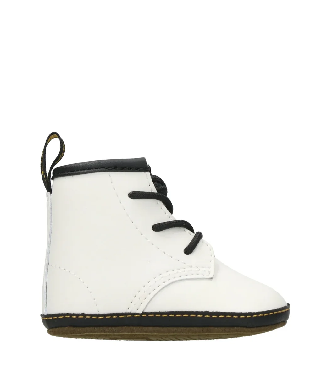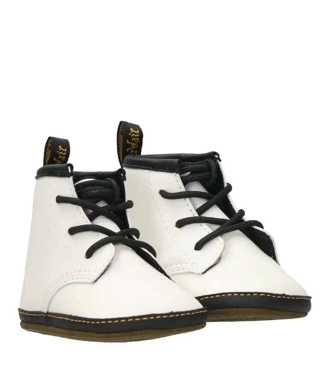 Anfibio Dr Martens Kids 1460 Crib con 3 occhielli, realizzati in morbida pelle bianca per un comfort extra e una comodissima suola antiscivolo sono perfetti per i primi passi.