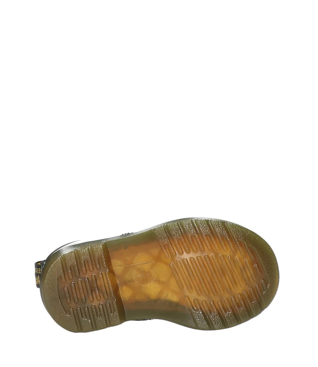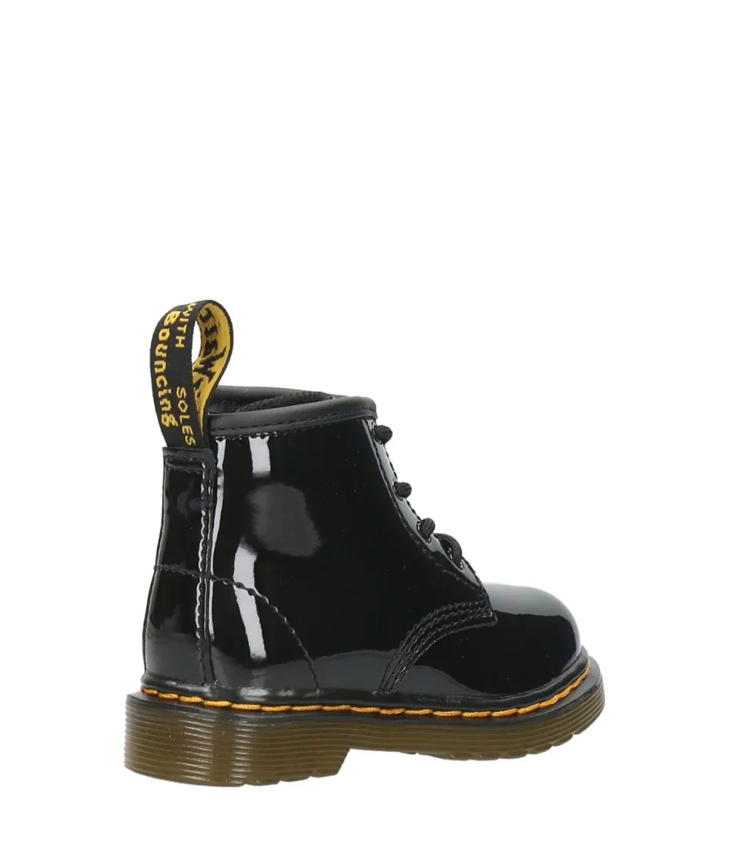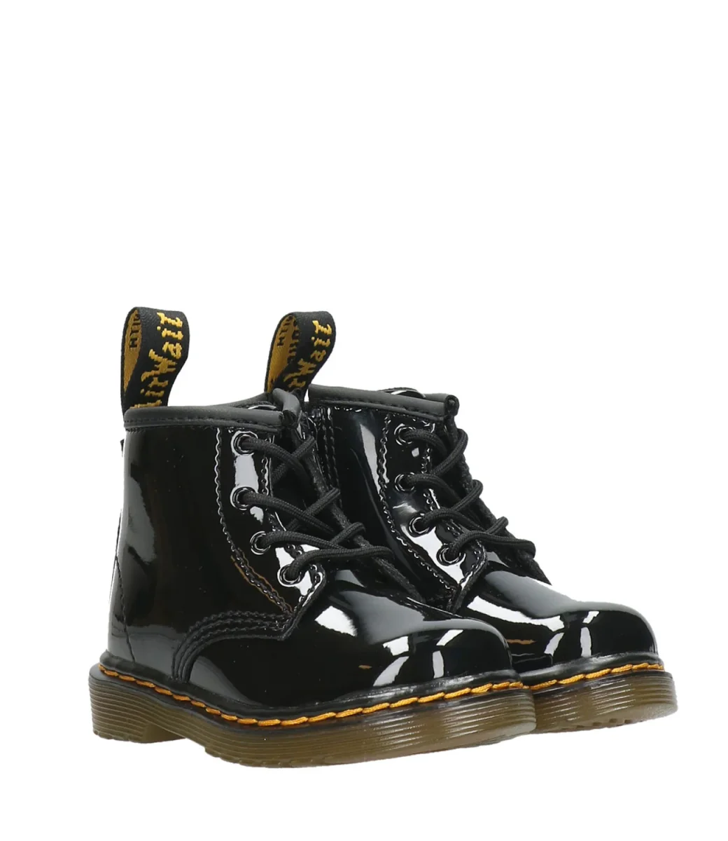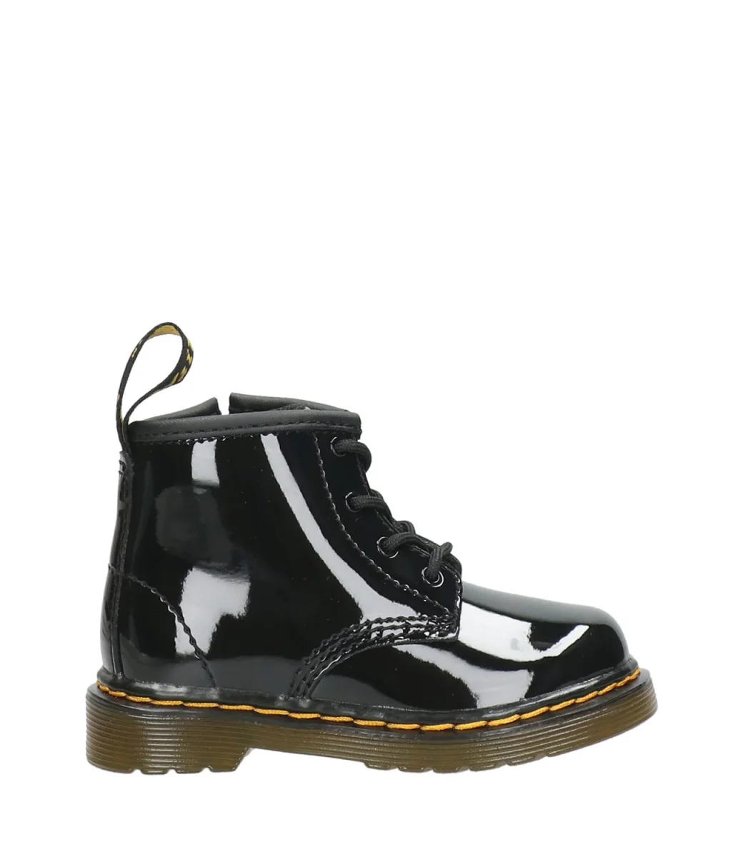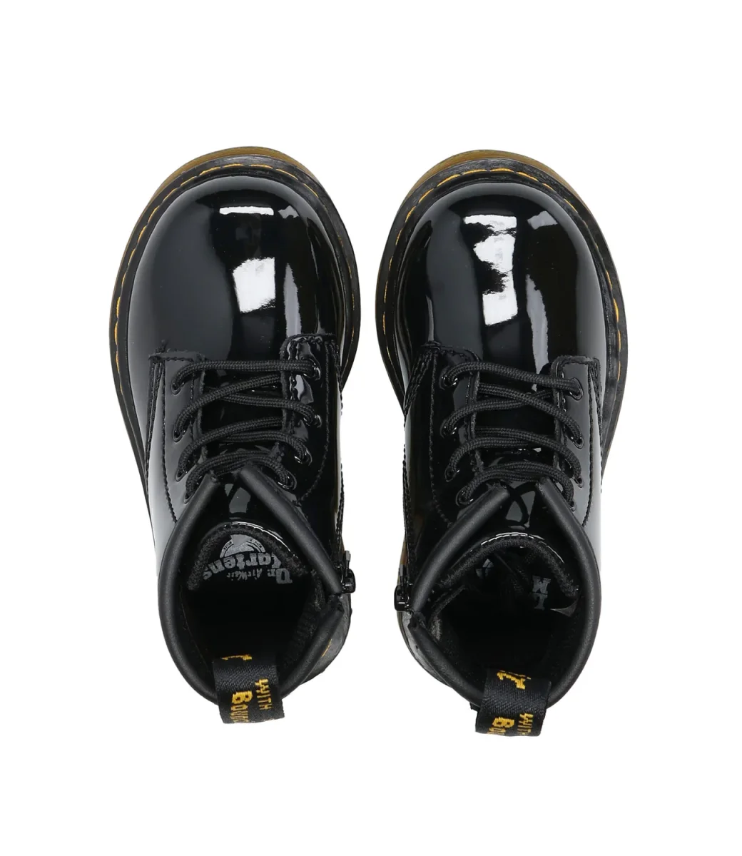 Anfibio Dr Martens 1460 I. Realizzati con la nostra morbida pelle Patent Lamper e fissati su una suola flessibile e confortevole. Presentano le inconfondibili cuciture gialle e una linguetta sul tallone gialla e nera.