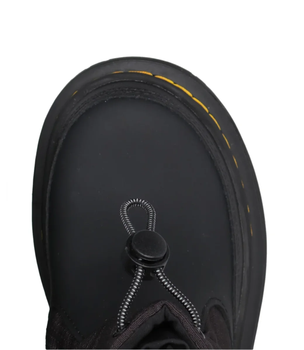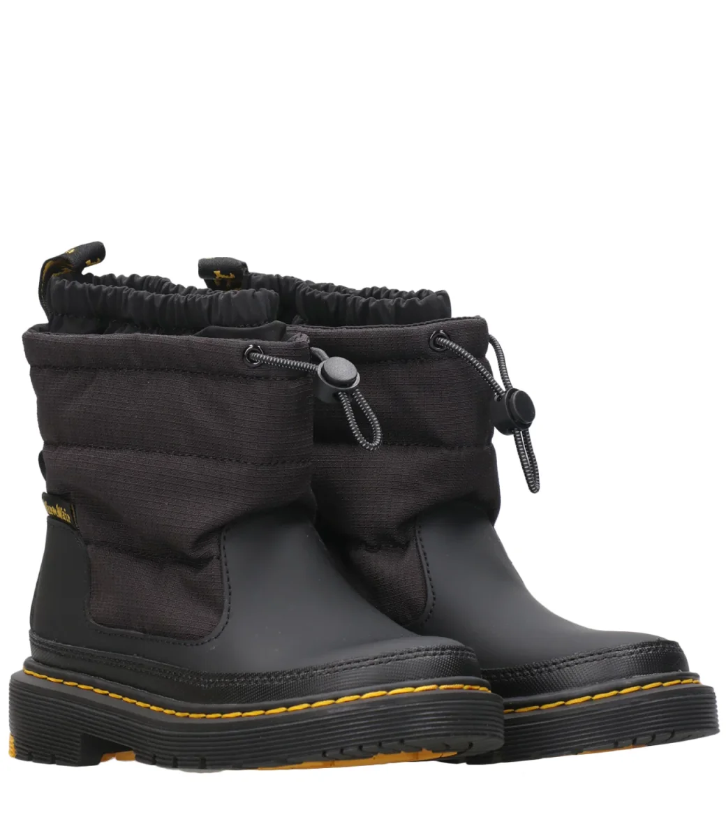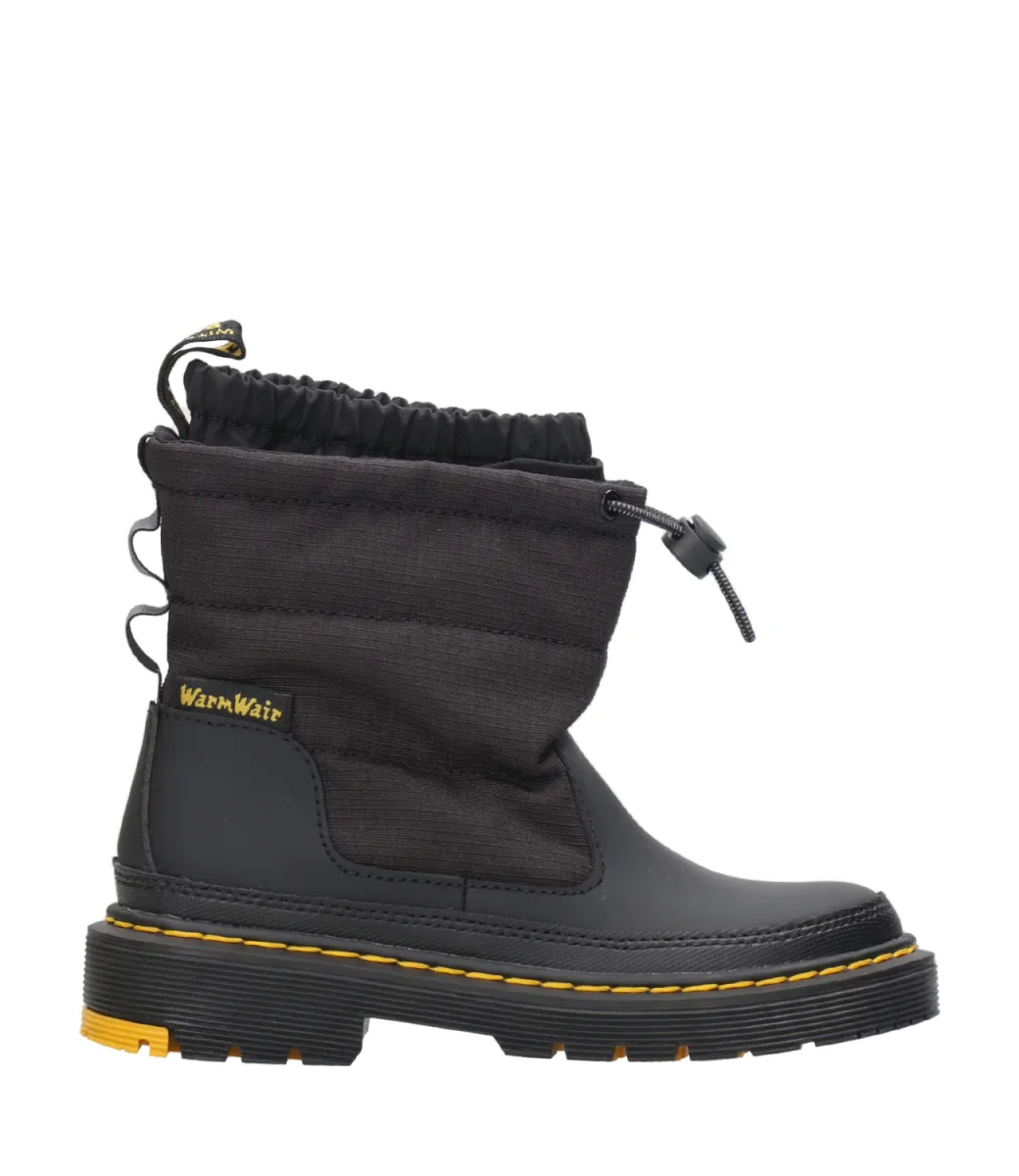 Anfibio Dr Martens Kids Awpo J in pelle e tessuto tecnico, gambale mordido bordato con coulisse regolabile e cursore, interno in pile bordato da ghetta con elastico, tirante a fettuccia in tessuto AirWair, suola in gomma con bordi scanalati. Decorati con iconiche cuciture gialle.
