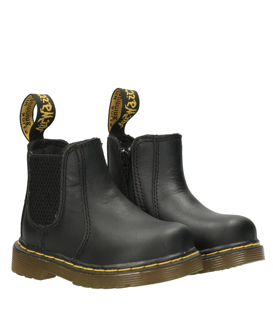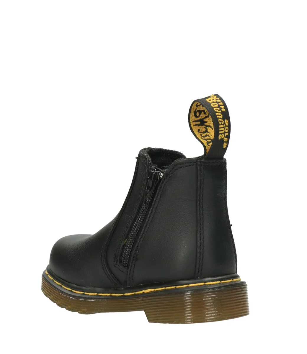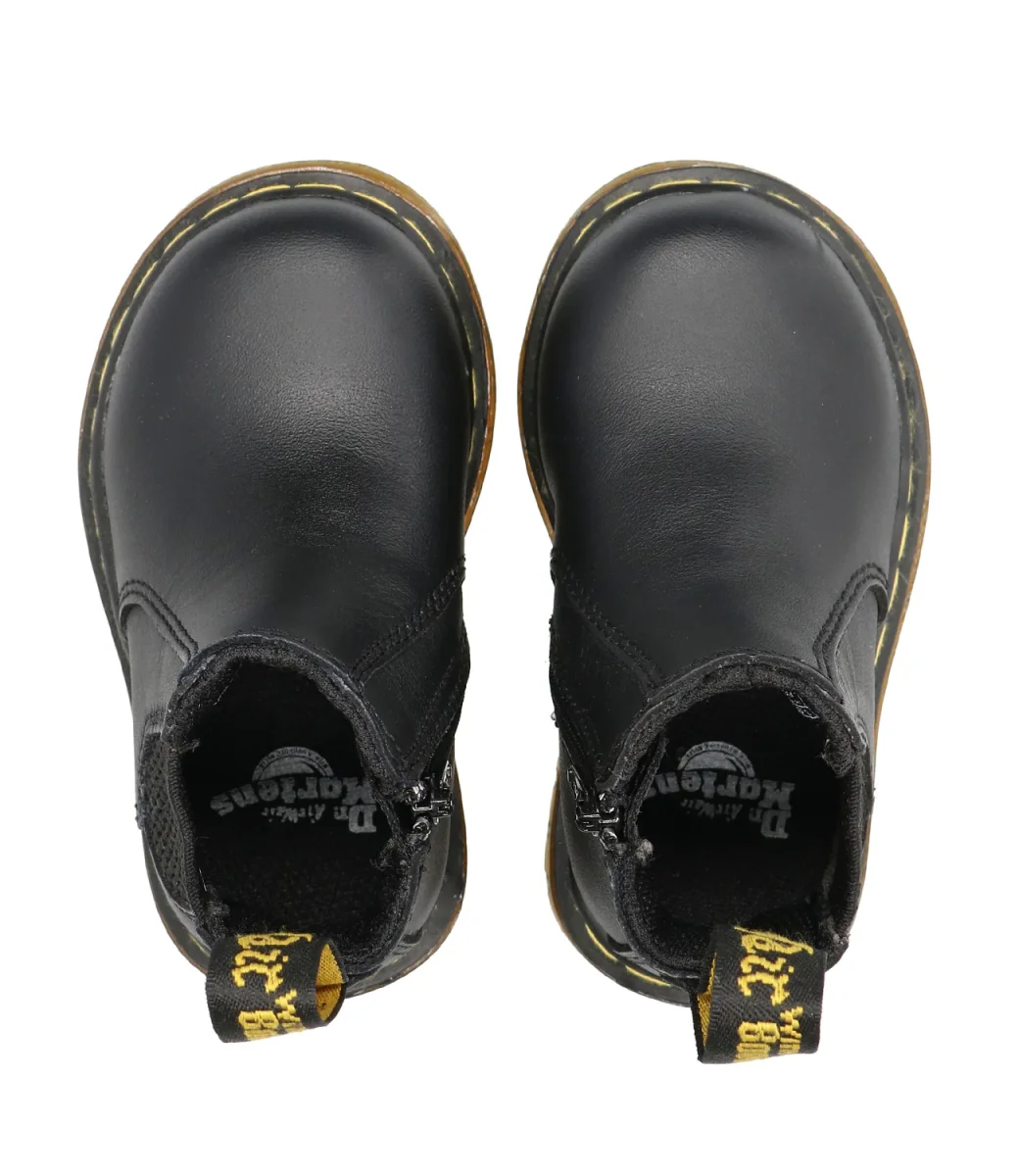 Beatles Dr Martens Kids 2976 Trealizzato in pelle pieno fiore morbido al tatto, inserto elastico laterale, chiusura con zip nel lato interno, suola con cuscinetto d’aria con scanalature laterali. Tirante in tessuto. Iconiche cuciture gialle.