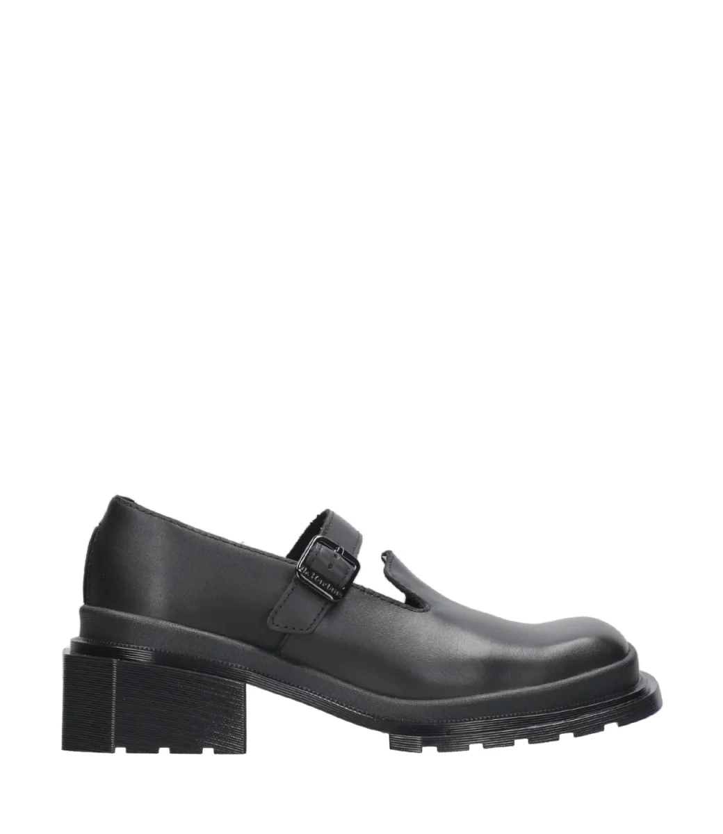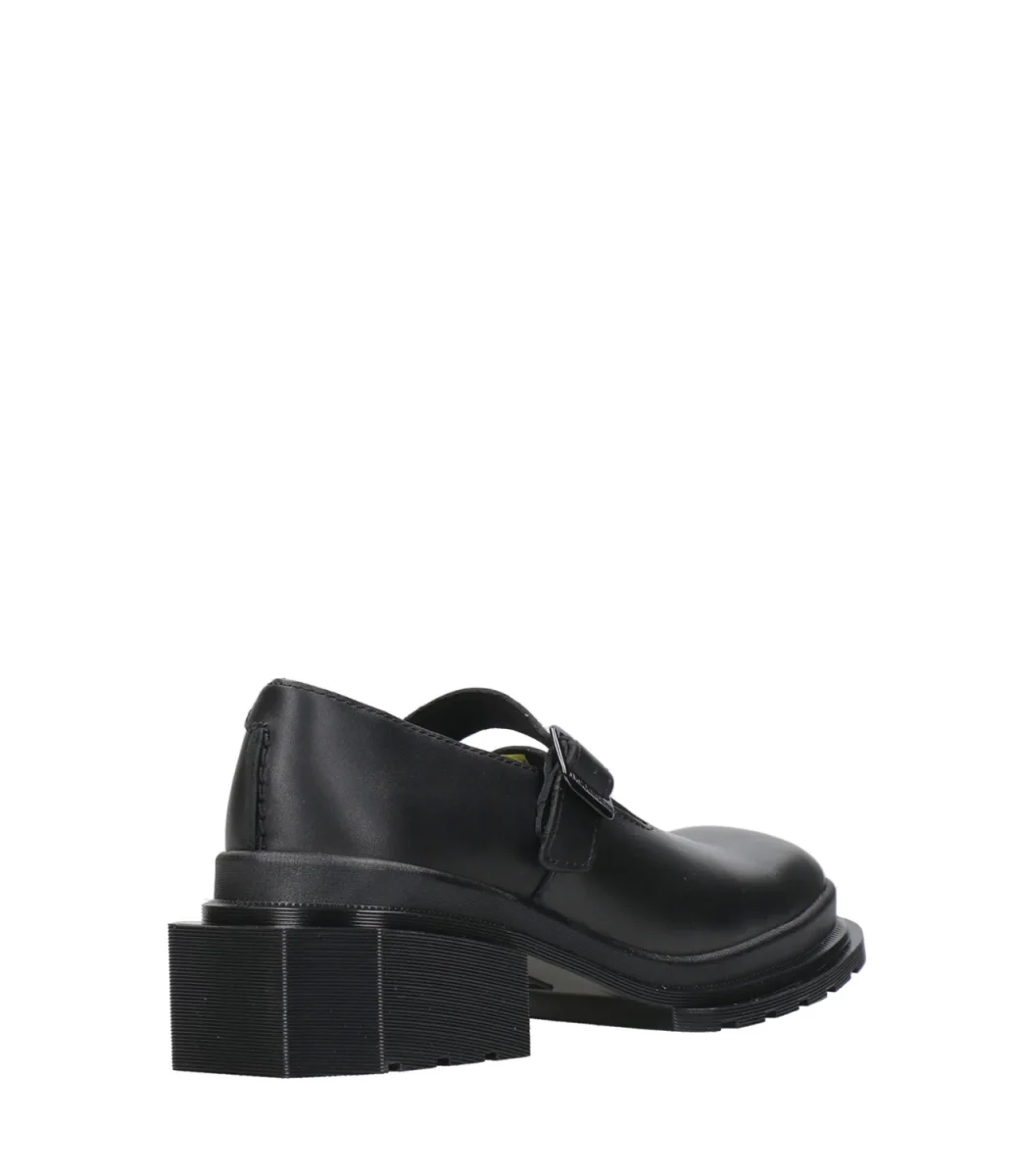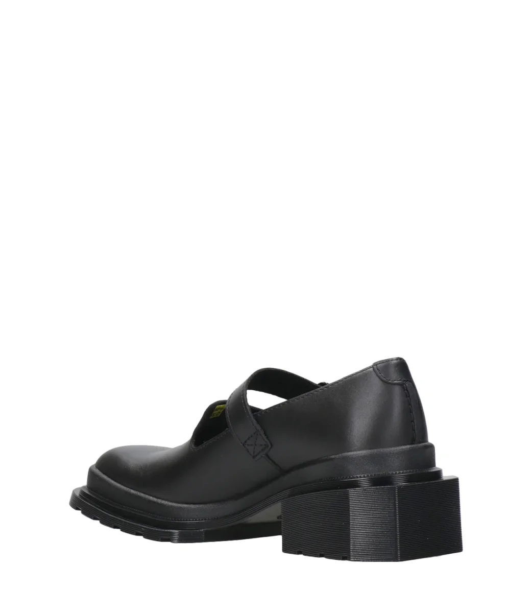 Scarpa Dr Martens Maybole in pelle Wanama leggera con finitura satinata e lucida. Dedign con bordi quadrati una rivoluziona dalla silhouette Mary Jane. Suola larga e angolare in gomma rifinita con motivo scanalato, angoli marcati lungo il tacco. Chiusura con cinturino sul collo che si allaccia con una fibbia regolabile e logata Dr. Martens.