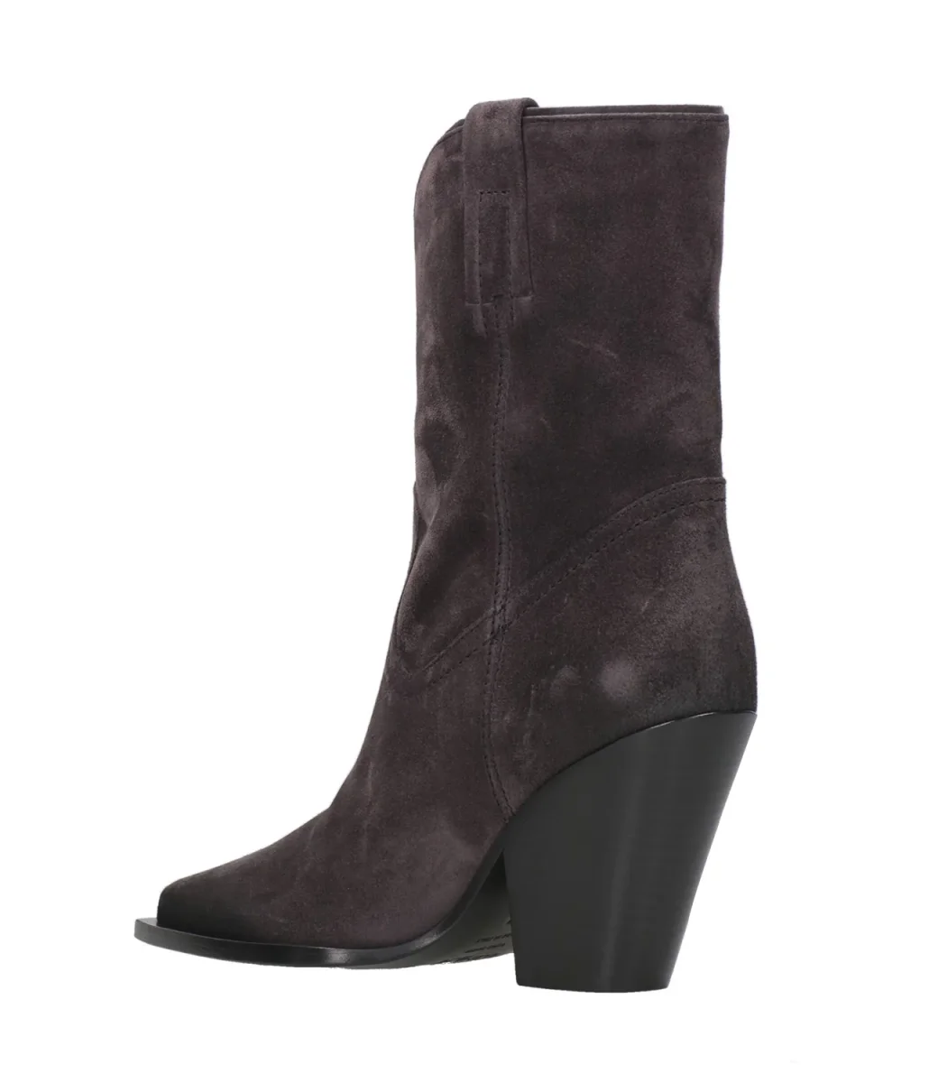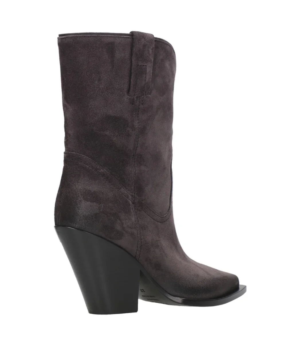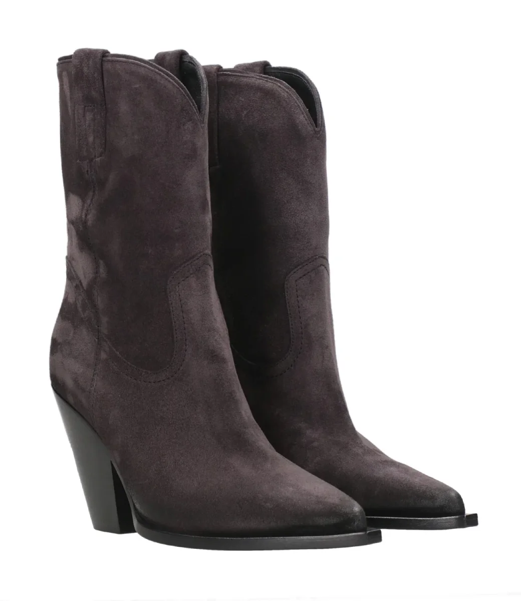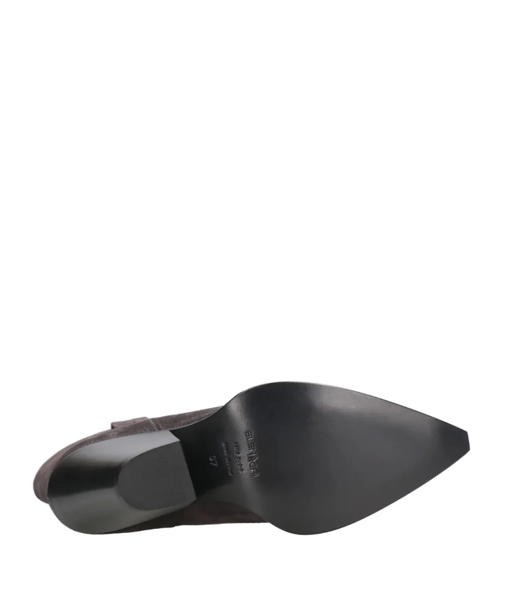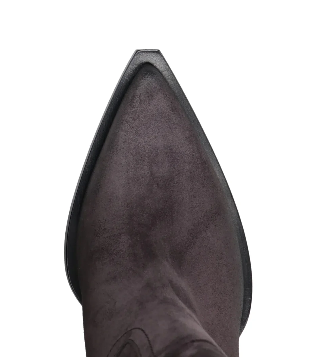 Stivale Elena Iachi, tomaia in camoscio velour carbonio, con impunture, modello texano con punta, altezza gambale 23 cm, con fodera in pelle, tacco altezza tacco 10cm, suola in cuoio. made in Italy.