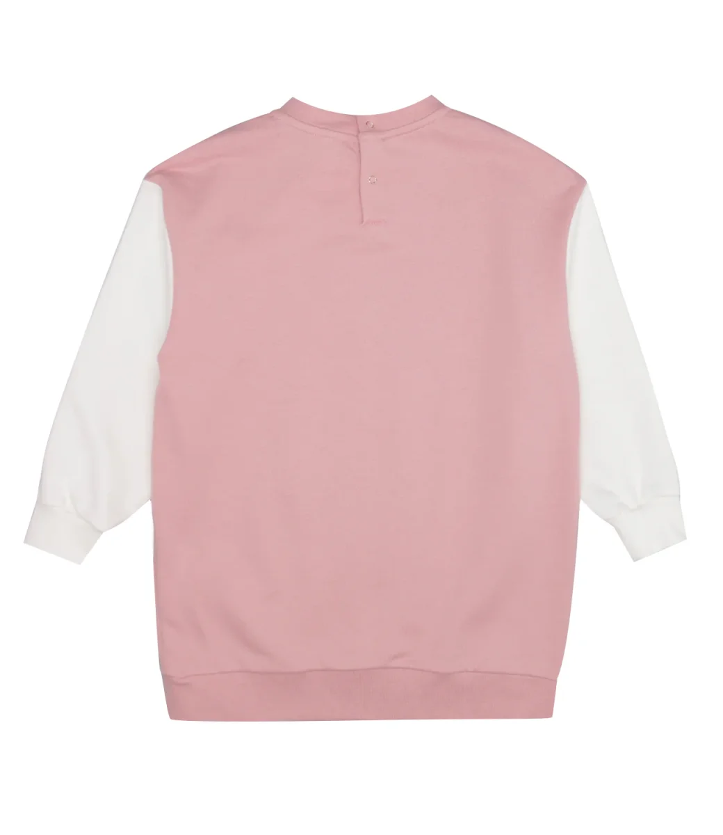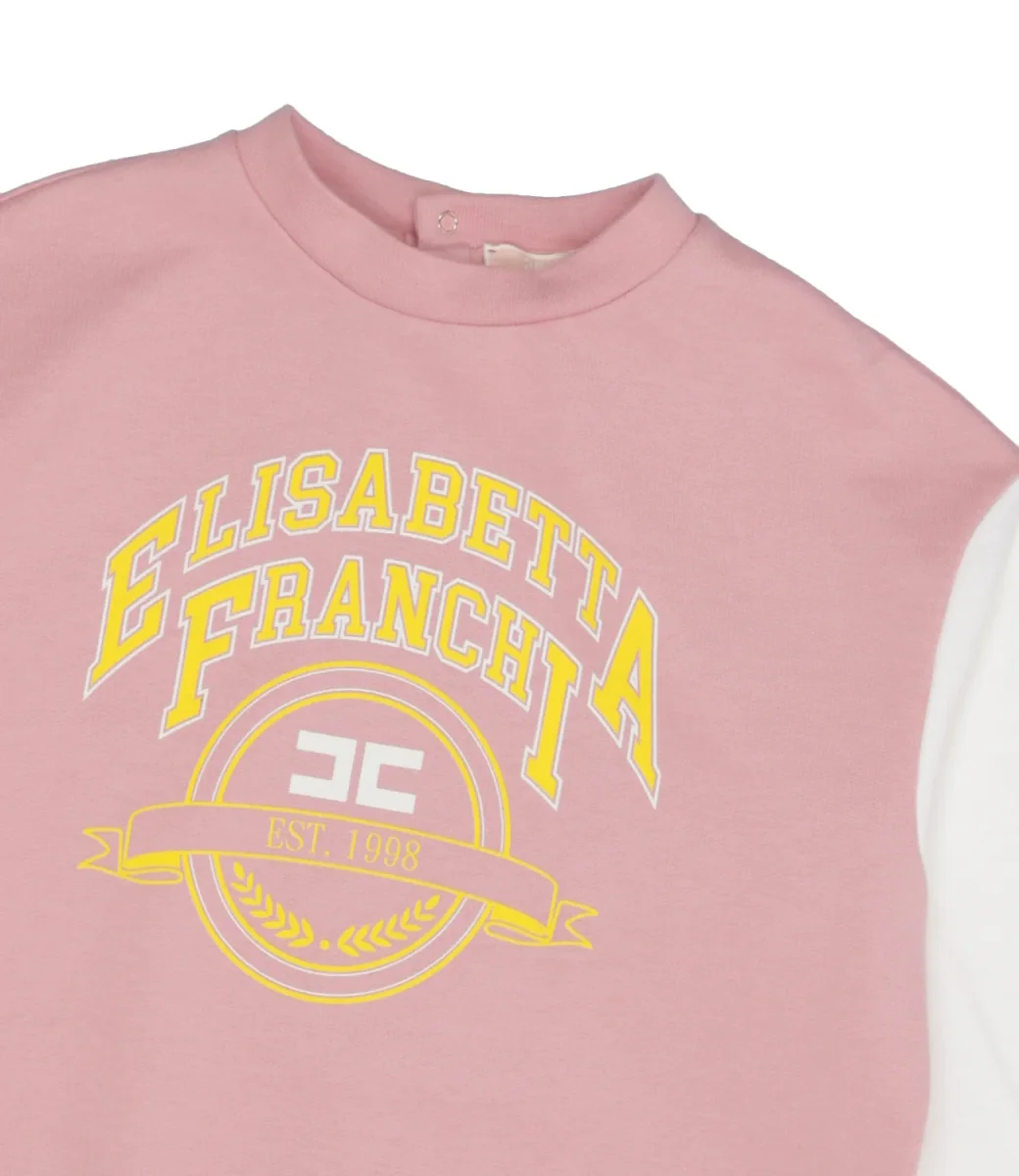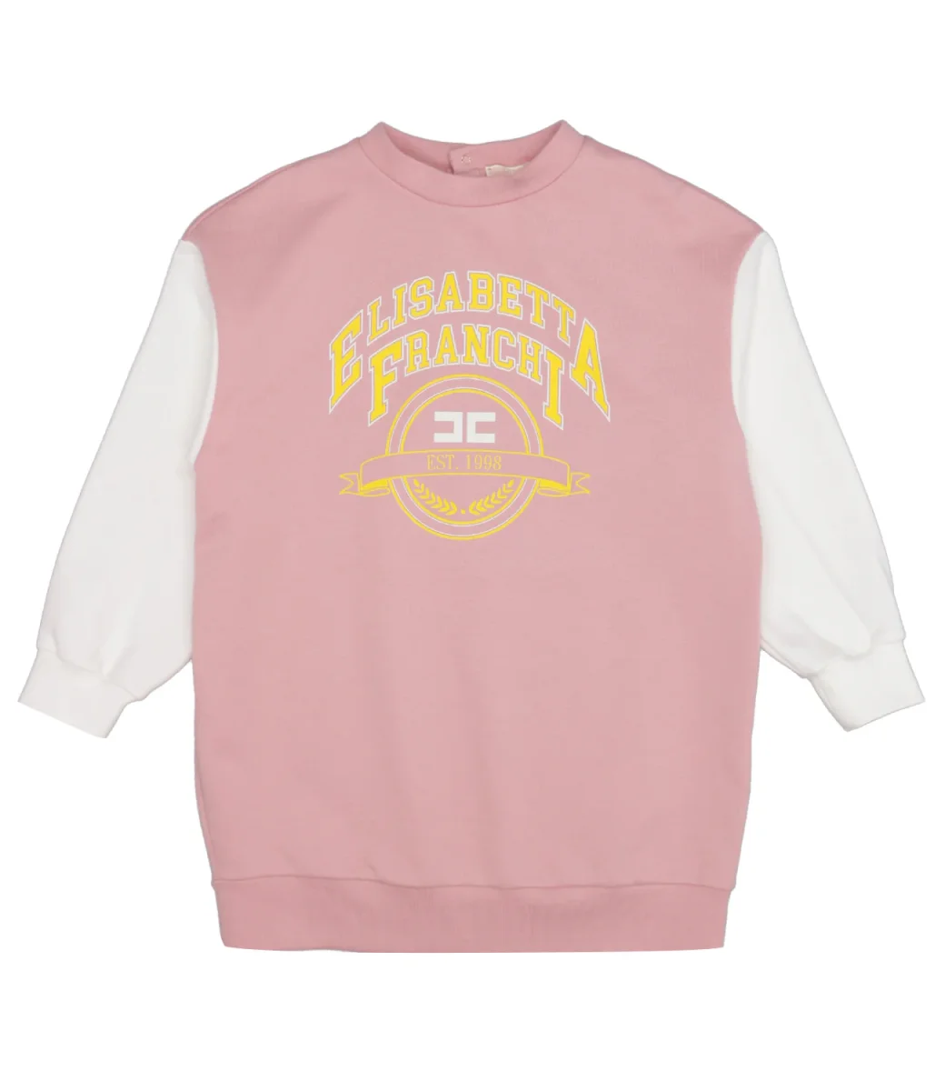 Abito Elisabetta Franchi La Mia Bambina Over in felpa, girocollo con chiusura sul retro con bottoncini automatici, maniche lunghe in contrasto di colore con polsini, fondo con bordo a costine, maxi stampa del logo sul torace