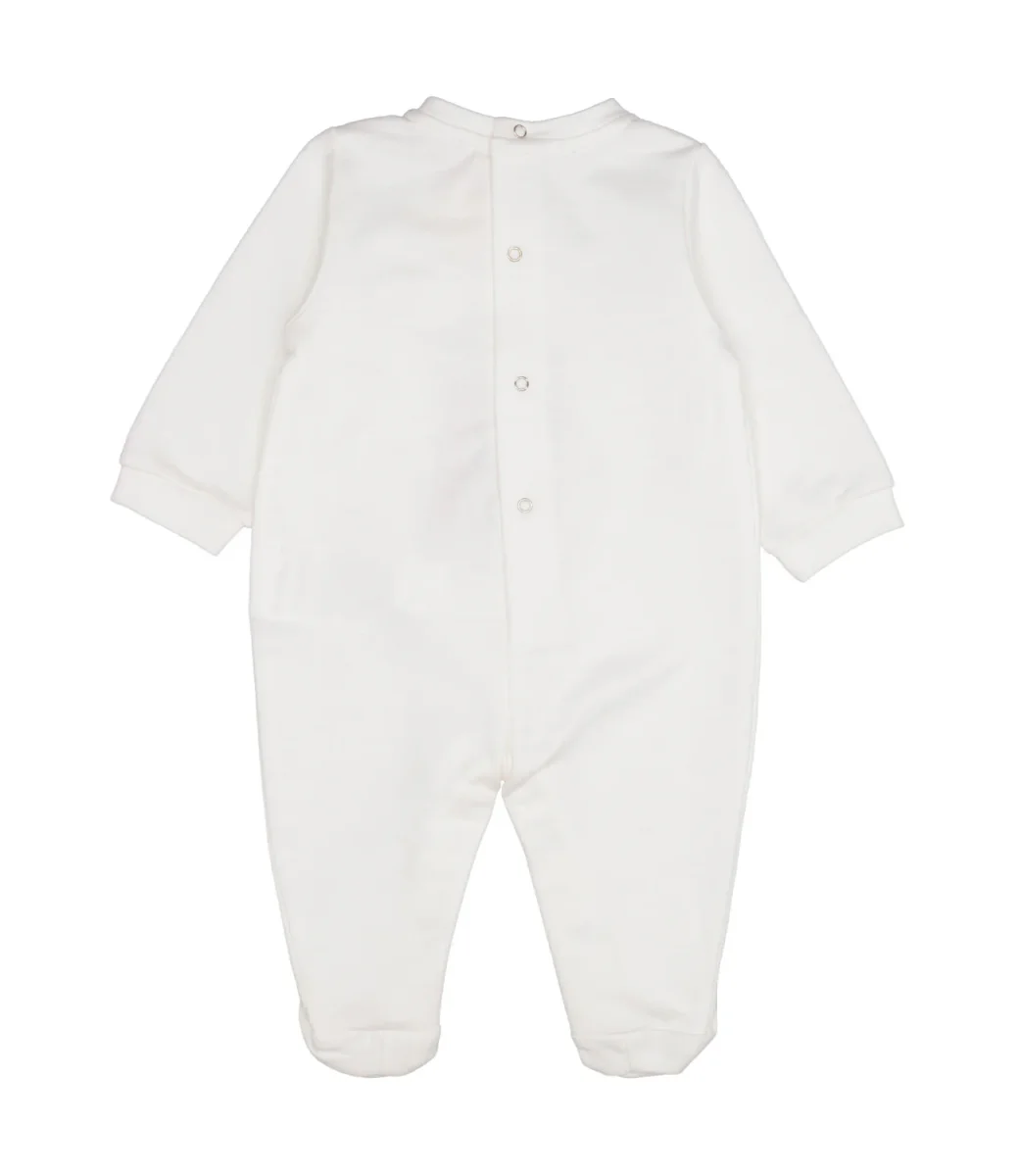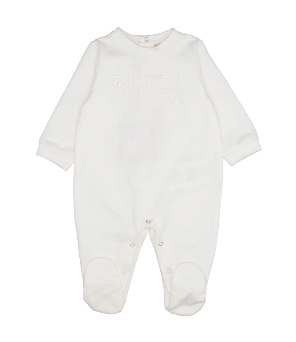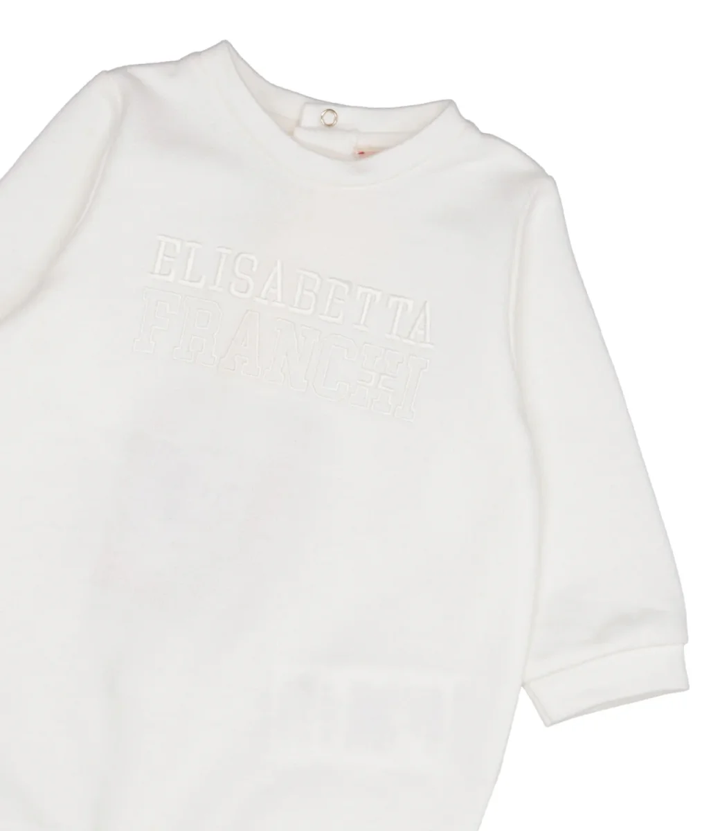 Tutina Elisabetta Franchi La Mia Bambina in felpa di cotone, girocollo, logo lettering tono su tono ricamato sul torace, maniche lunghe con polsini, chiusura con bottoni a pressione sul retro, ghetta con copripiedi, chiusura sul cavallo con bottoni automatici.