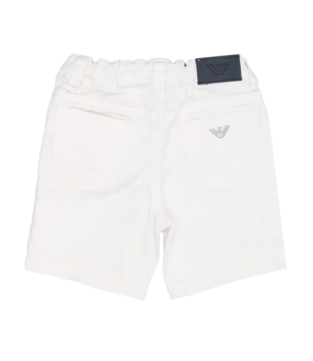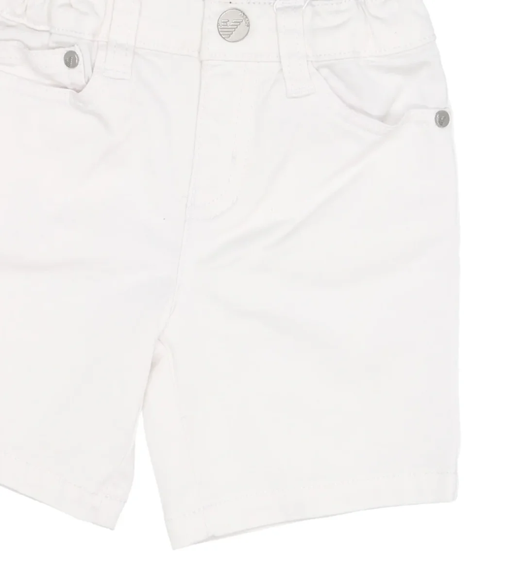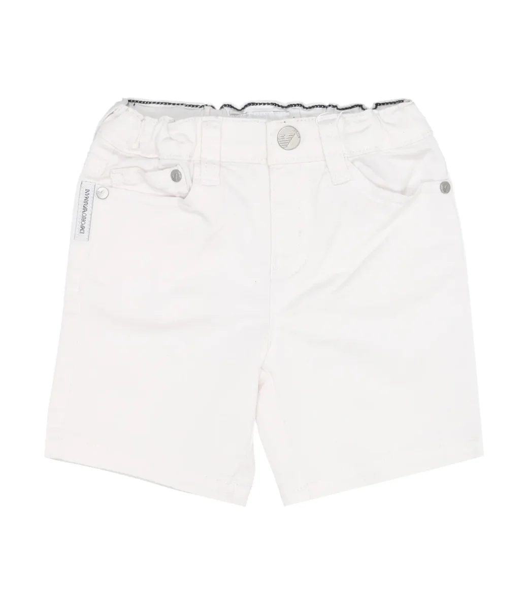 Bermuda Emporio Armani Junior in cotone bianco ottico, modello con cinque tasche, vita elasticizzata con passanti, chiusura frontale con zip nascosta e bottone in metallo, iconico logo in metallo applicato sul retro