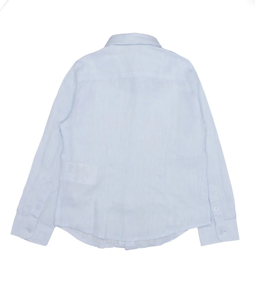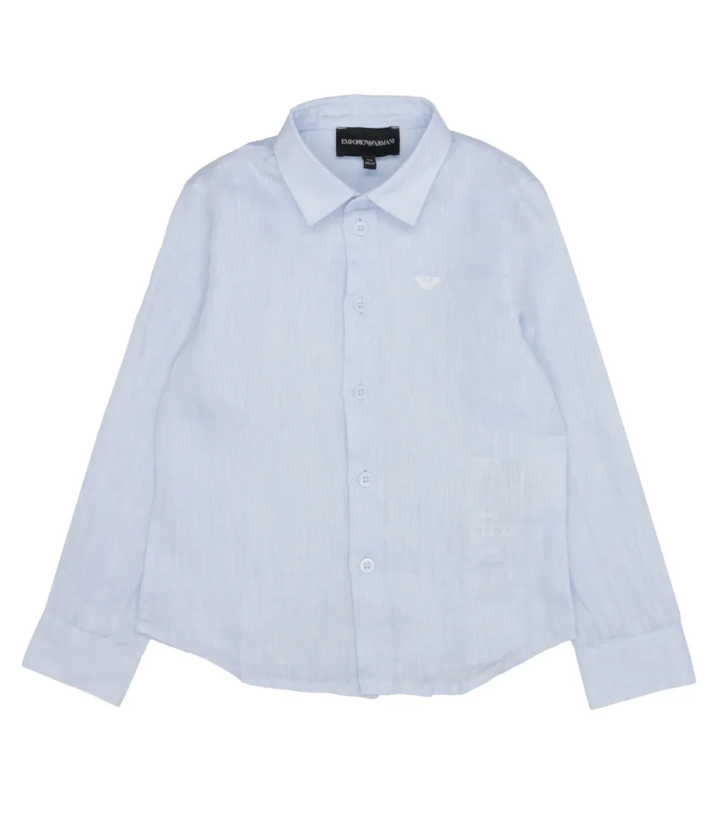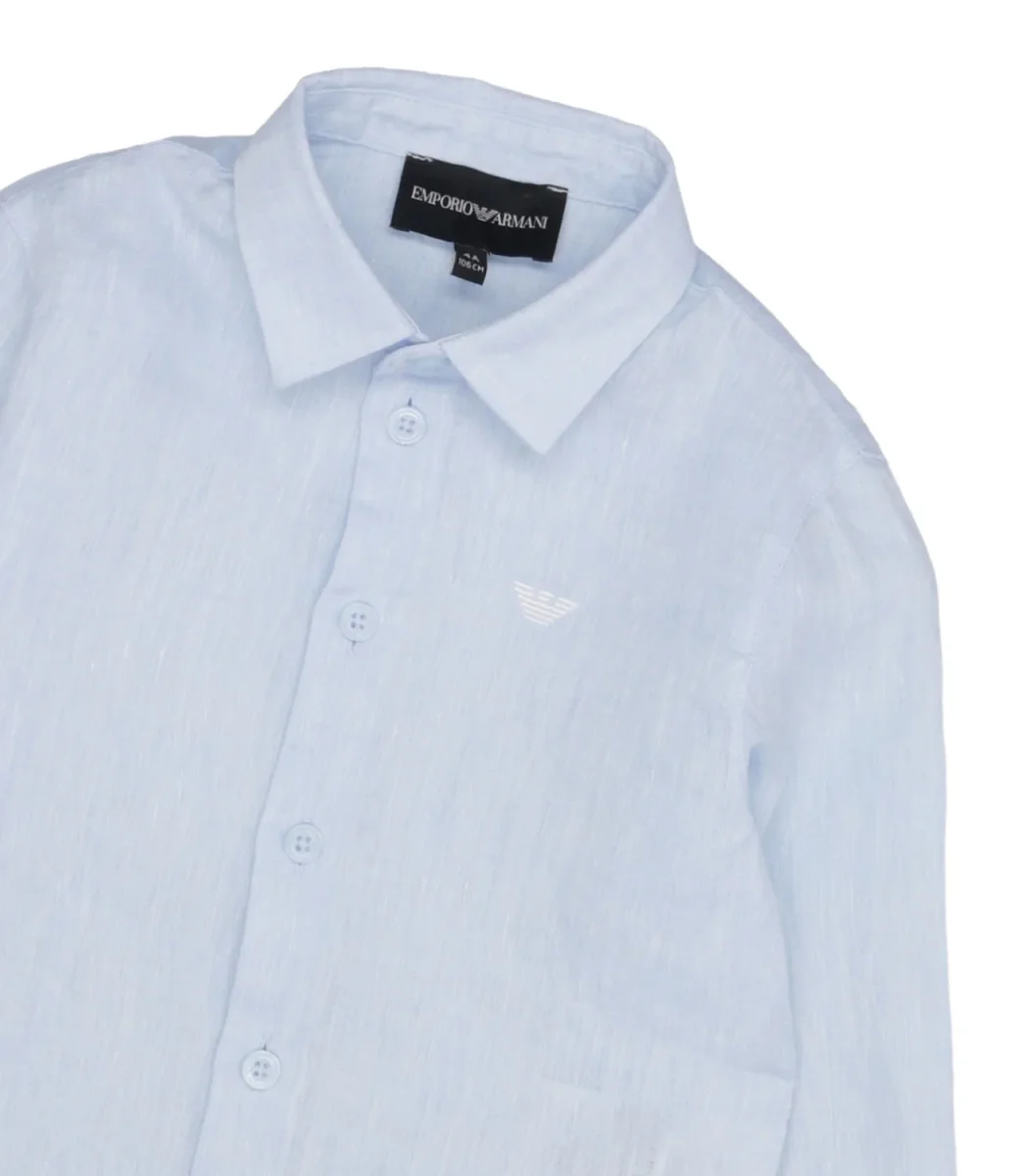 Camicia Emporio Armani Junior in lino azzurro, con collo italiano, chiusura frontale integrale con bottoni, maniche lunghe con polsini con doppio bottone, fondo stondato, regular fit, logo ricamato sul lato sinistro del torace.