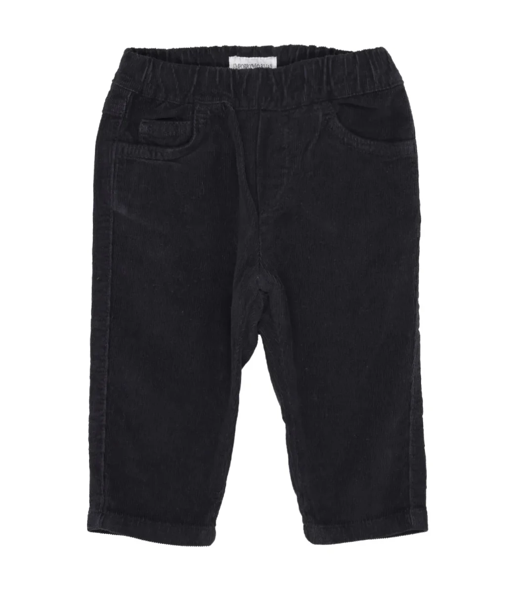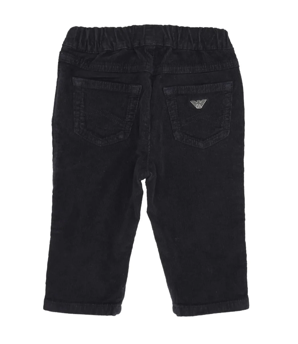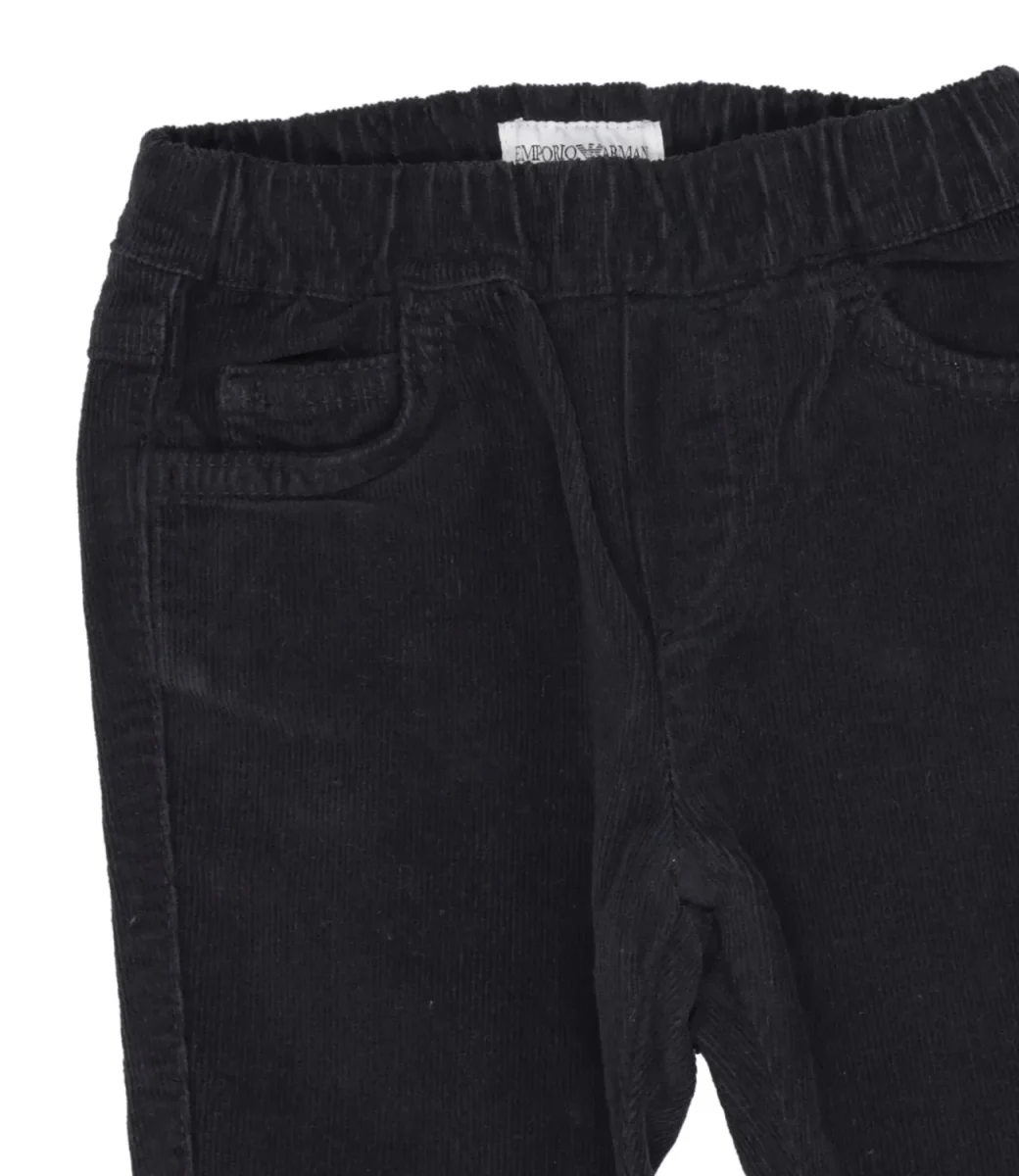 Pantalone Emporio Armani Junior in velluto di cotone, modello cinque tasche, vita elasticizzata, iconico logo in metallo applicato sulla tasca posteriore.