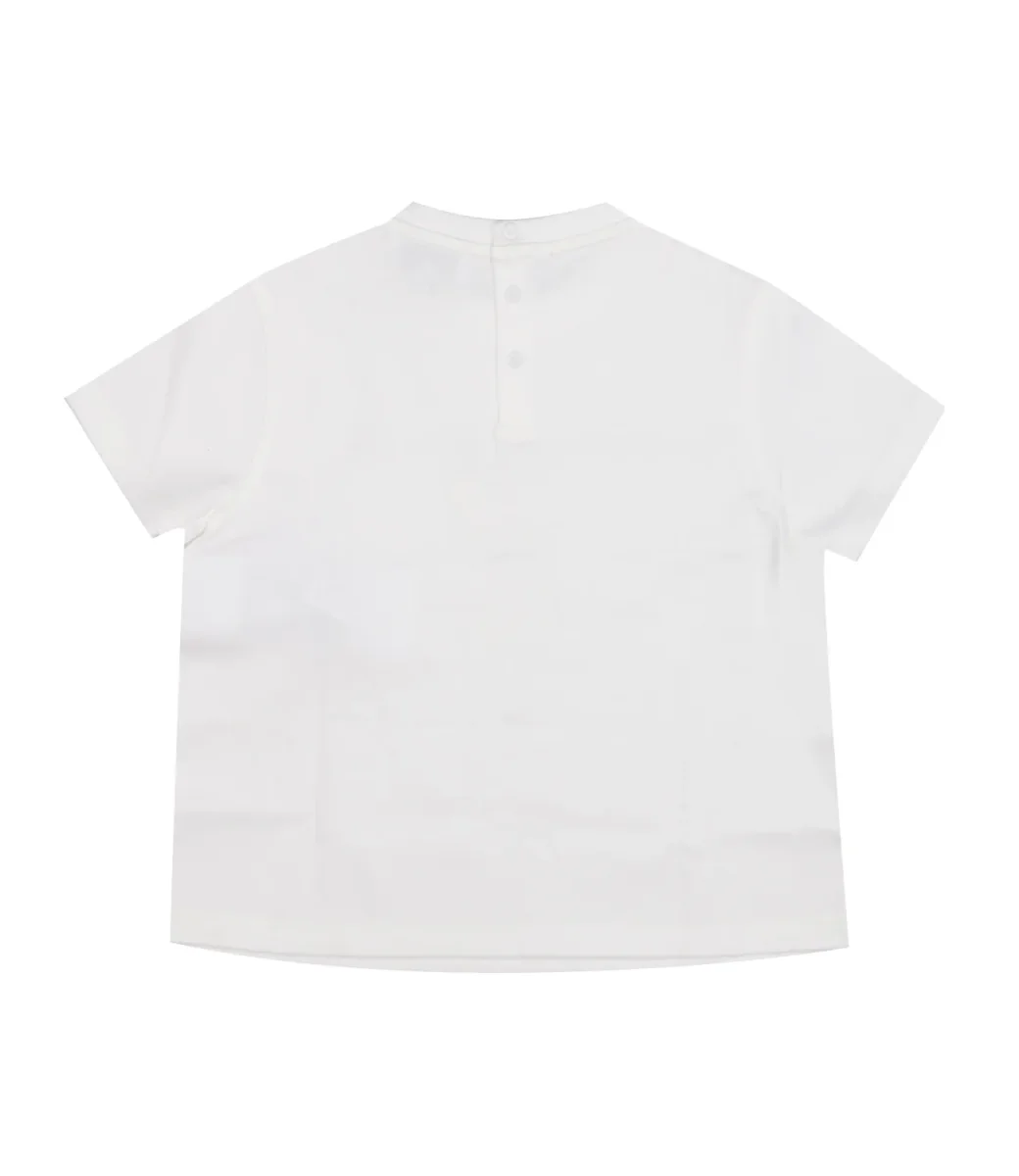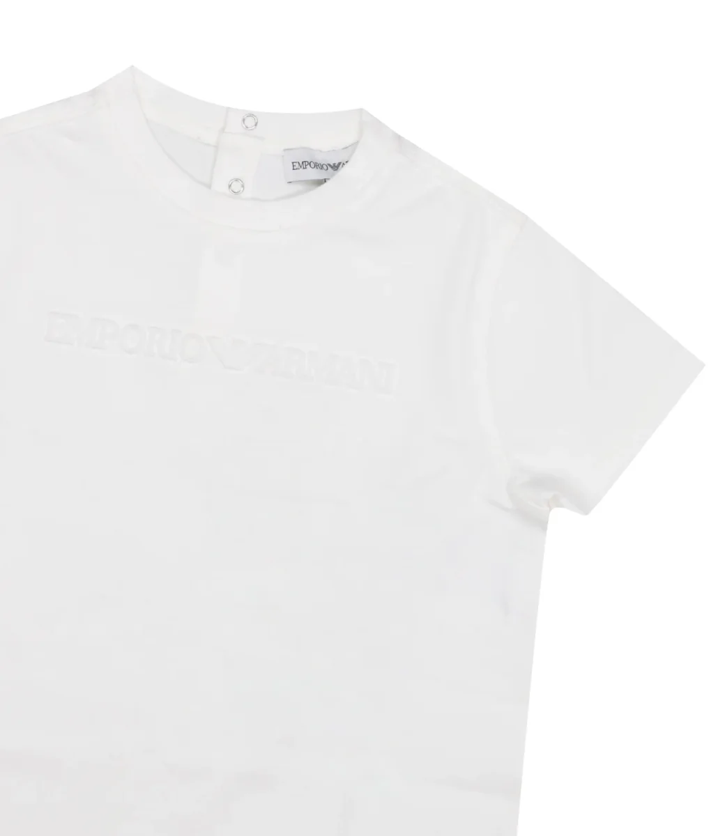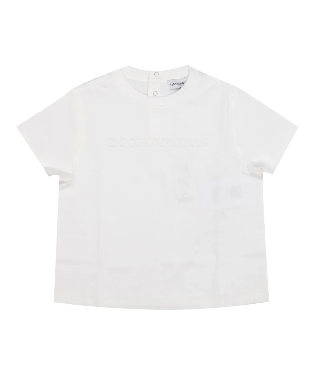 T-Shirt Emporio Armani Junior in cotone bianco, girocollo, maniche corte, chiusura sul retro del collo con bottoncini automatici tono su tono, orlo dritto.