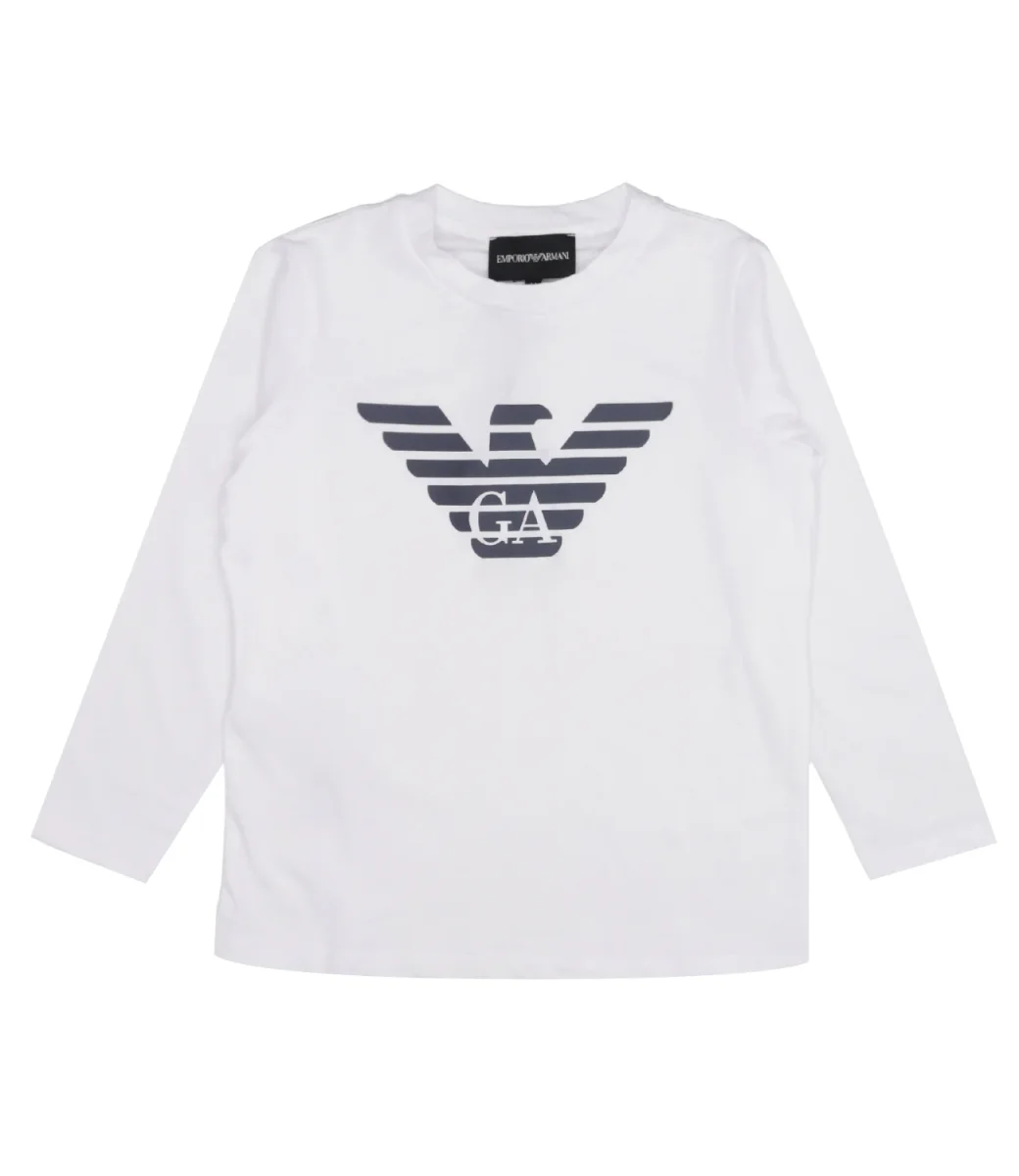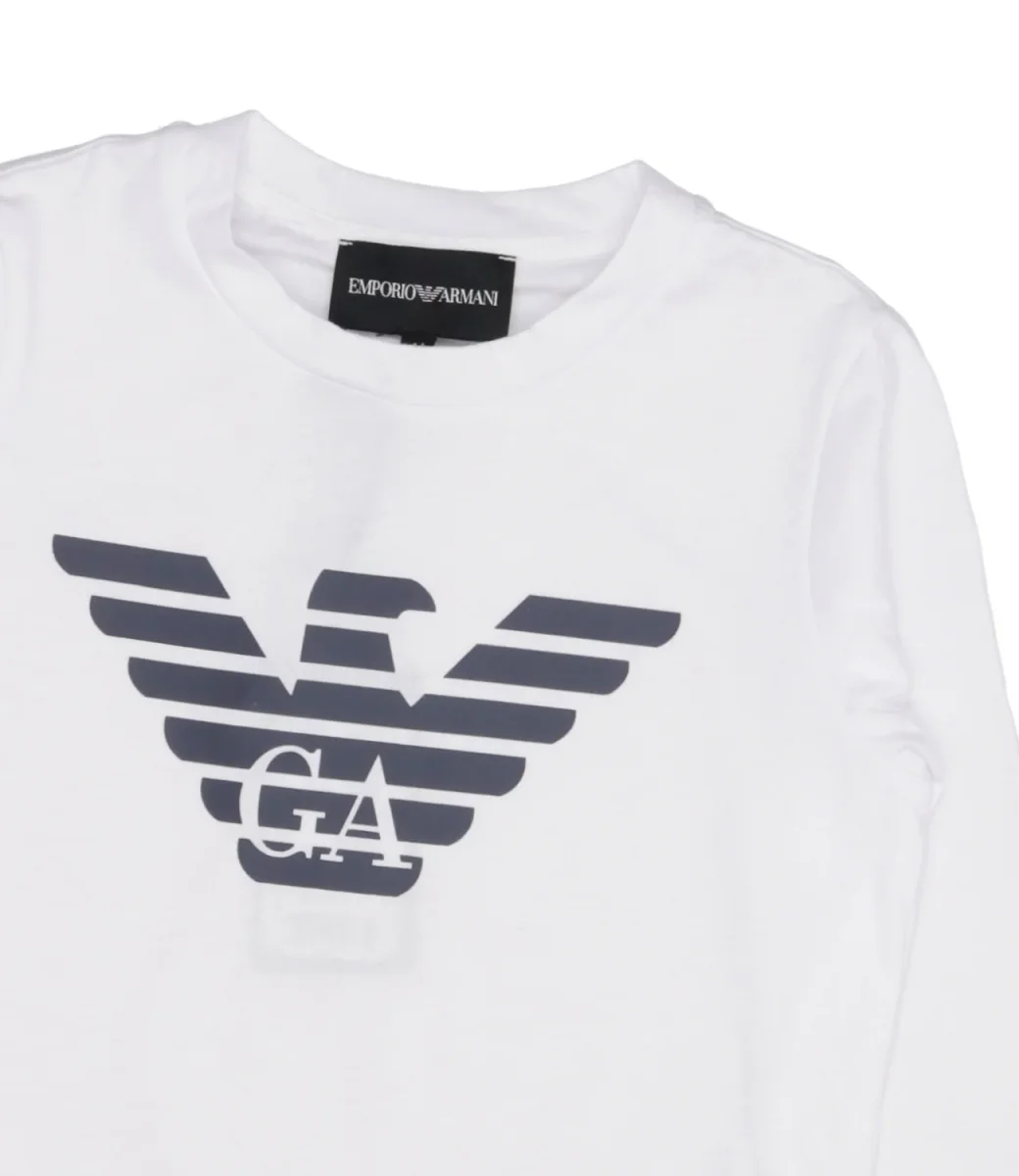 T-Shirt Emporio Armani Junior in cotone, girocollo, maniche lunghe, stampa maxi logo sul torace, fondo dritto.