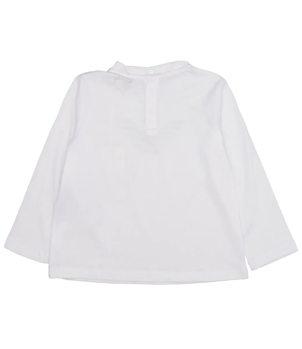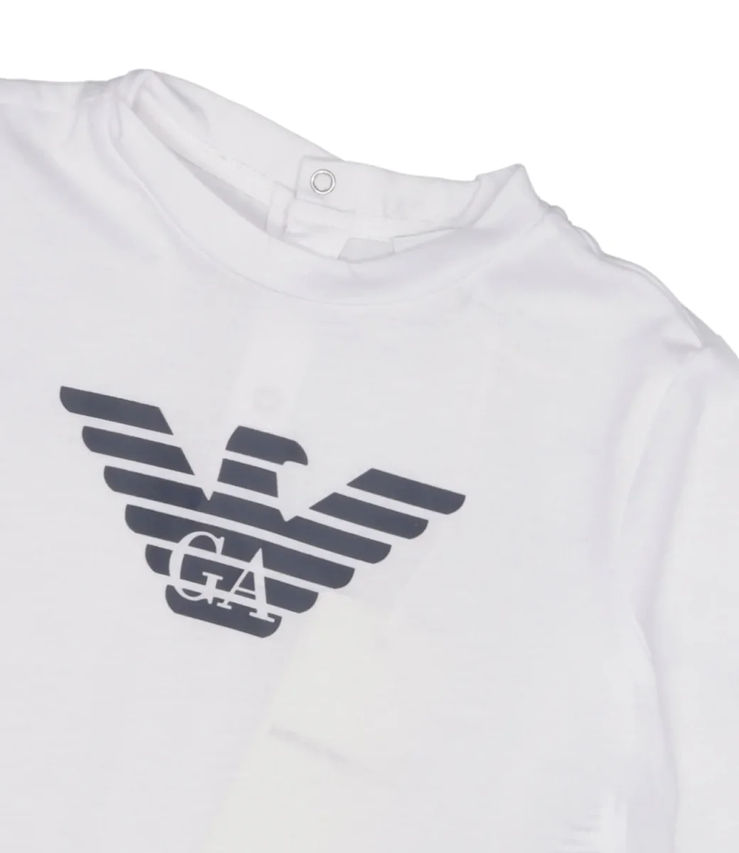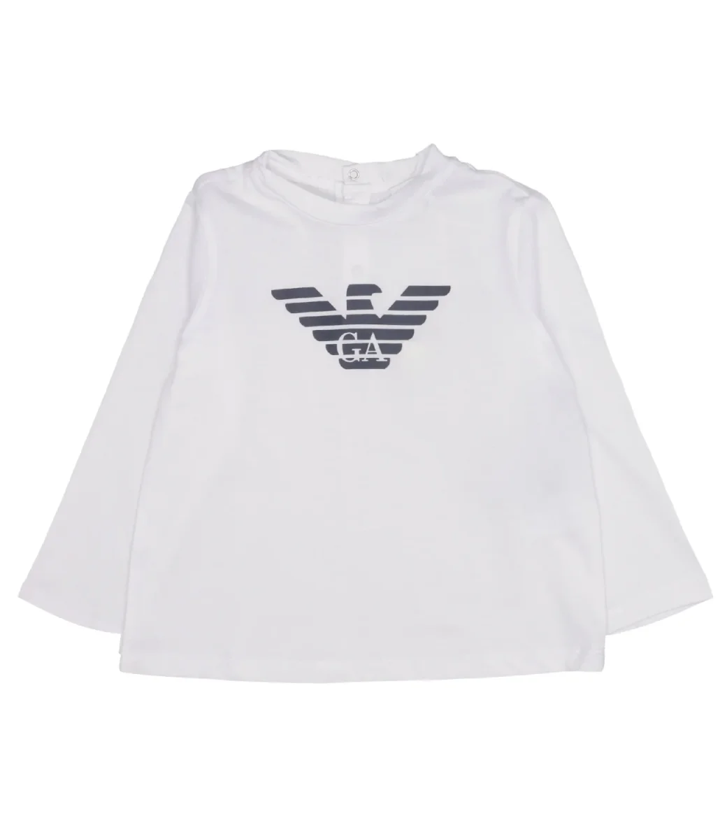 T-Shirt Emporio Armani Junior in cotone, girocollo, maniche lunghe, stampa maxi logo sul torace, chiusura posteriore con bottoni automatici, fondo dritto.