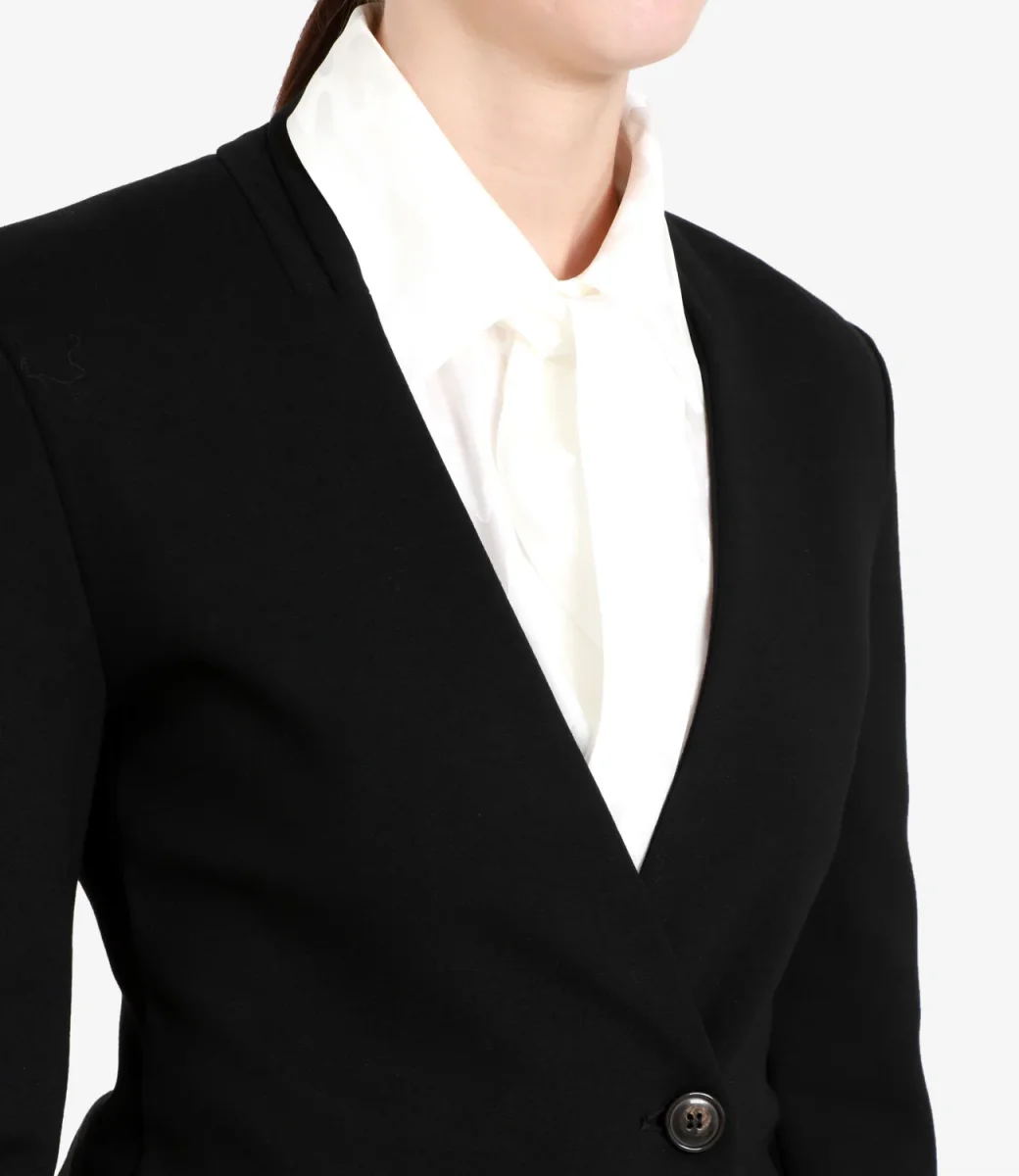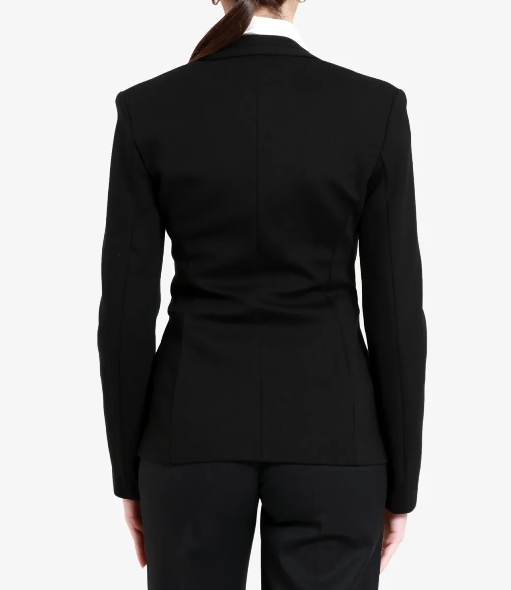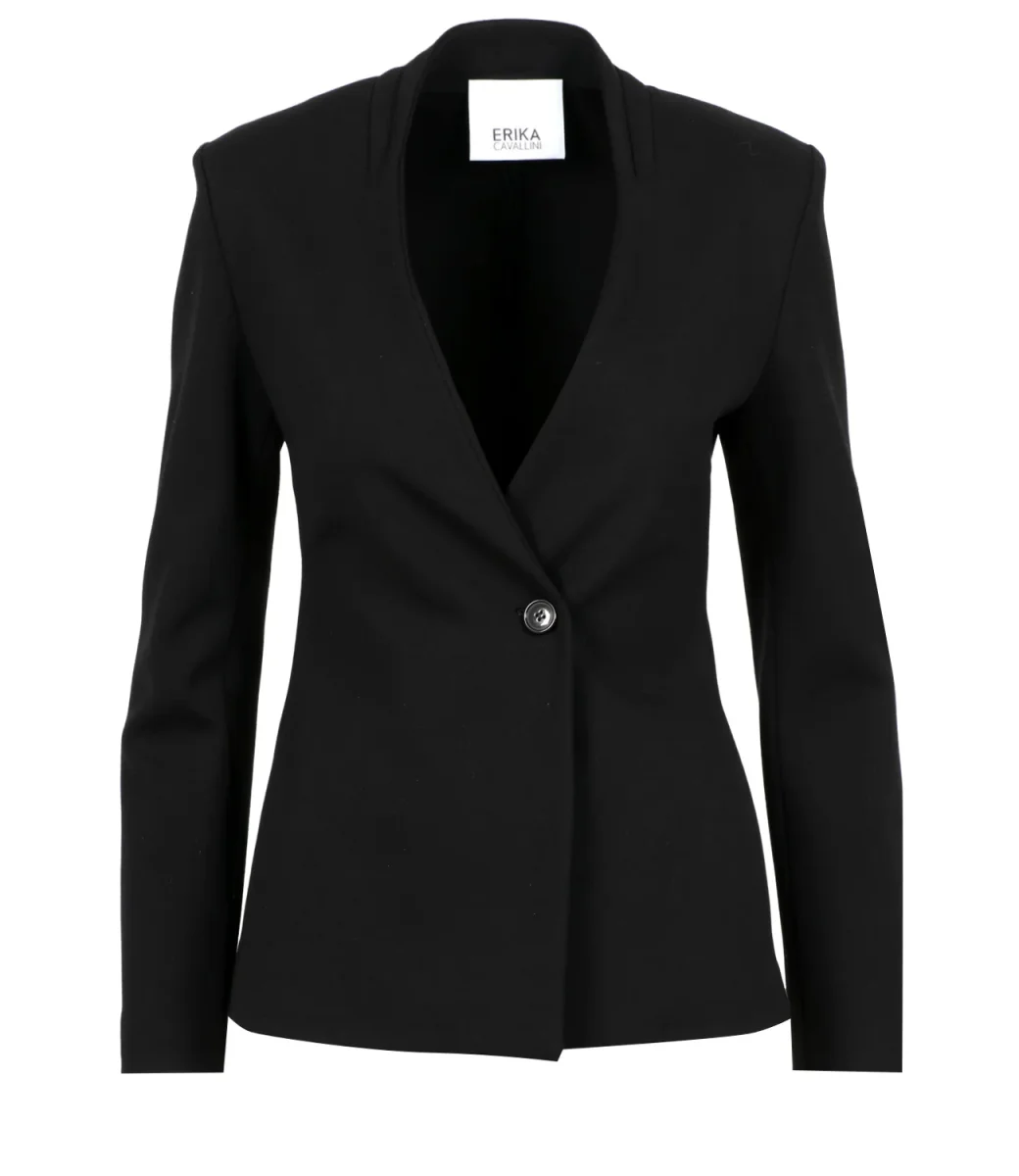 Giacca Erika Cavallini Silvia, modello aderente in punto milano double dal profondo scollo a V e spalle imbottite. Chiusura monopetto ad un bottone, manica lunga e orli dritti