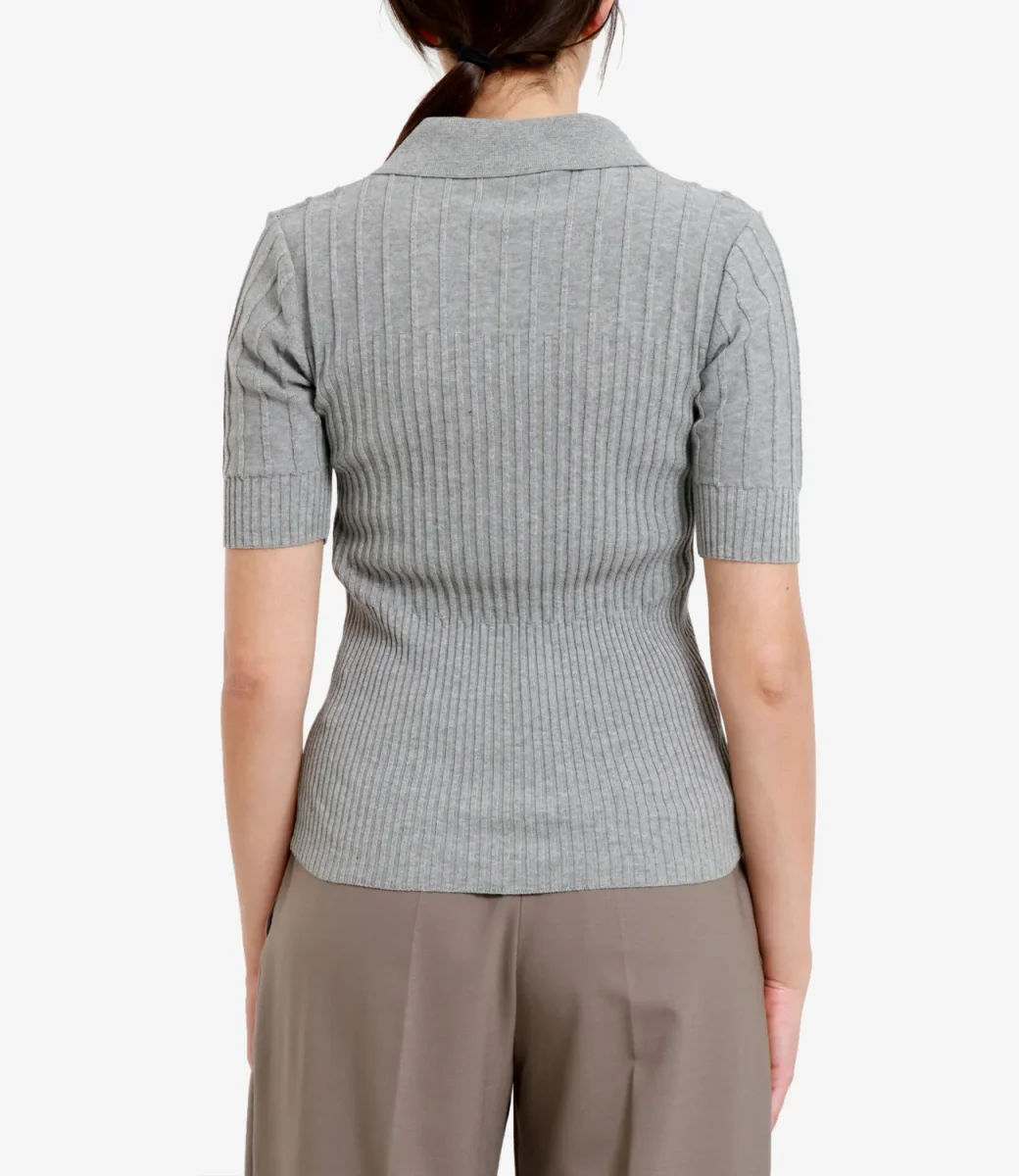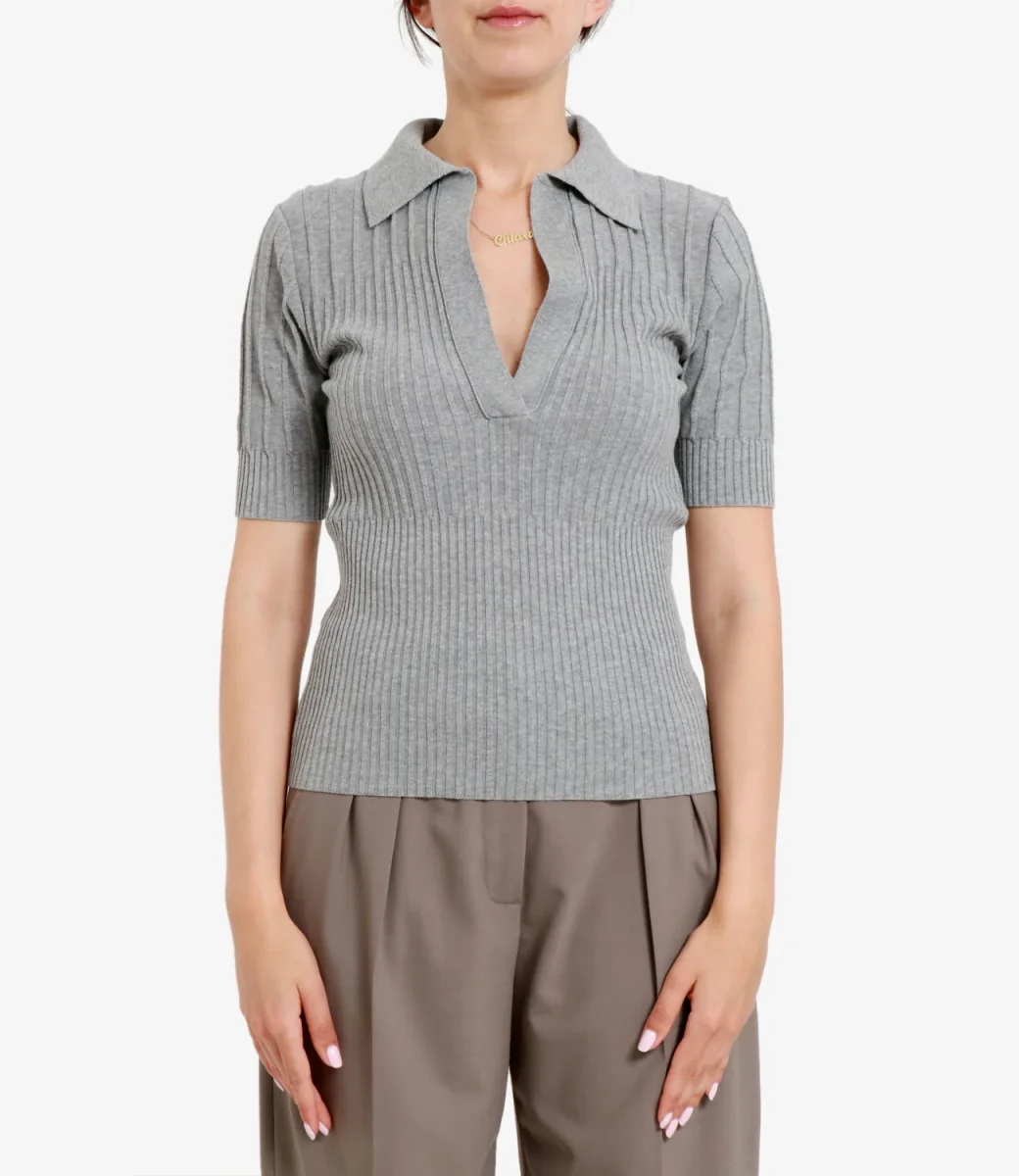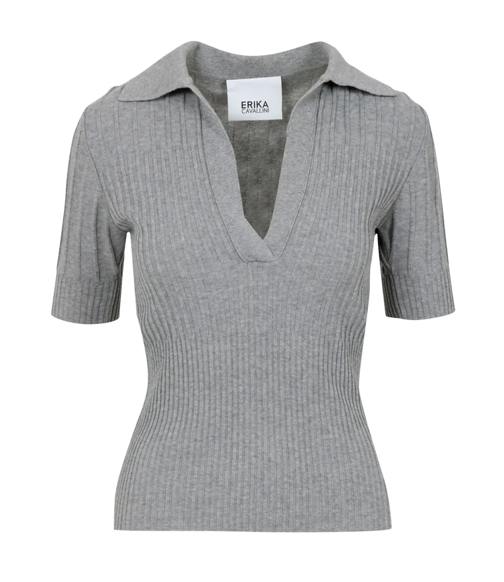 Polo Erika Cavallini Eleonora realizzato in cotone crapè con motivo a coste alternate, scollo a V con collo largo a camicia con manica corta e silhouette accostata al corpo.