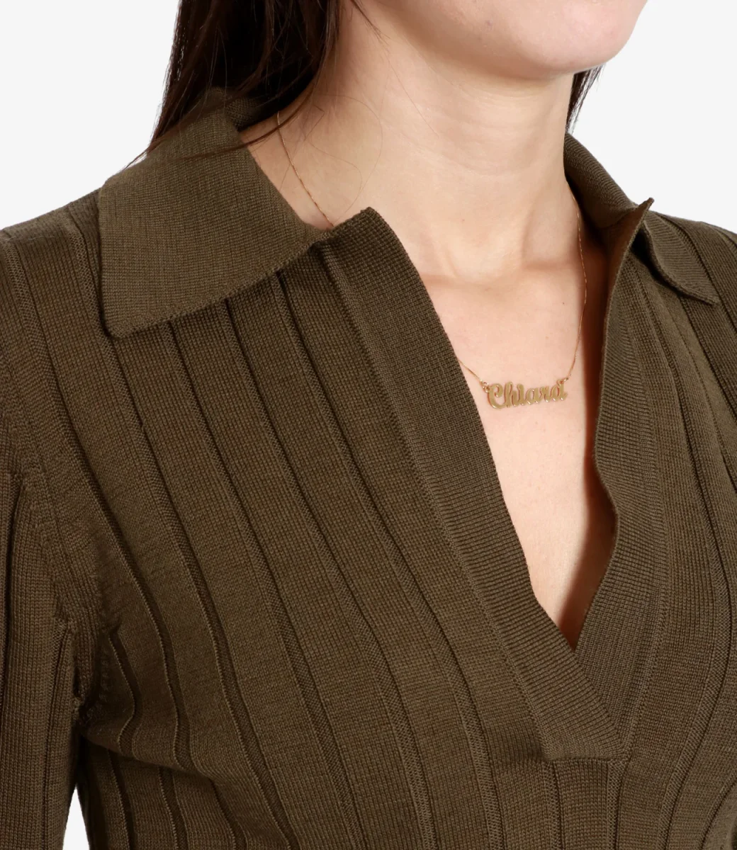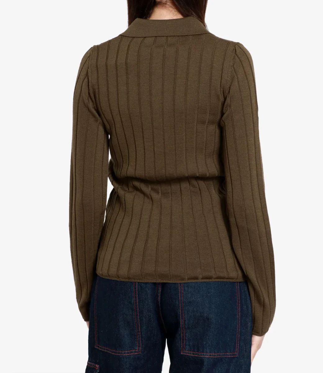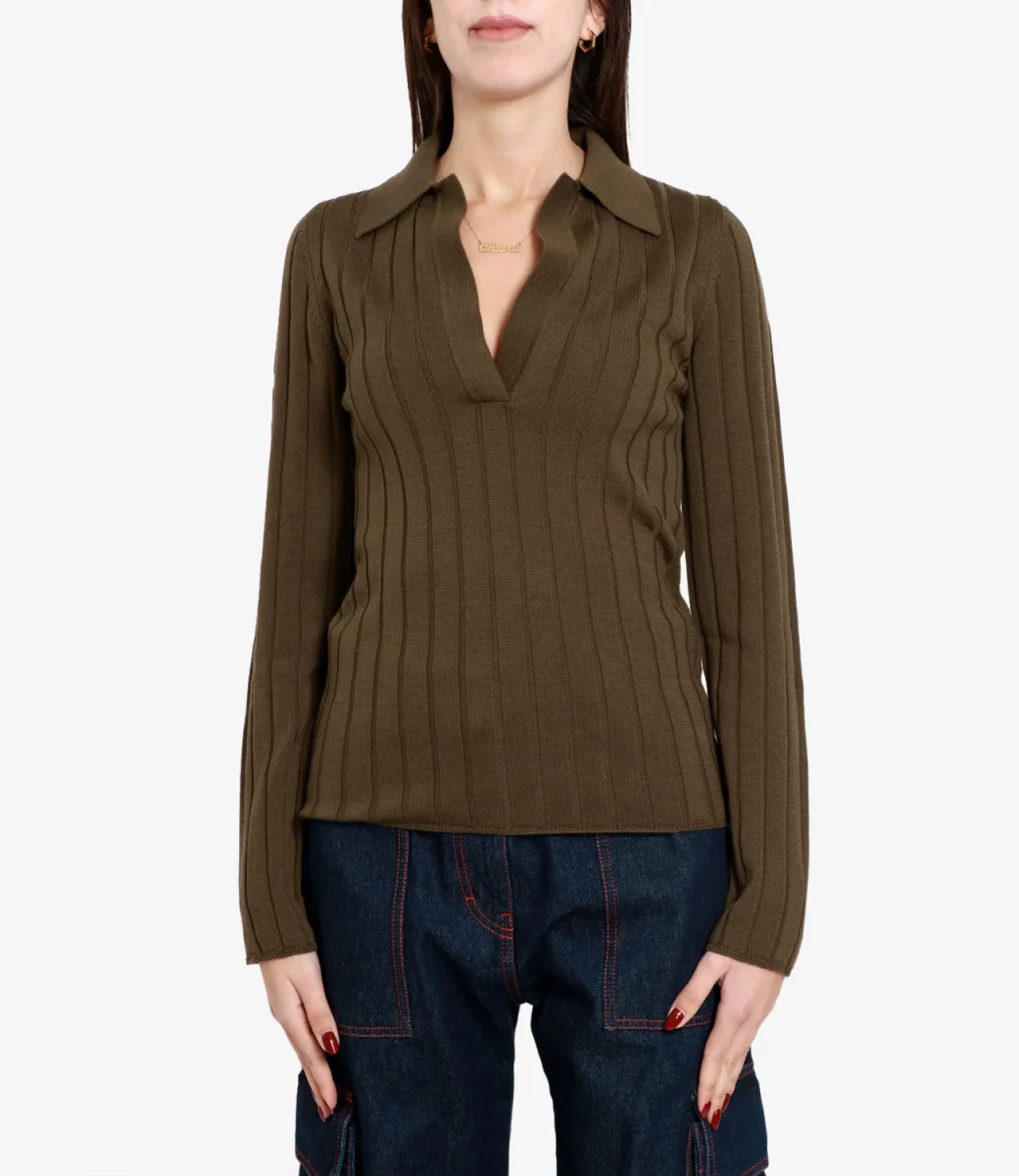 Polo Erika Cavallini modello Nora in 100% lana vergine a maniche lunghe e coste, colletto e scollo a v. La modella è alta 1.75m ed indossa una S.