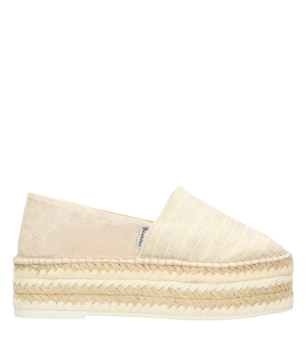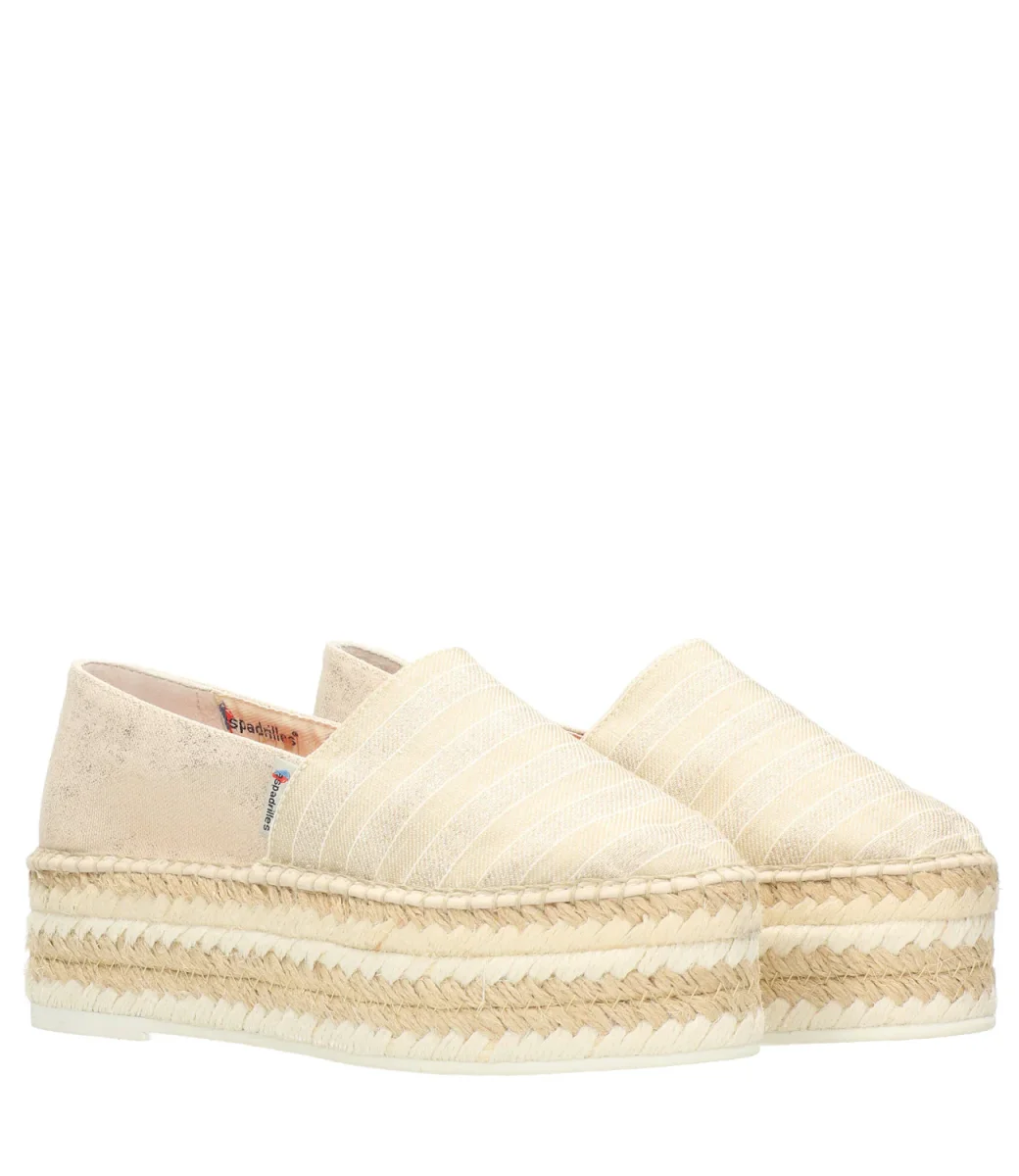 Dettagli:– Platform in corda-Punta in tela a righe -Suola in gomma