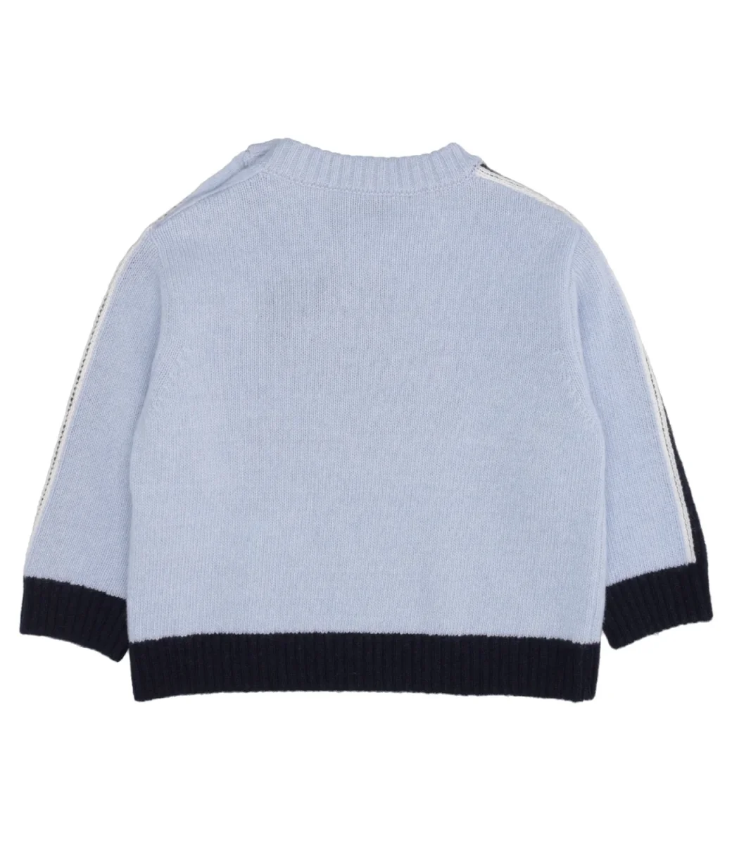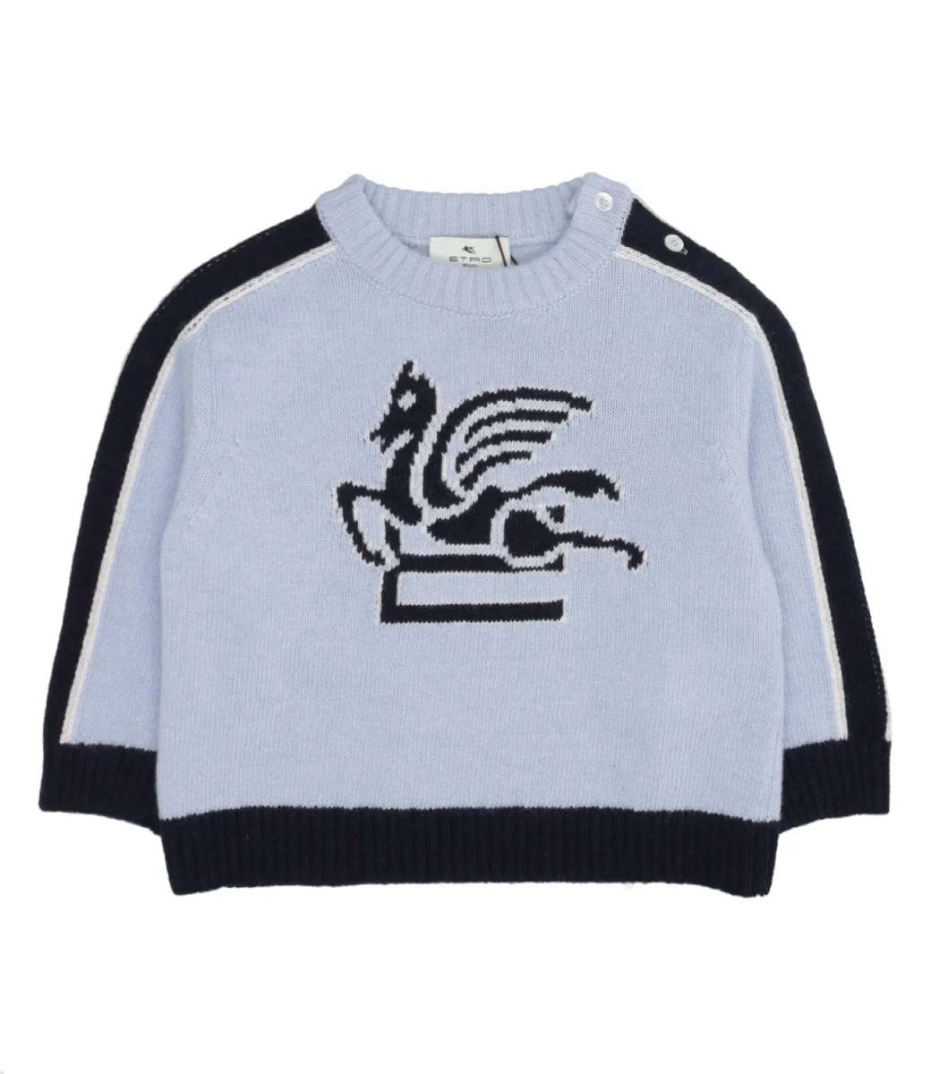 Maglia Etro Kids in lana e cashmere con dettagli bicolor, girocollo a costine, maniche lunghe con polsini a coste, logo intarsiato sul torace, chiusura sulla spalla sinitra con bottoni, bordo a costine.