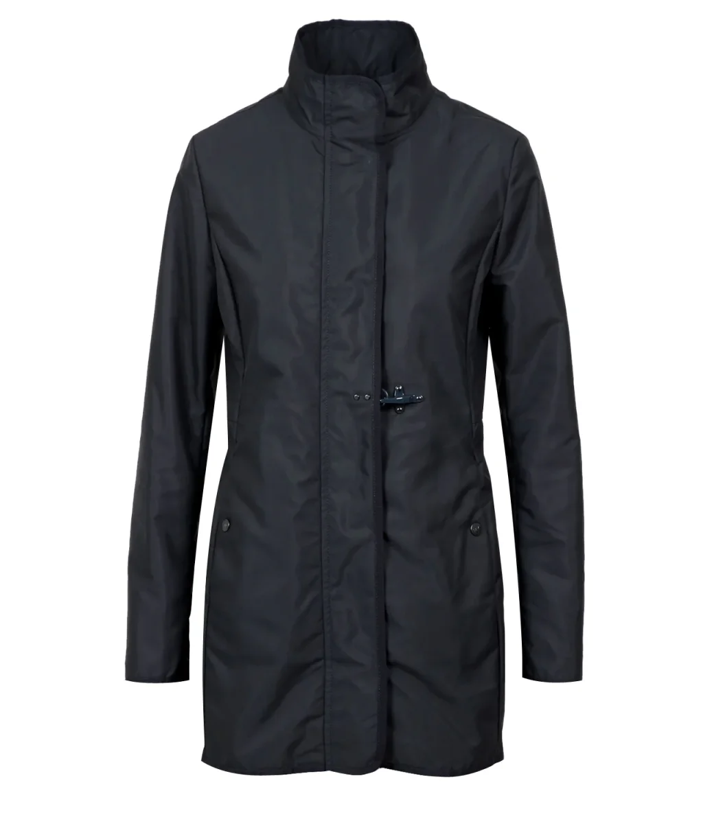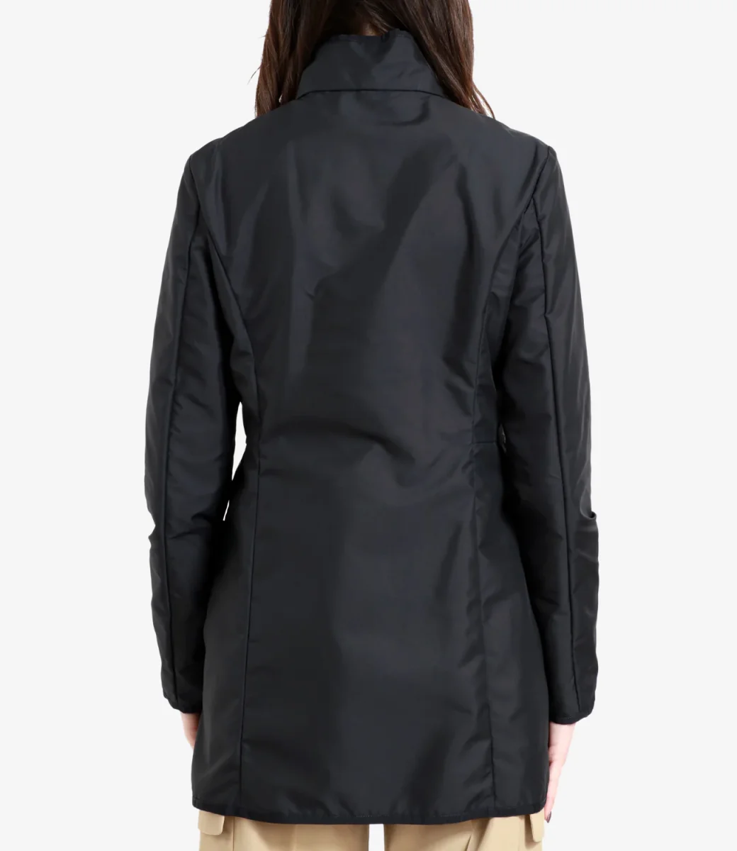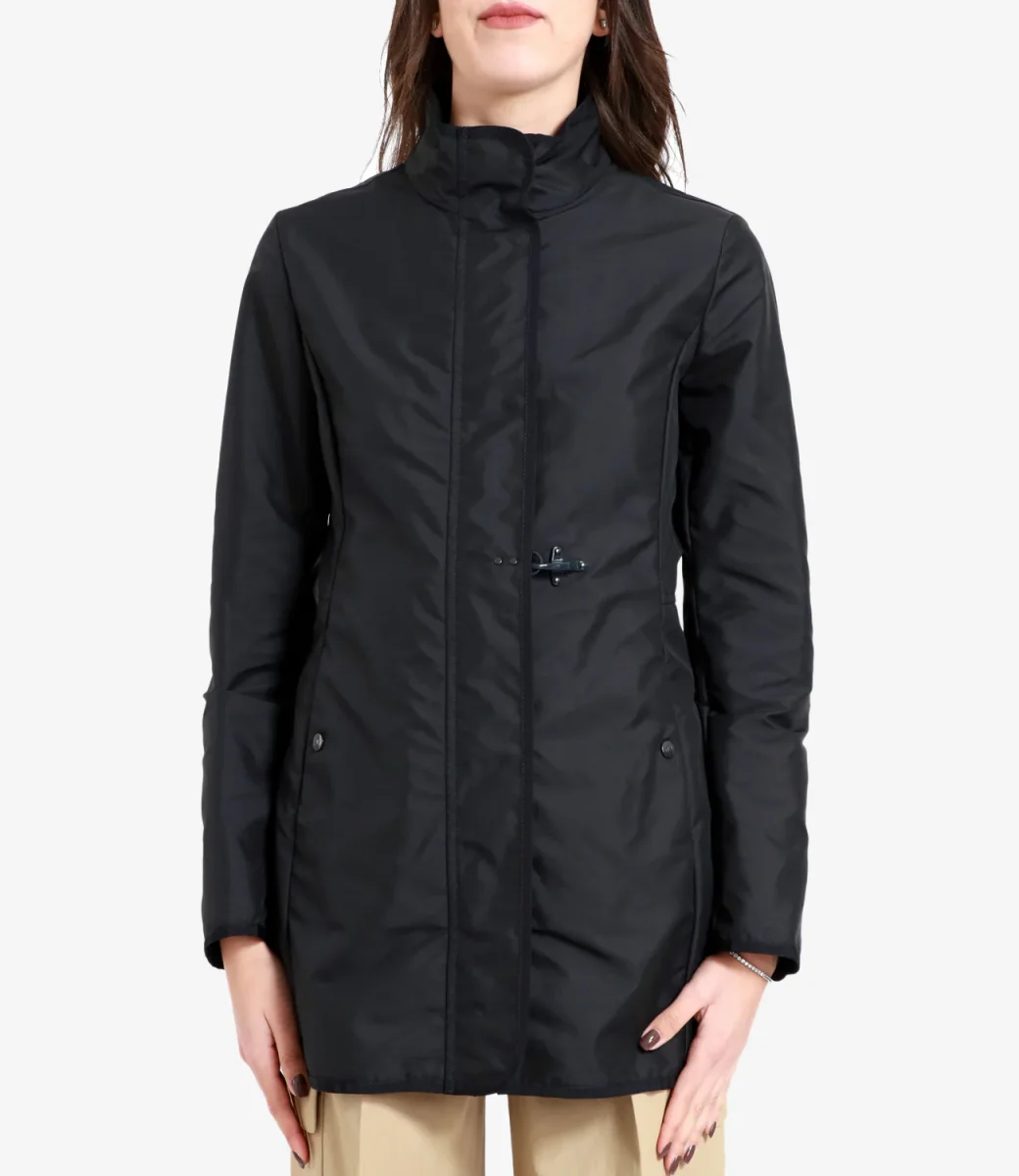 Impermeabile Fay modello Easy Virginia in nylon a collo alto e maniche lunghe, con chiusura frontale con zip e gancio e tasche frontali. La modella è alta 1.75m ed indossa una S.