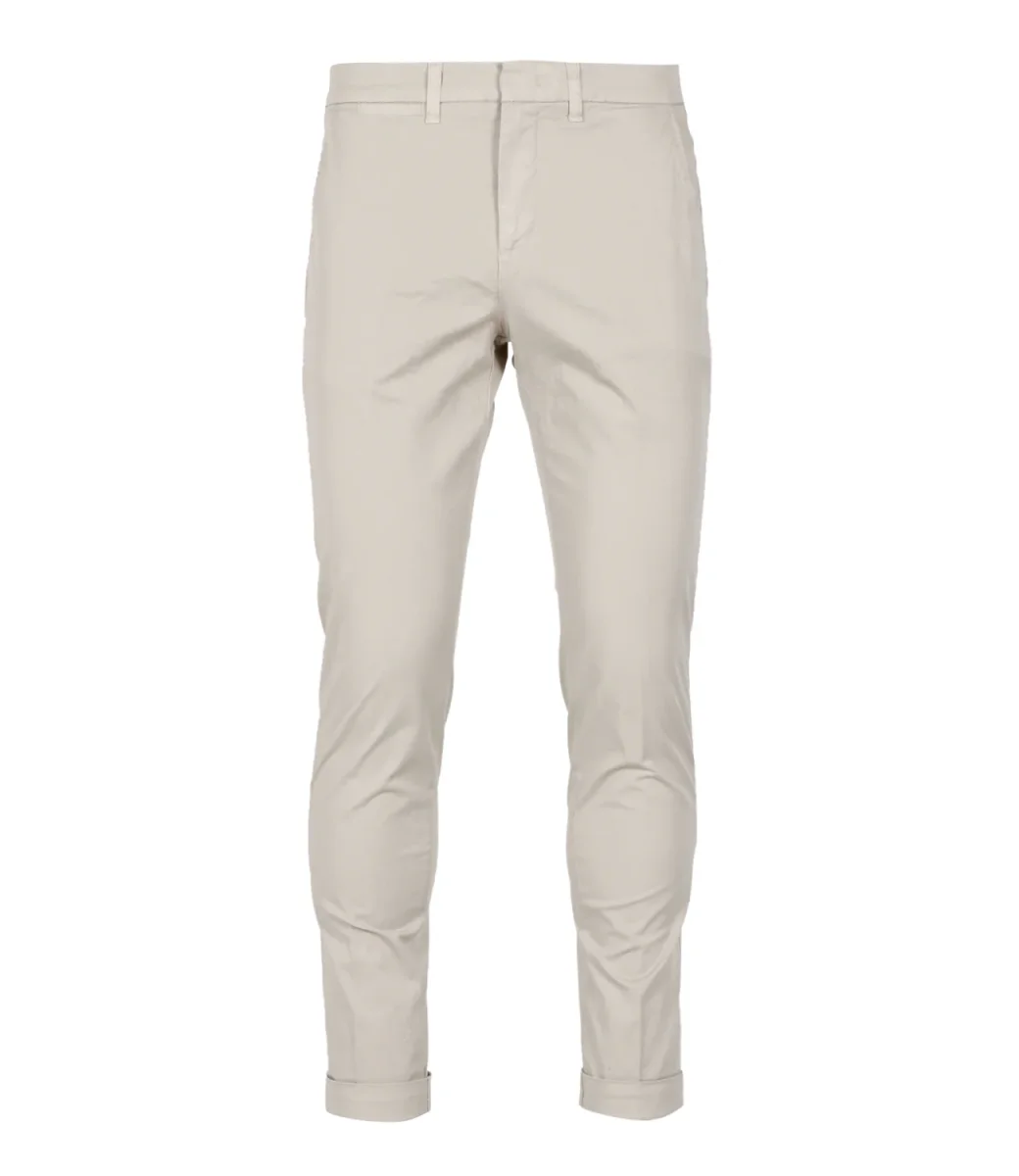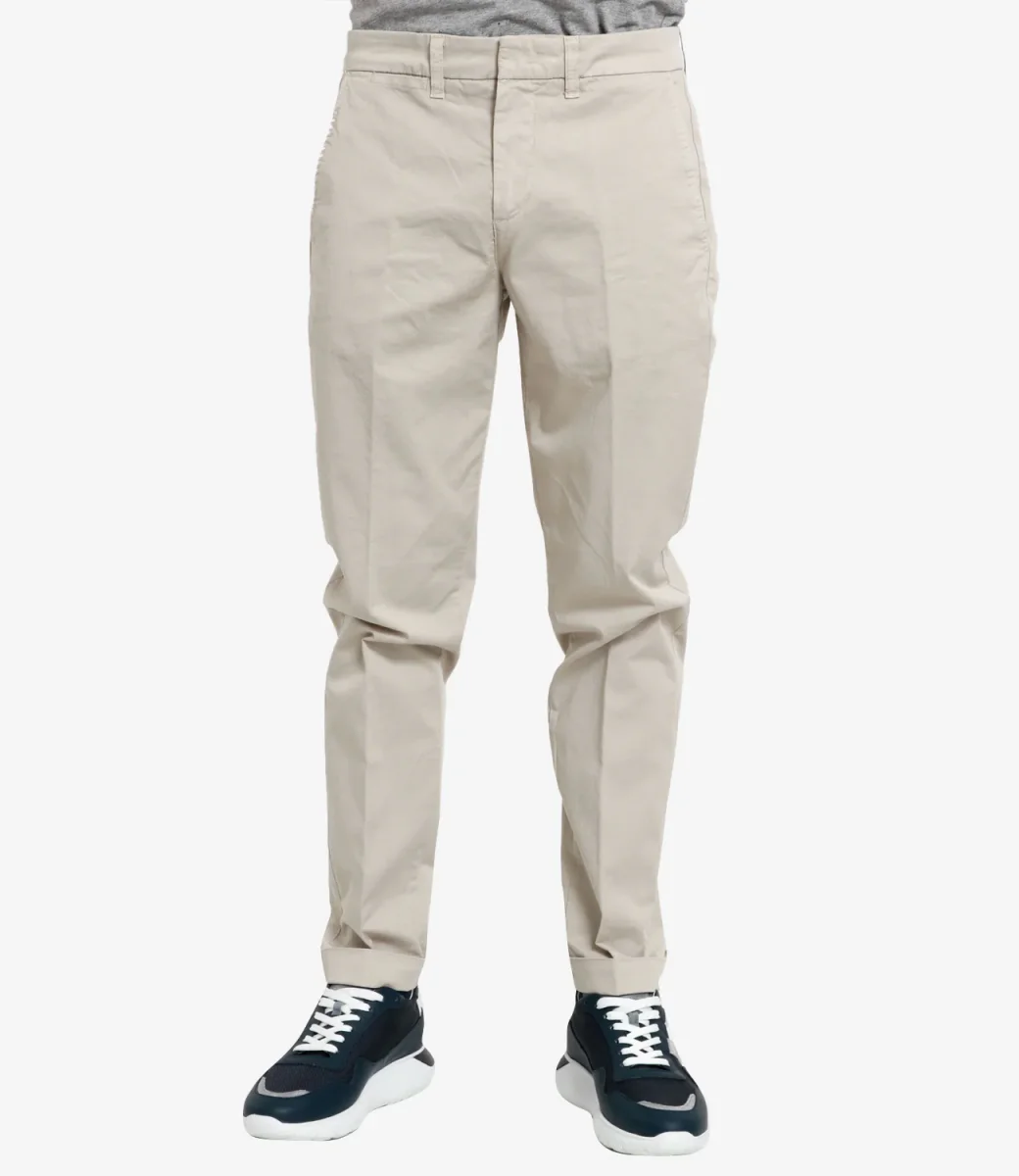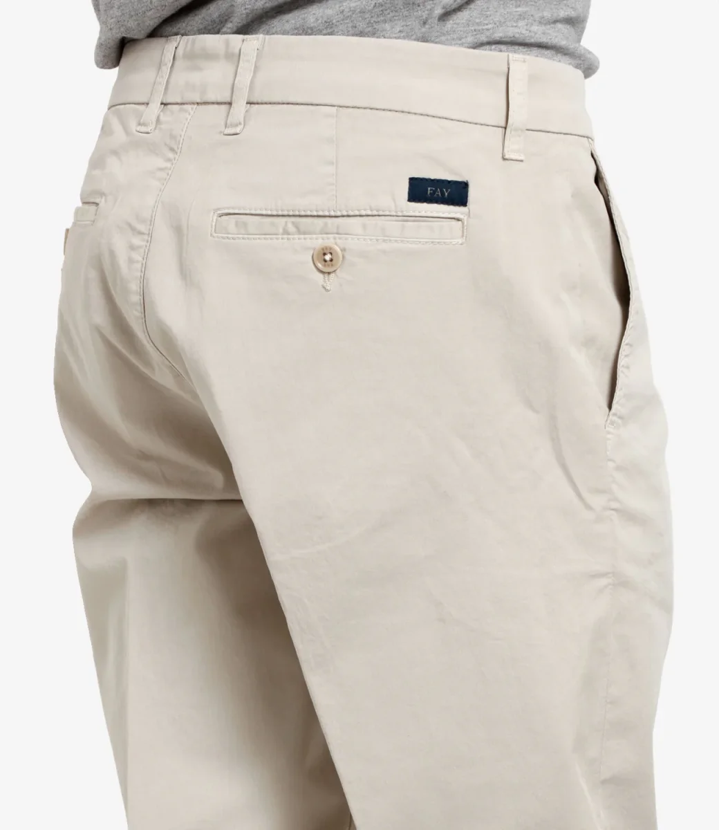 Pantalone Fay in cotone con vita regolare, chiusura con bottone e zip, tasche frontali e posteriori e gamba a sigaretta. Il modello è alto 1.75m ed indossa una 42.