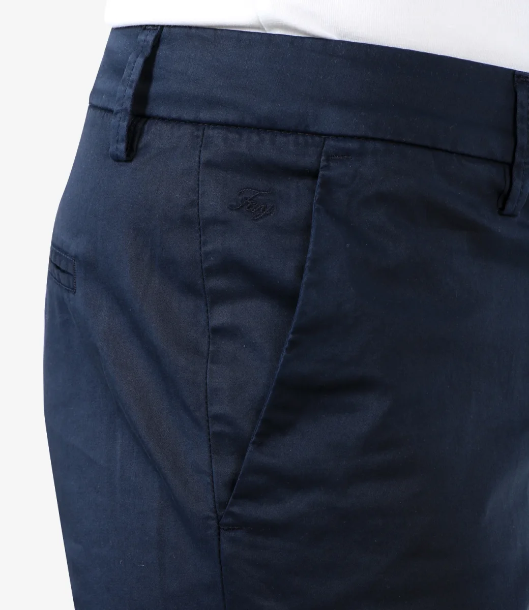 Pantalone Fay capri realizzato in raso stretch tinto in capo con piega stirata e fondo risvoltato. Dotato di tasche anteriori diagonali e posteriori a filo, è arricchito dal ricamo Fay sul lato.