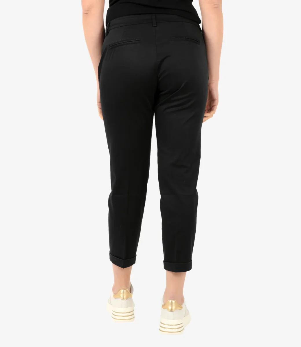 Pantalone Fay capri realizzato in raso stretch tinto in capo con piega stirata e fondo risvoltato. Dotato di tasche anteriori diagonali e posteriori a filo, è arricchito dal ricamo Fay sul lato.
