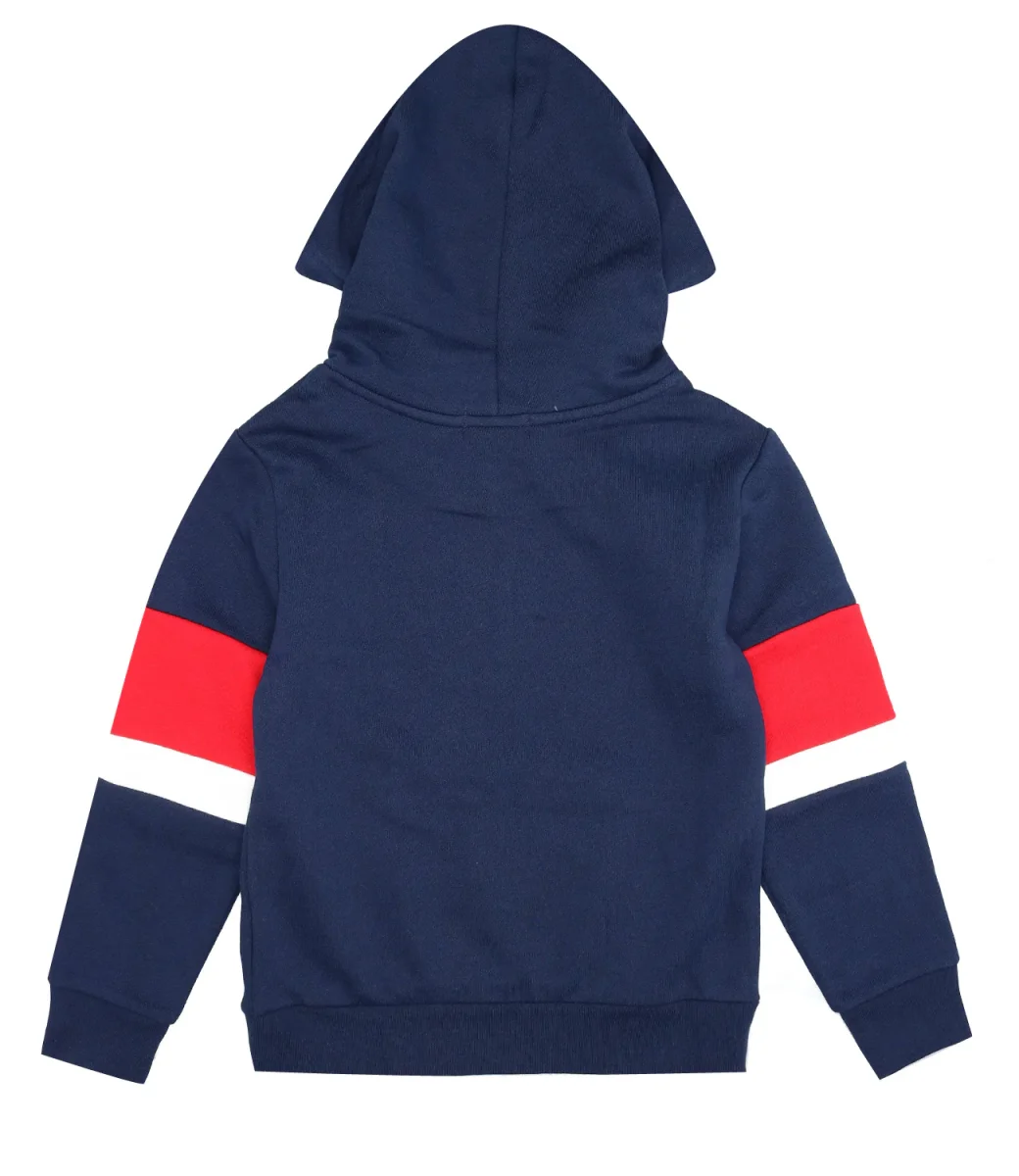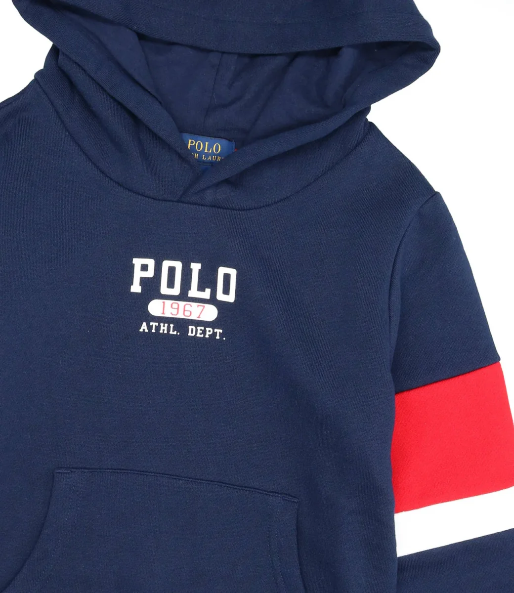 Felpa Ralph Laure in morbido misto cotone blu navy con cappuccio presenta maniche a righe, un logo di ispirazione atletica e l’iconico pony Polo.