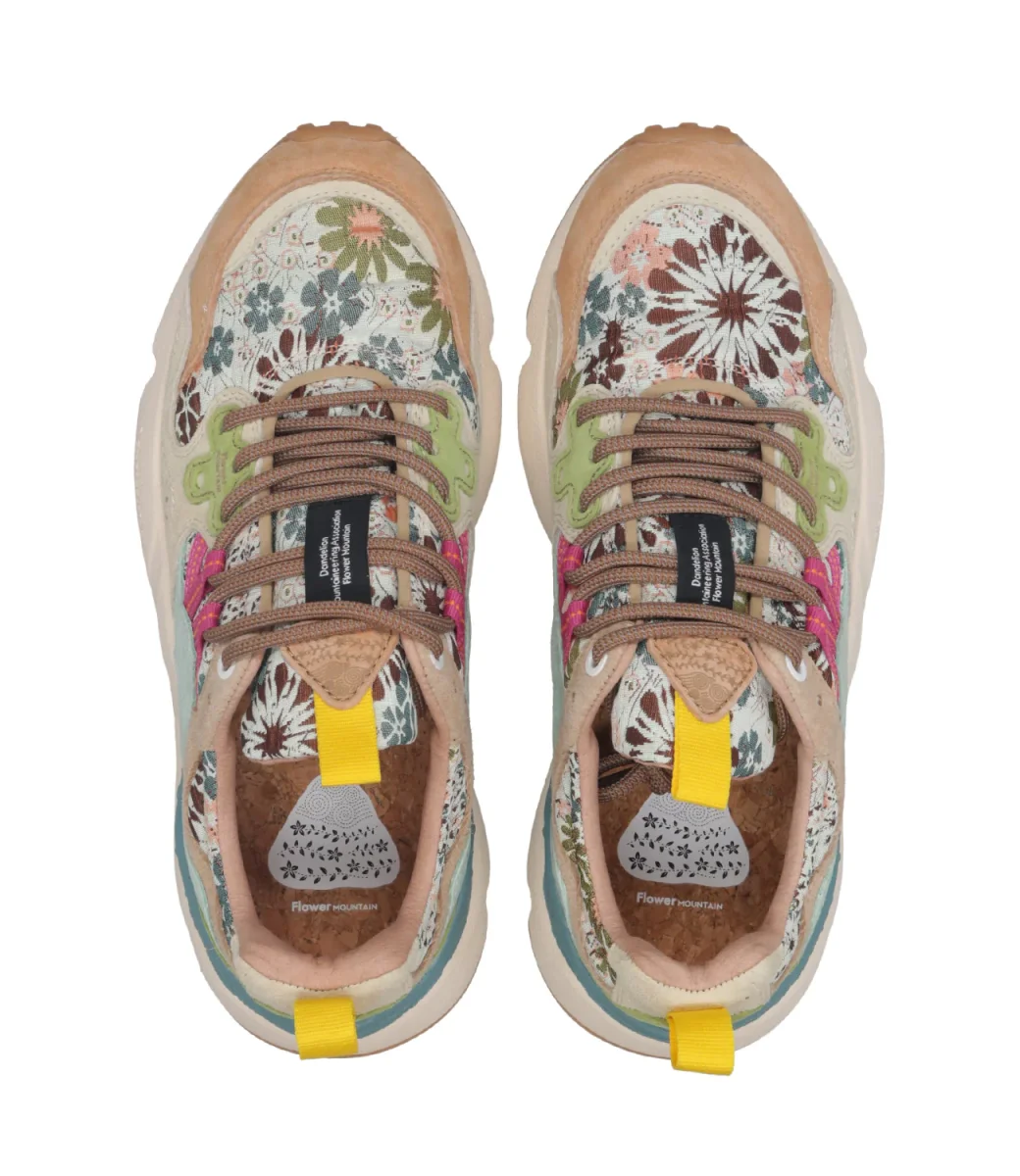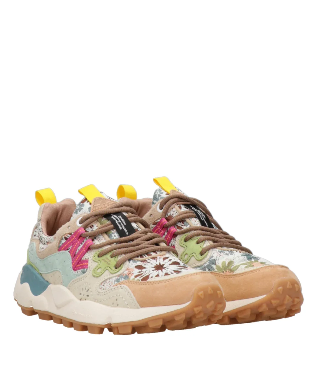 Sneakers Flower Mountain Yamano 3, modello basso, dalla tomaia in tessuto tecnico con caratteristici inserti in suede decorati e dall’iconico occhiello dalla forma sagomata. con suola in gomma ultra leggera, battistrada dentellato simile a medelli trecking. Soletta interna in sughero naturale antibatterico assicura benessere al piede e comfort all day long.
