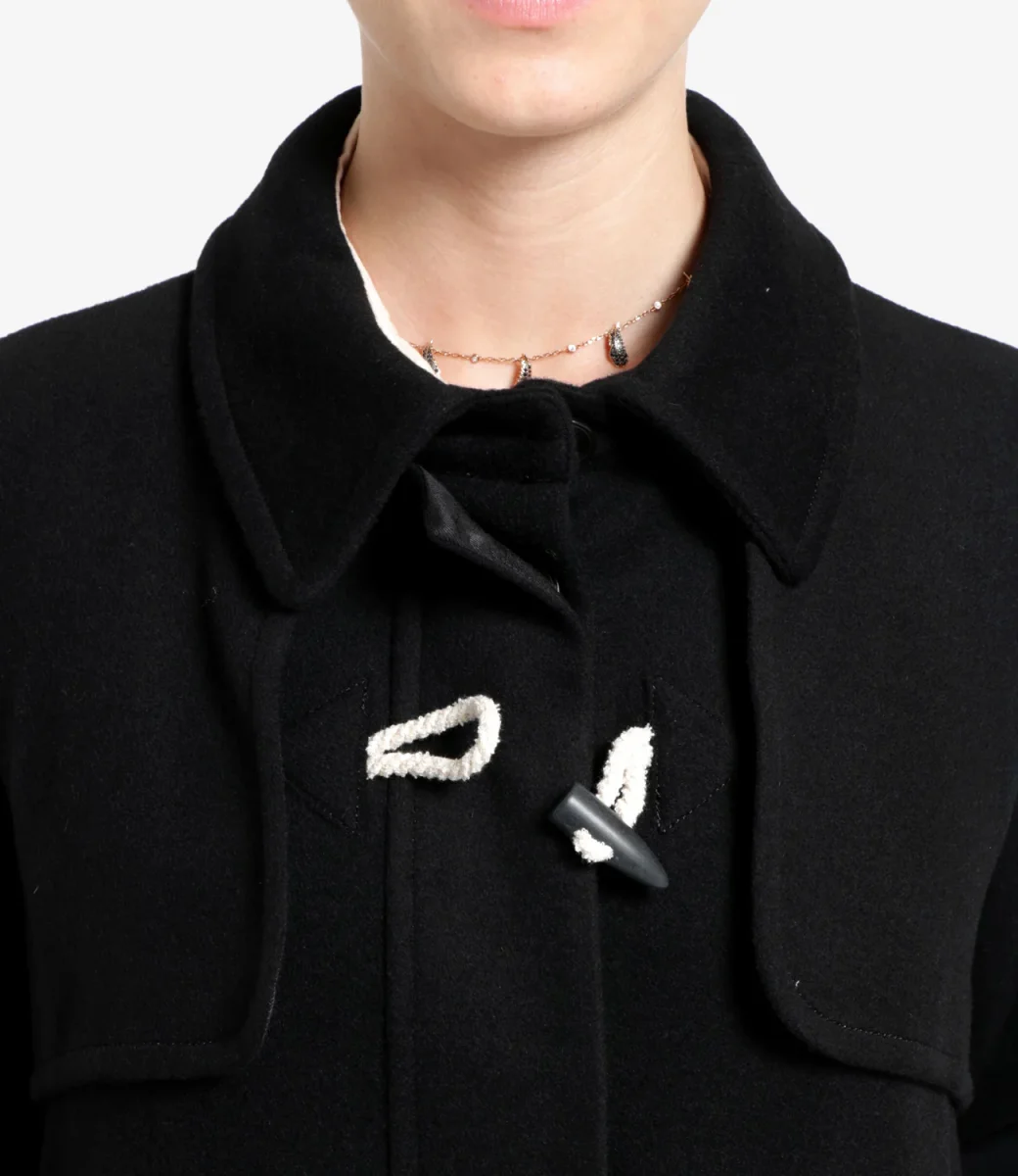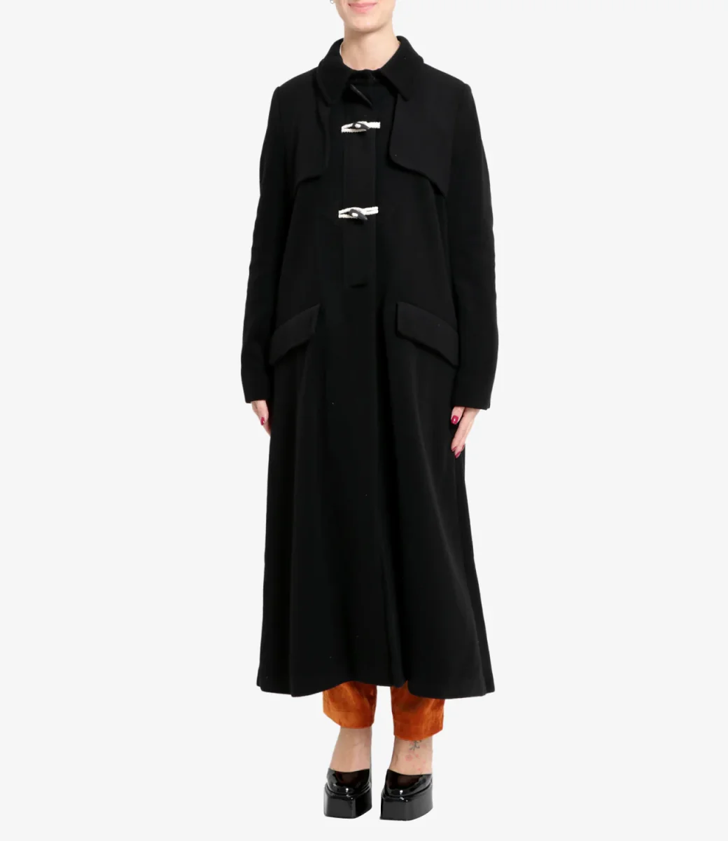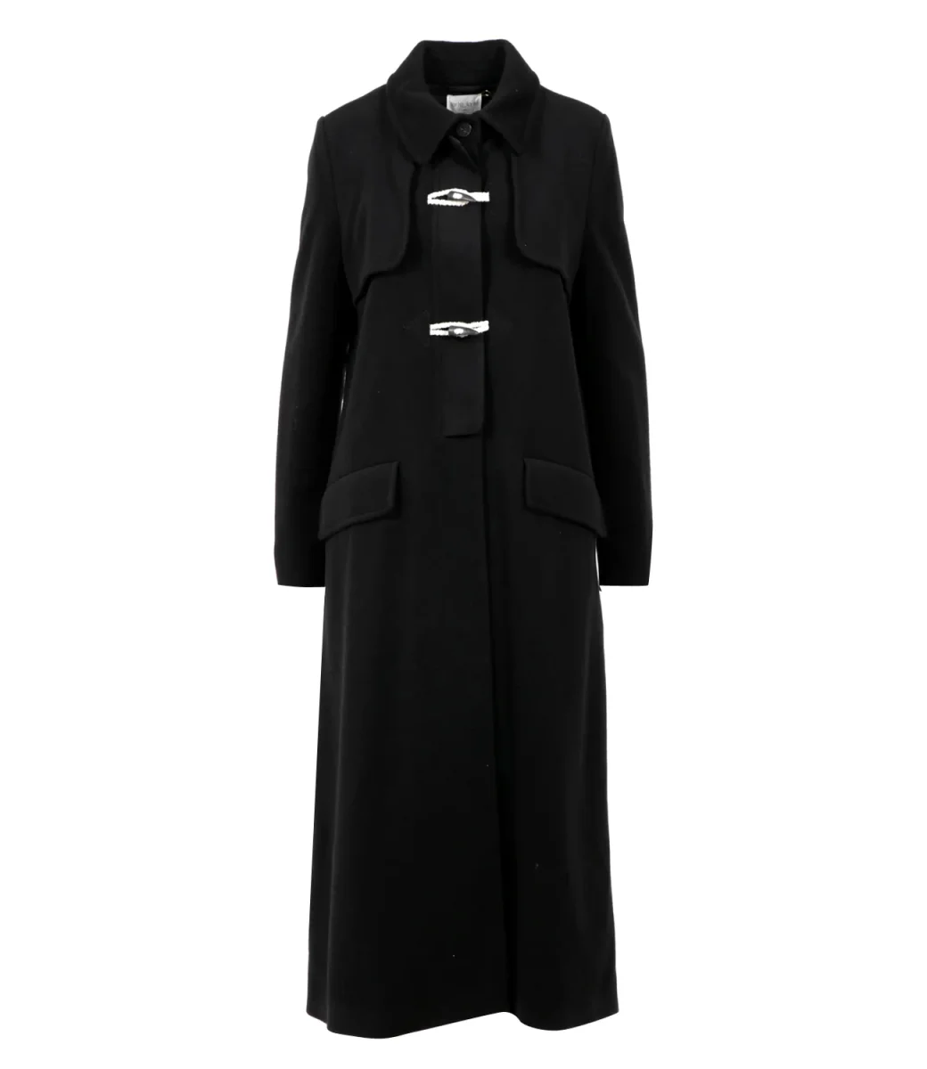 Cappotto lungo nero con colletto classico e chiusura frontale con alamari.