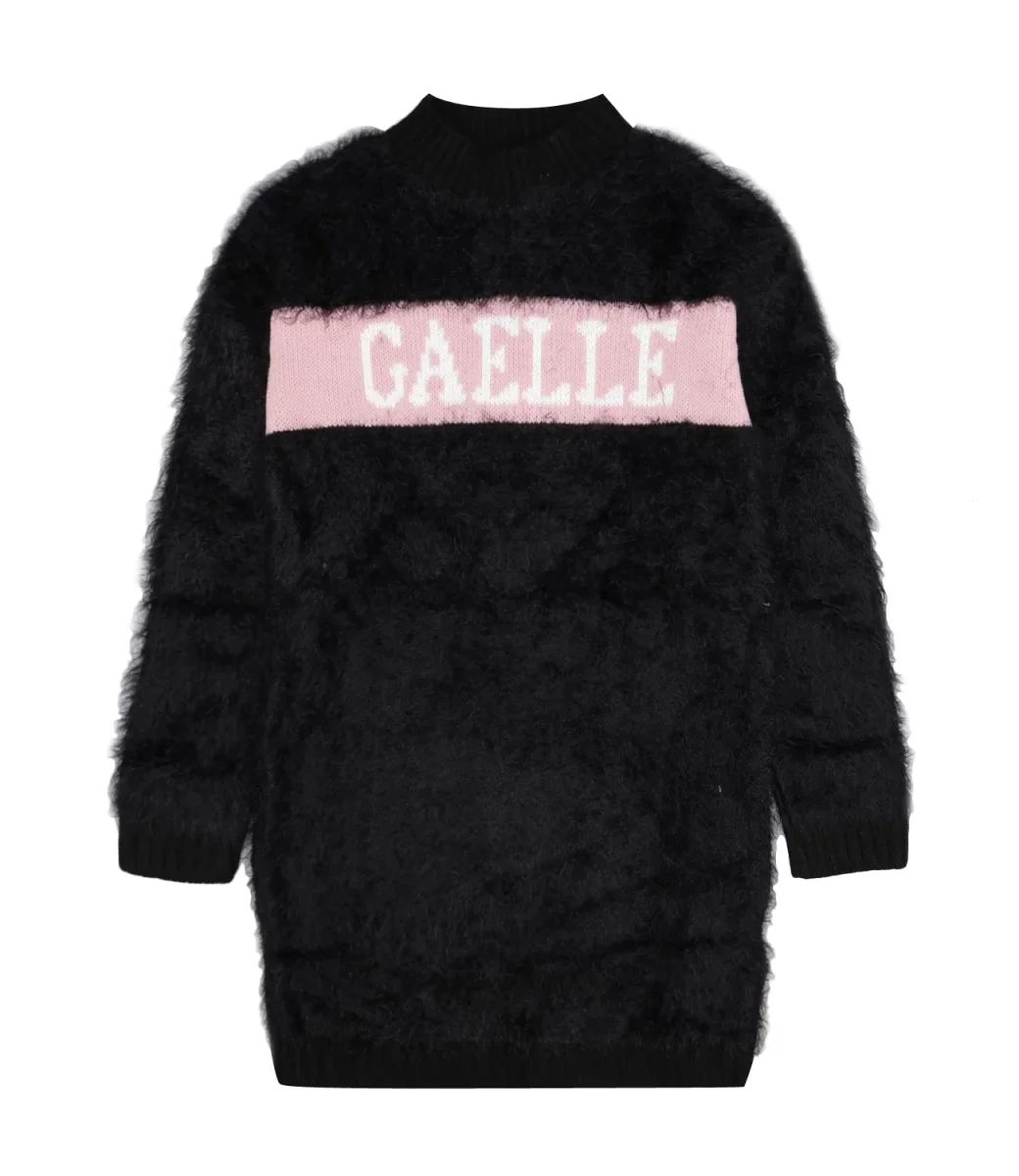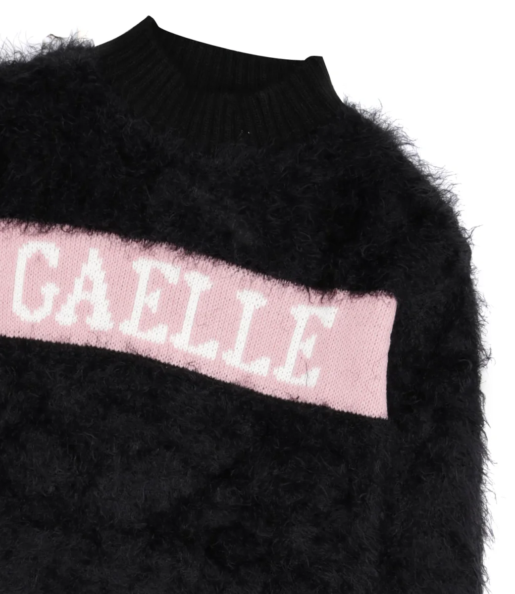 Abito Gaelle Paris Kids in ecopelliccia nero con collo lupetto a coste, stampa Gaelle sulla parte frontale, maniche lunghe, polsini e orlo a coste.