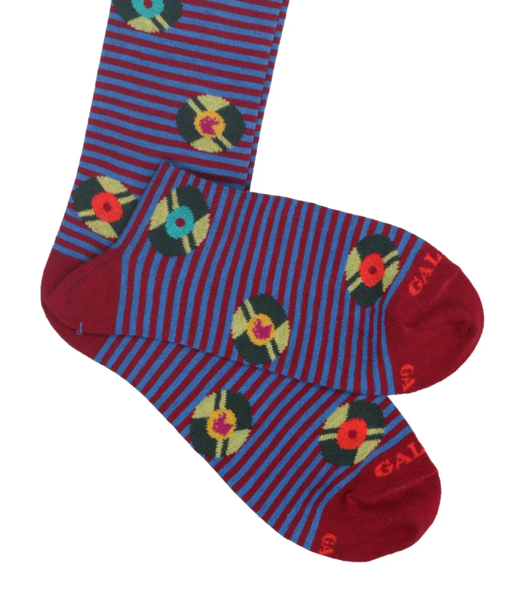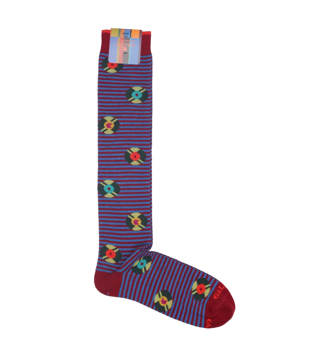 Calzini Gallo modello lungo, realizzati in cotone elasticizzato, morbide al tatto. Fantasia multicolor. Logo Gallo ricamato sulla punta a contrasto di colore.