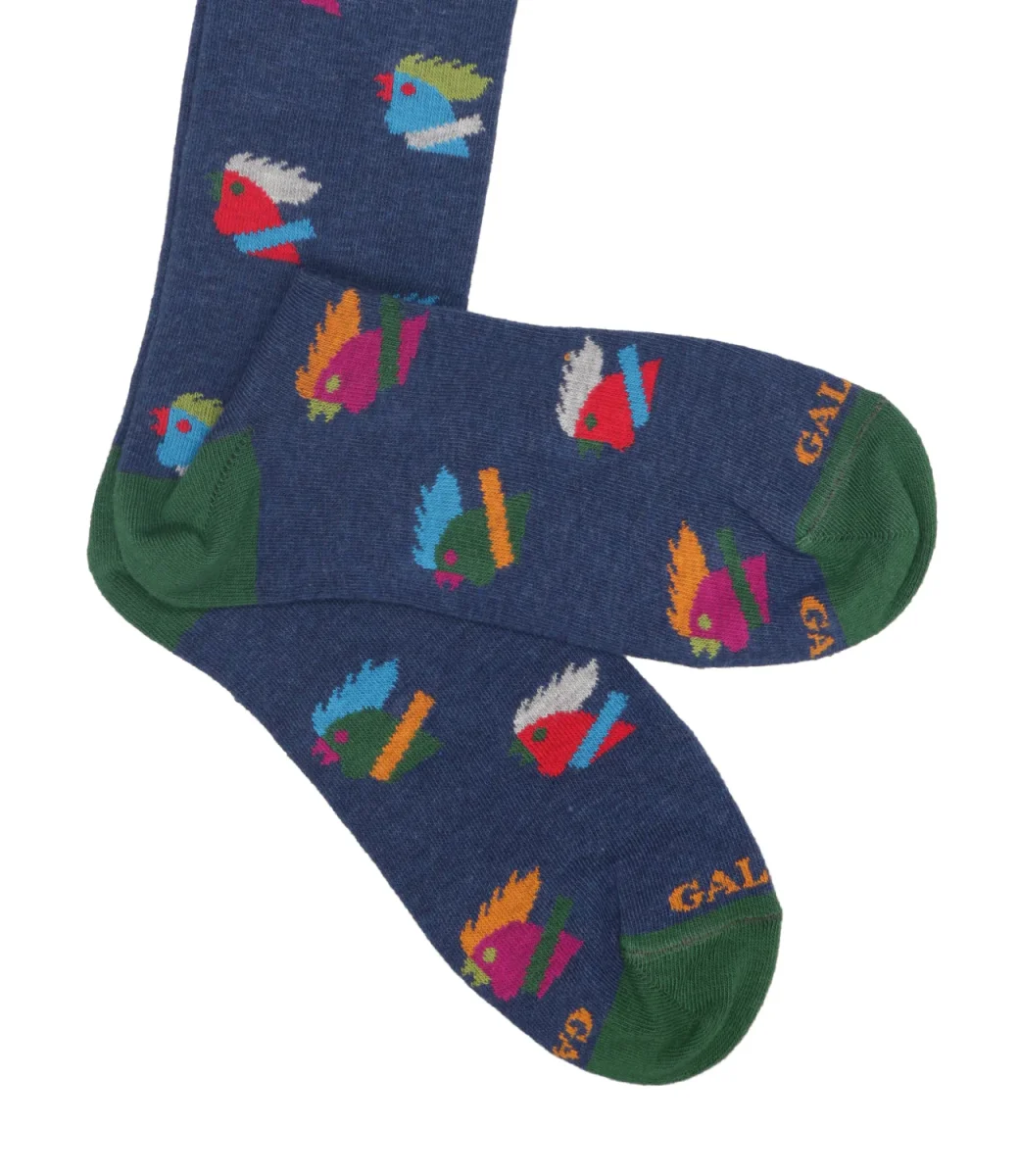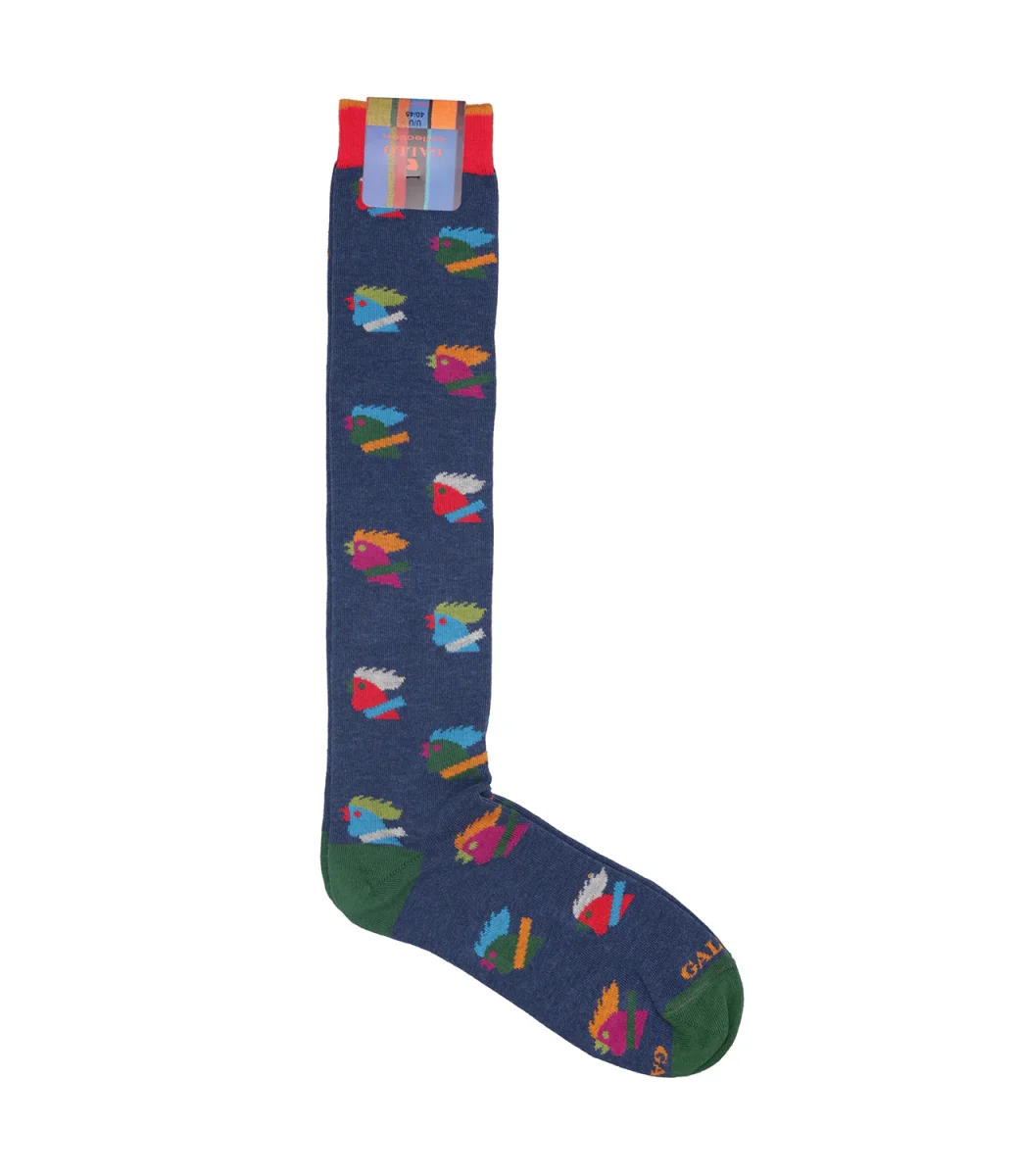 Calzini Gallo modello lungo, realizzati in cotone elasticizzato, morbide al tatto. Iconica fantasia con iconico logo all over multicolor. Logo Gallo ricamato sulla punta a contrasto di colore.