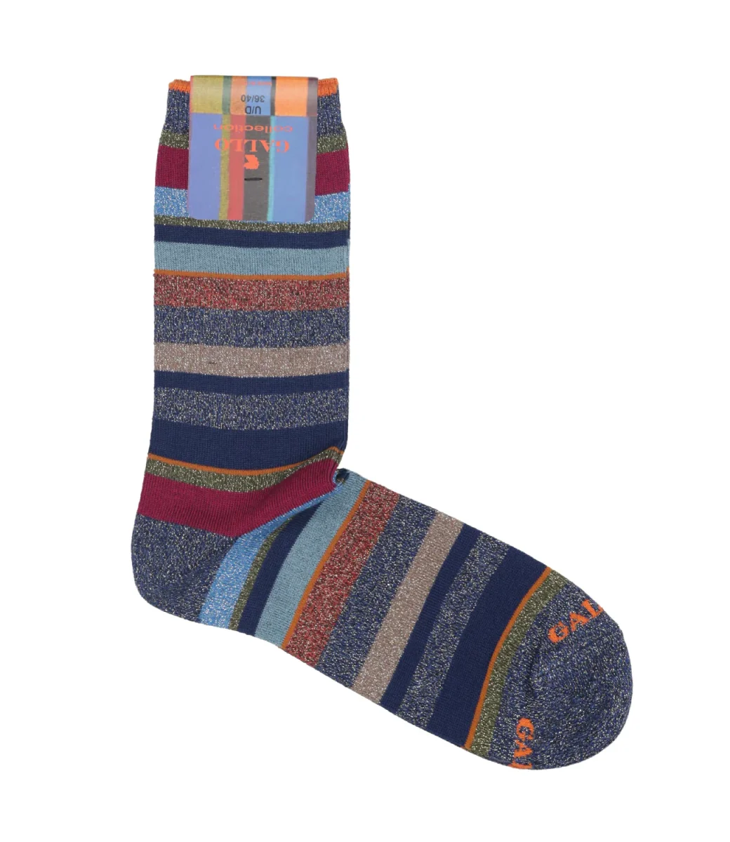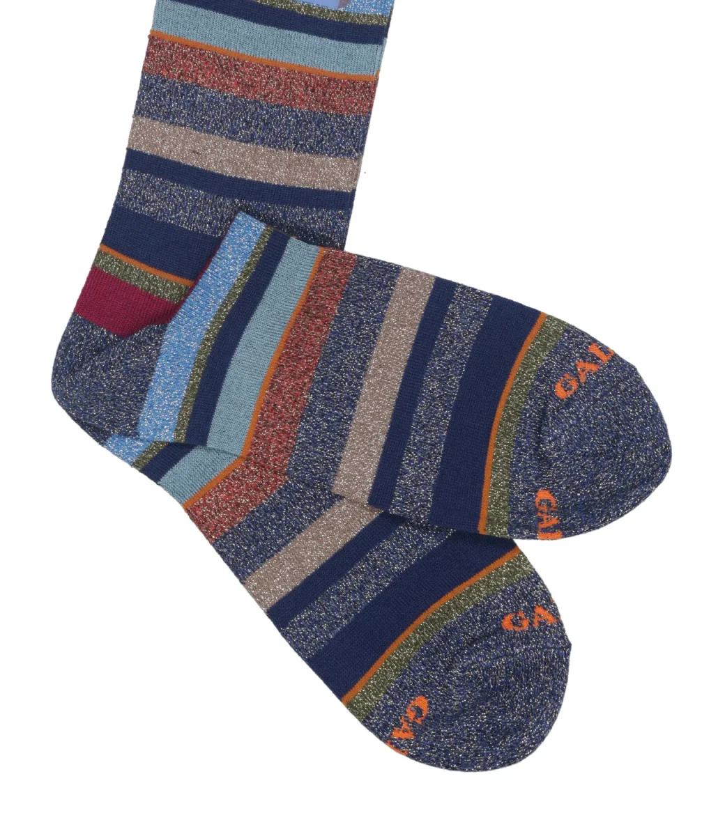 Calzini Gallo nell’iconica fantasia a righe multicolor , realizzate in Italia con un blend di filati, cotone e lurex, con tallone preformato, lunghezza a mezzo polpaccio.