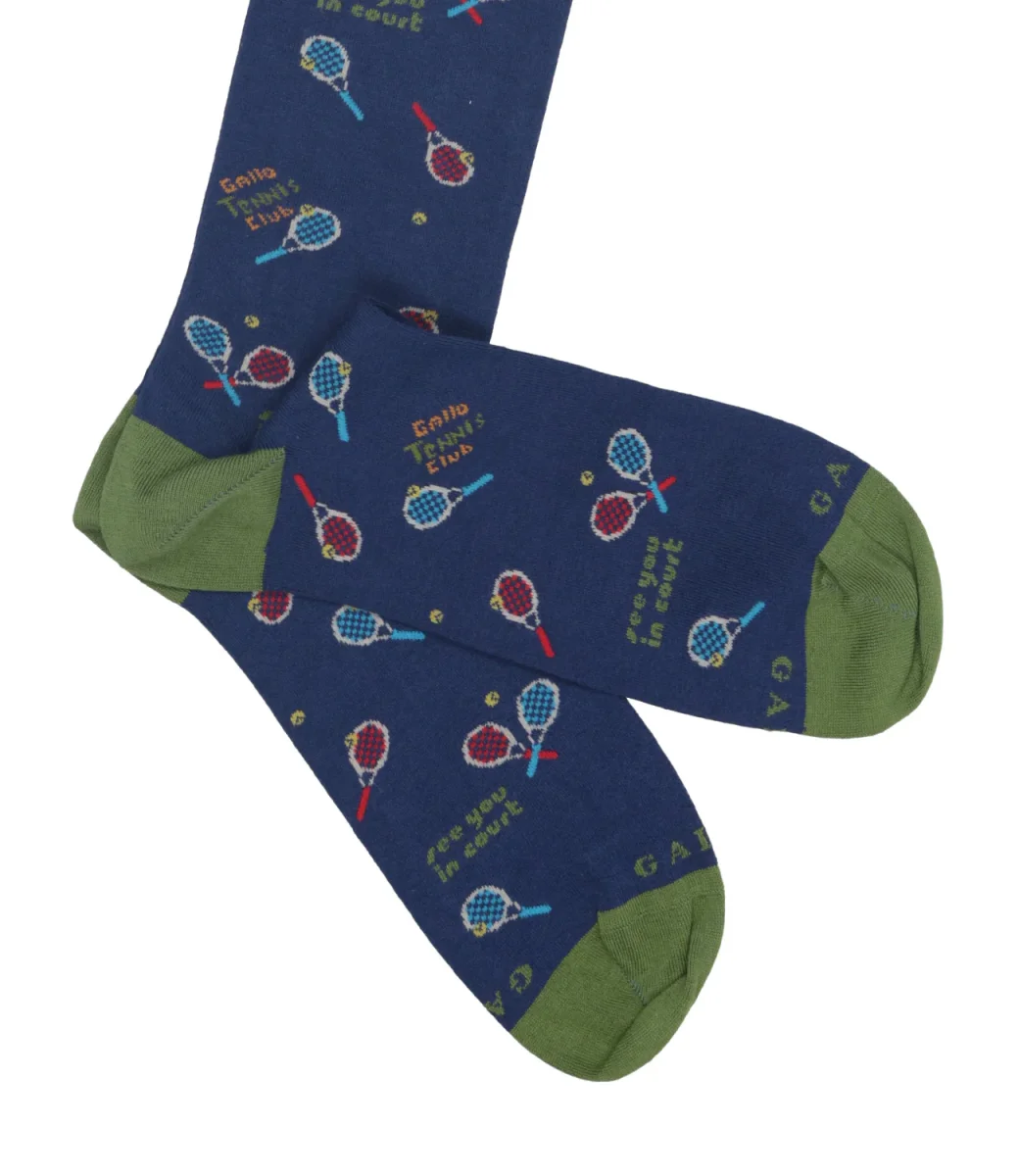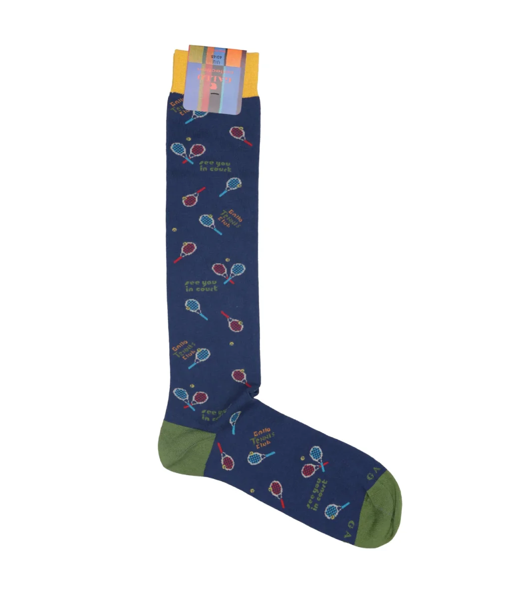 Calzini Gallo modello lungo, realizzati in cotone elasticizzato, morbide al tatto. Iconica fantasia con racchette all over multicolor. Logo Gallo ricamato sulla punta a contrasto di colore.