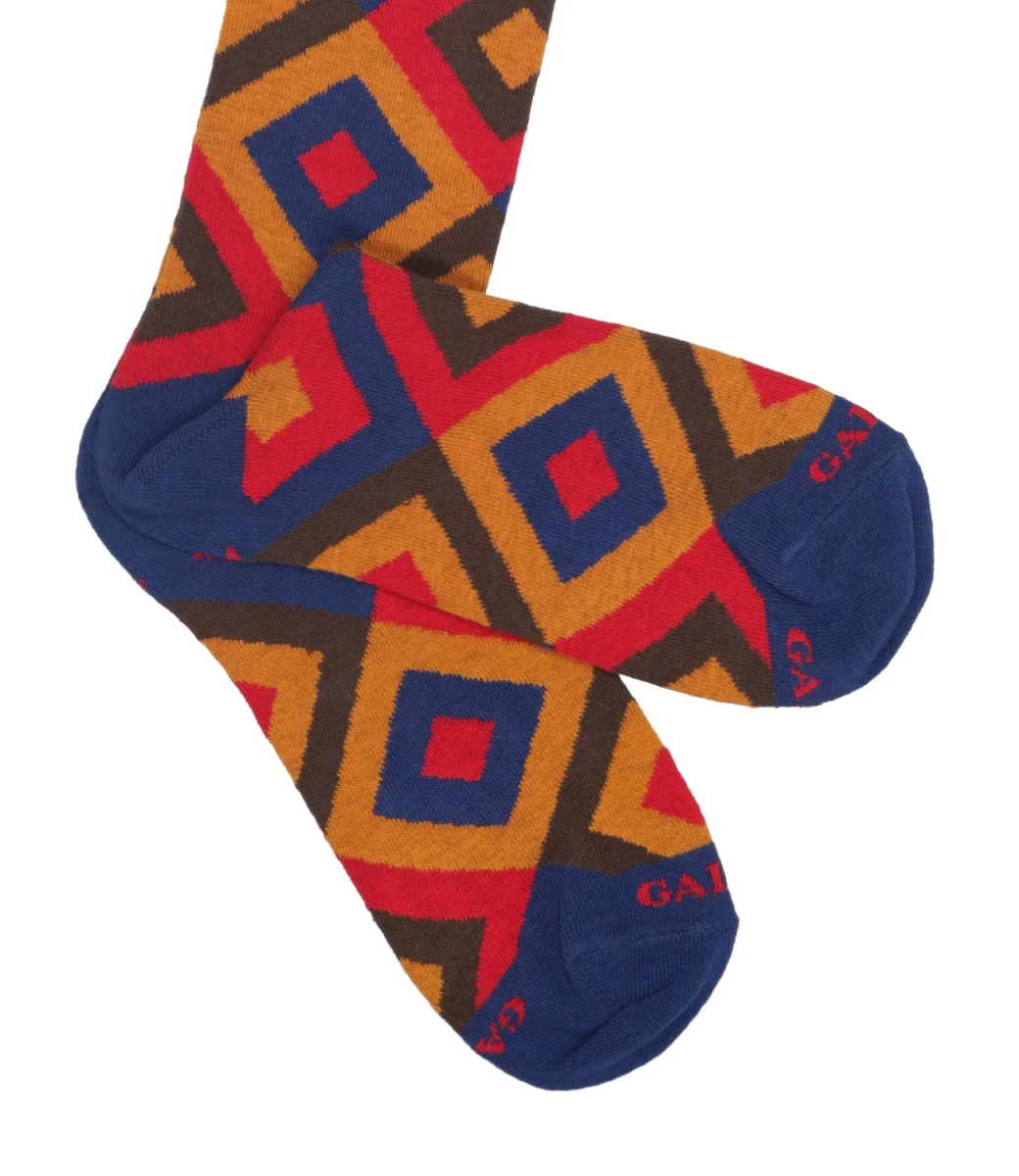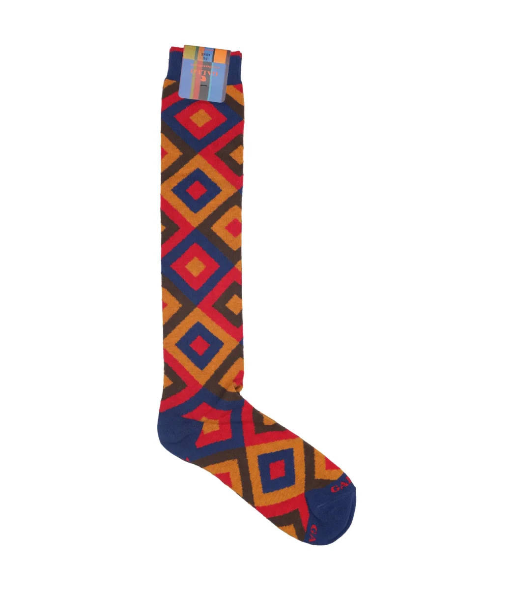 Calzini Gallo modello lungo, realizzati in cotone elasticizzato, morbide al tatto. Fantasia all over multicolor. Logo ricamato sulla punta in contrasto di colore.