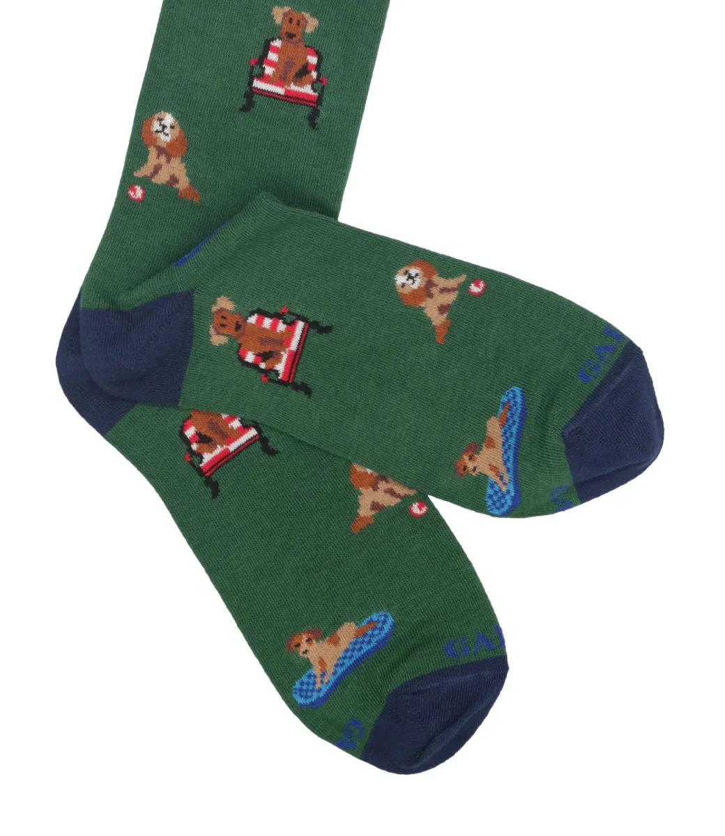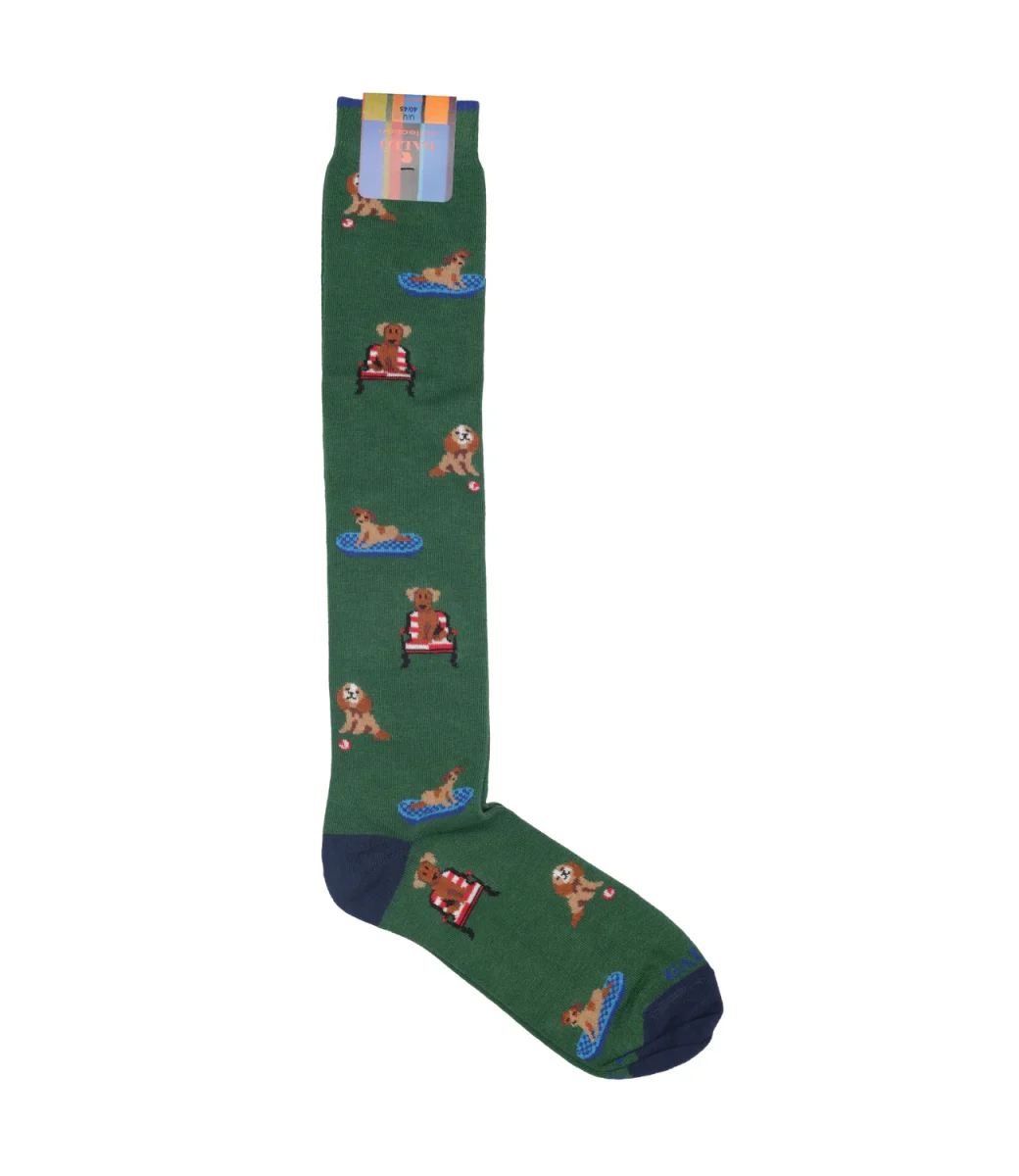 Calzini Gallo modello lungo, realizzati in cotone elasticizzato, morbide al tatto. Iconica fantasia con cani all over multicolor. Logo Gallo ricamato sulla punta a contrasto di colore.