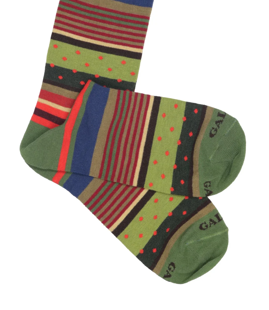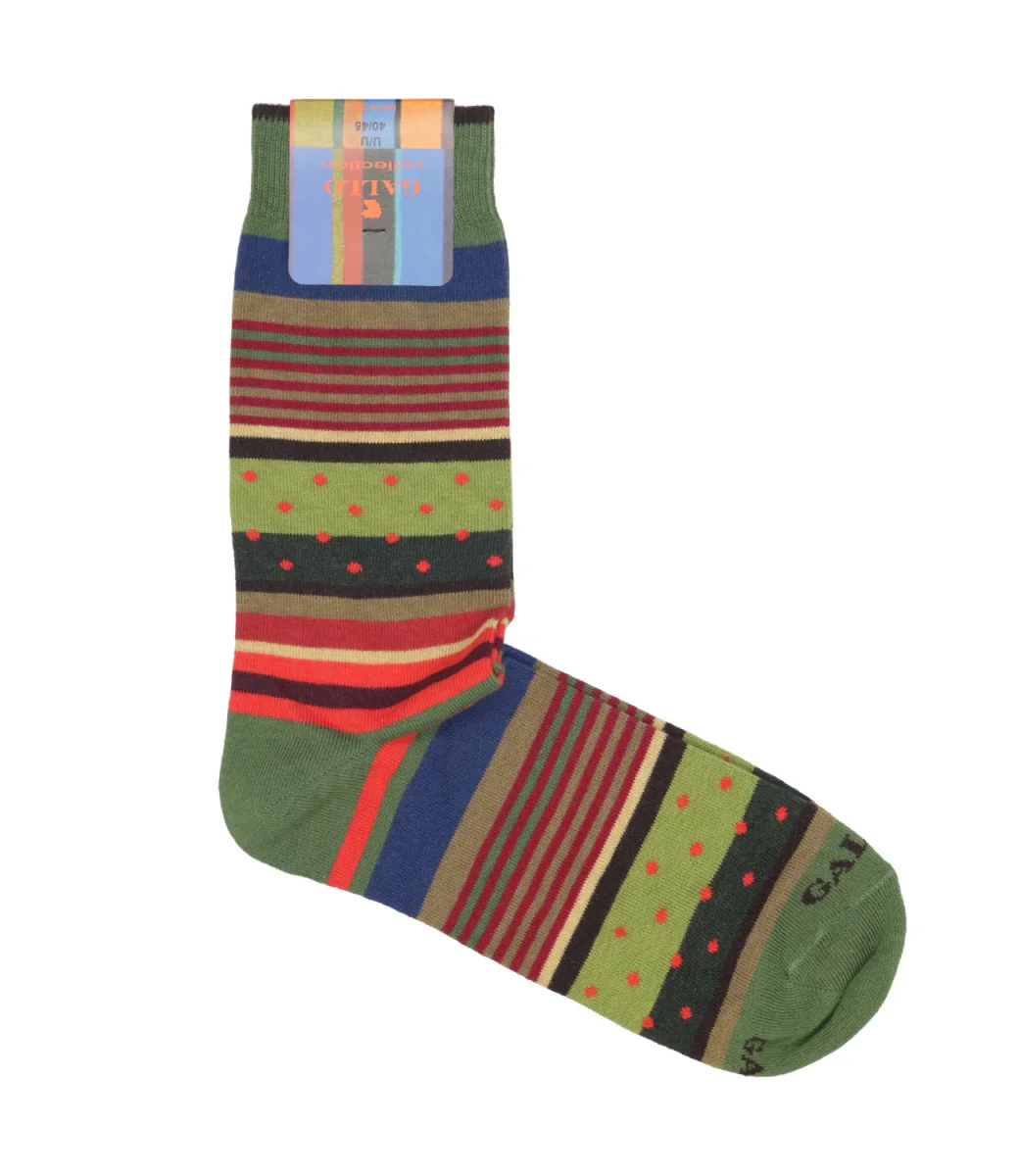 Calzini Gallo modello corto, realizzati in cotone elasticizzato, morbide al tatto. Iconica fantasia con righe e pois multicolor. Logo ricamato sulla punta a contrasto di colore.