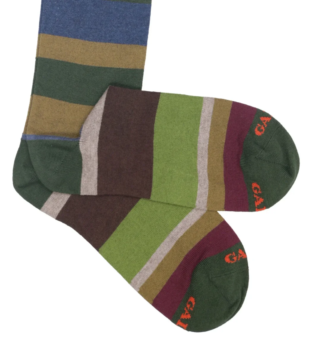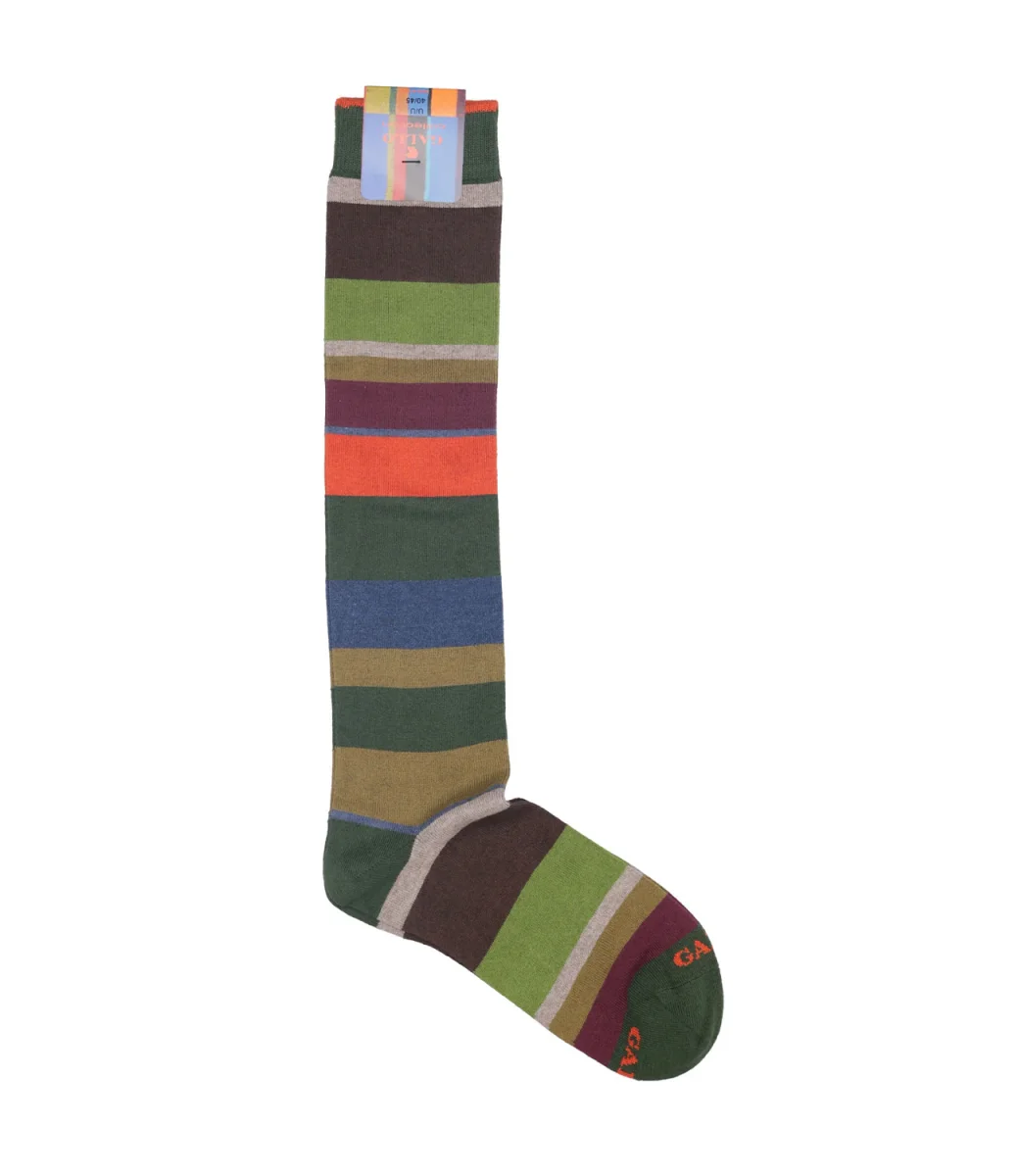 Calzini Gallo modello lungo,realizzati in blend di filati pregiati con cotone e cashmere, morbide al tatto. Iconica fantasia a righe orizzontali multicolor. Logo Gallo ricamato sulla punta a contrasto di colore.