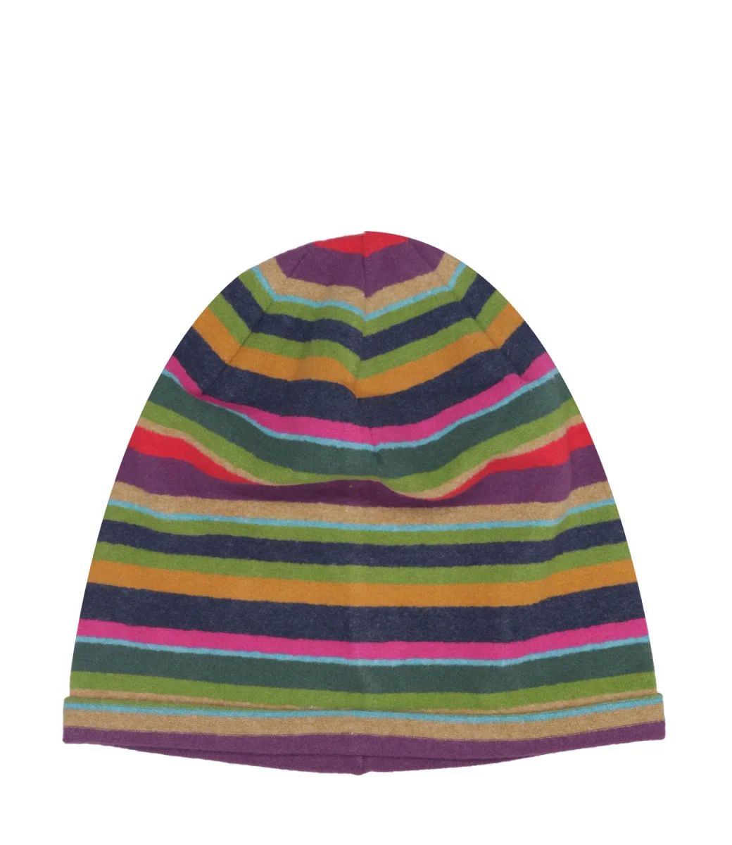 Cappello Gallo in pile a righe multicolor, taglio vivo, logo sul retro.