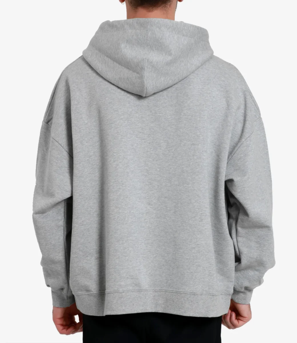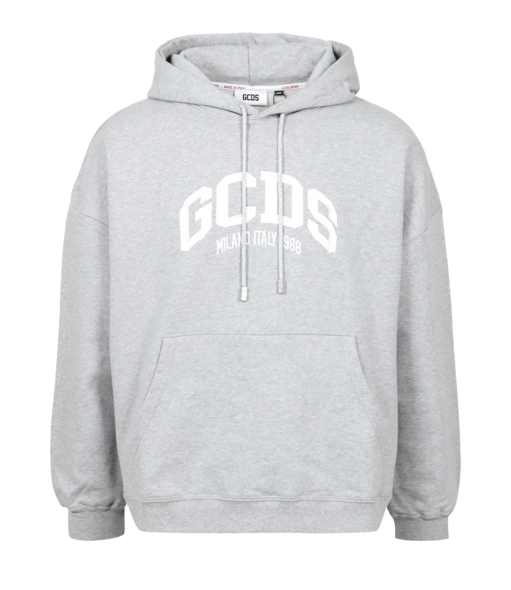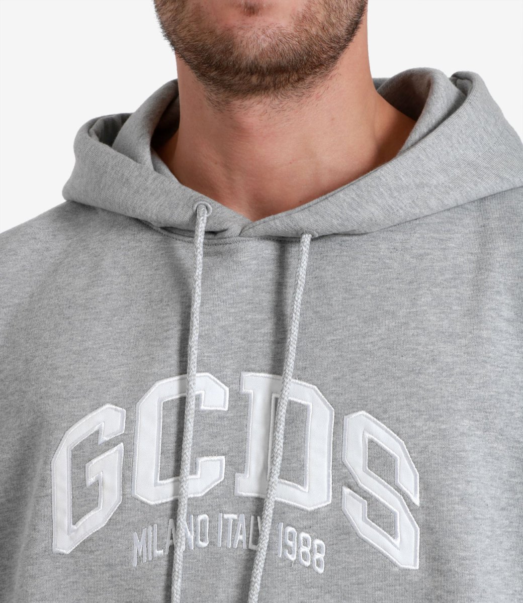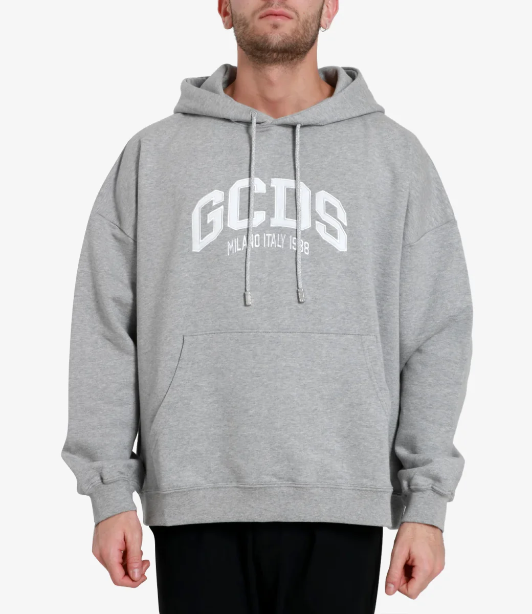 Felpa GCDS modello Logo Loose con cappuccio e coulisse, maniche lunghe, tasca frontale e logo cucito sul torace. Vestibilità regolare. Il modello è alto 1.75m ed indossa una L.