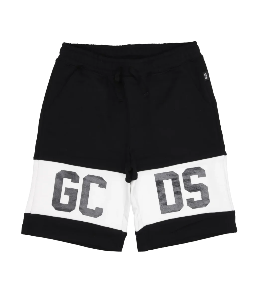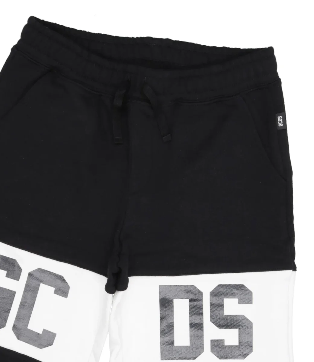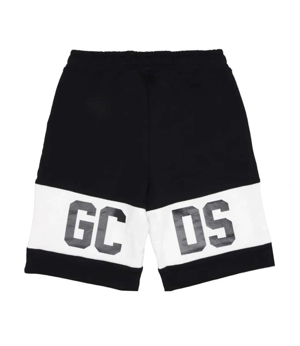 Pantaloni corti GCDS Junior in cotone con coulisse in vita e banda con logo GCDS intarsiato a contrasto applicato sul davanti e sul retro.
