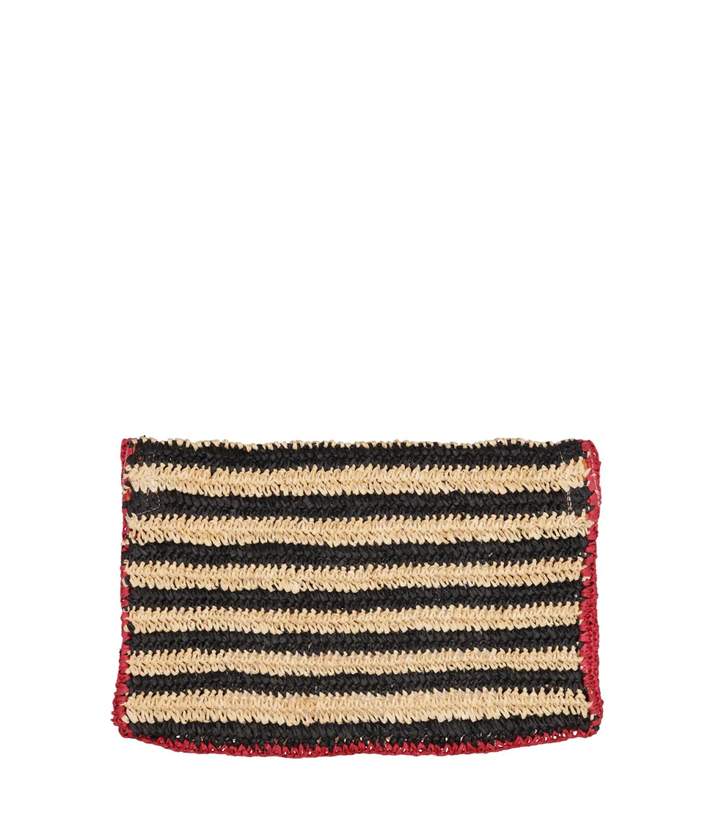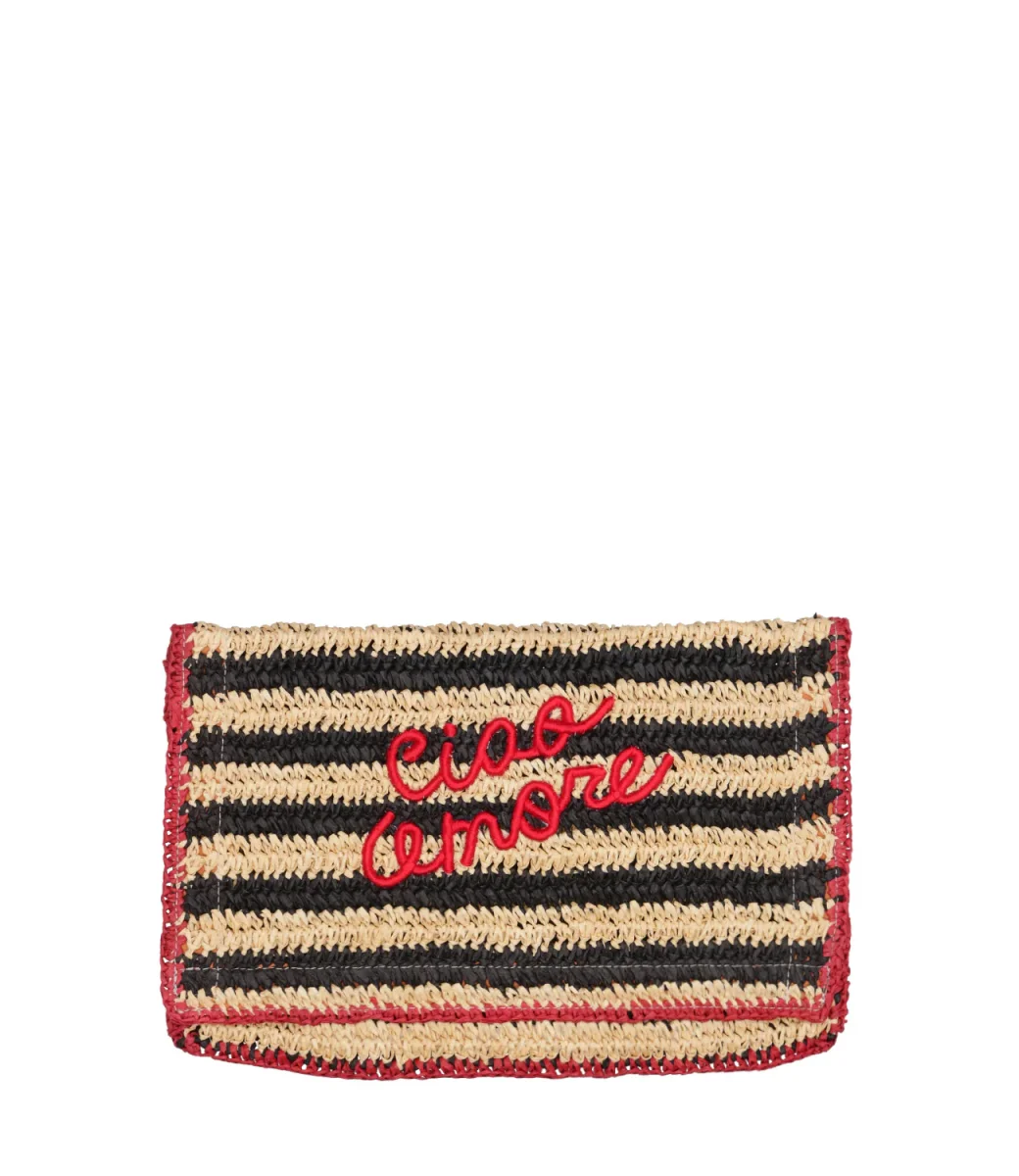 Pochette Giada Benincasa in rafia, lavorazione ad intreccio e decoro Ciao Amore ricamato sul davanti.