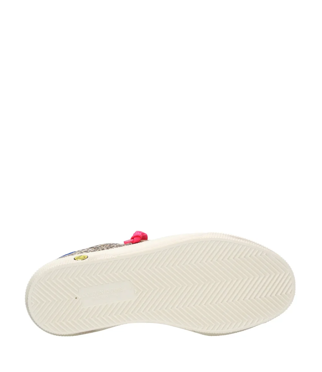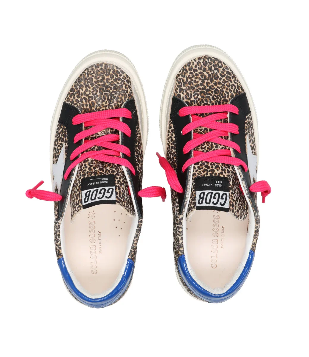 Sneakers Golden Goose Deluxe Brand May si caratterizza per la tomaia in tessuto maculato sui toni del bronzo e maarrone, la stella argento e il talloncino in pelle turchese.