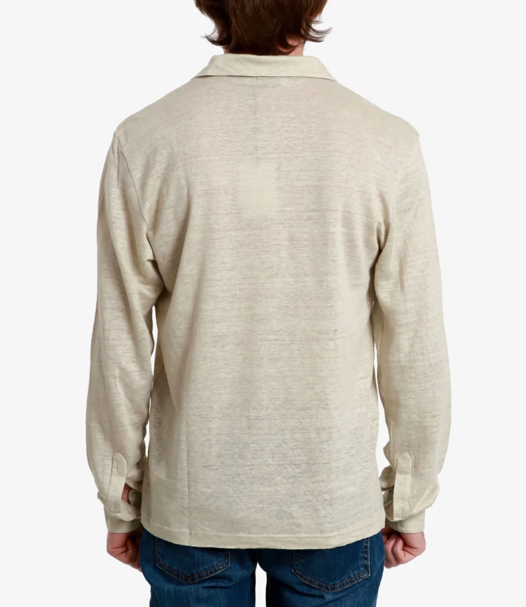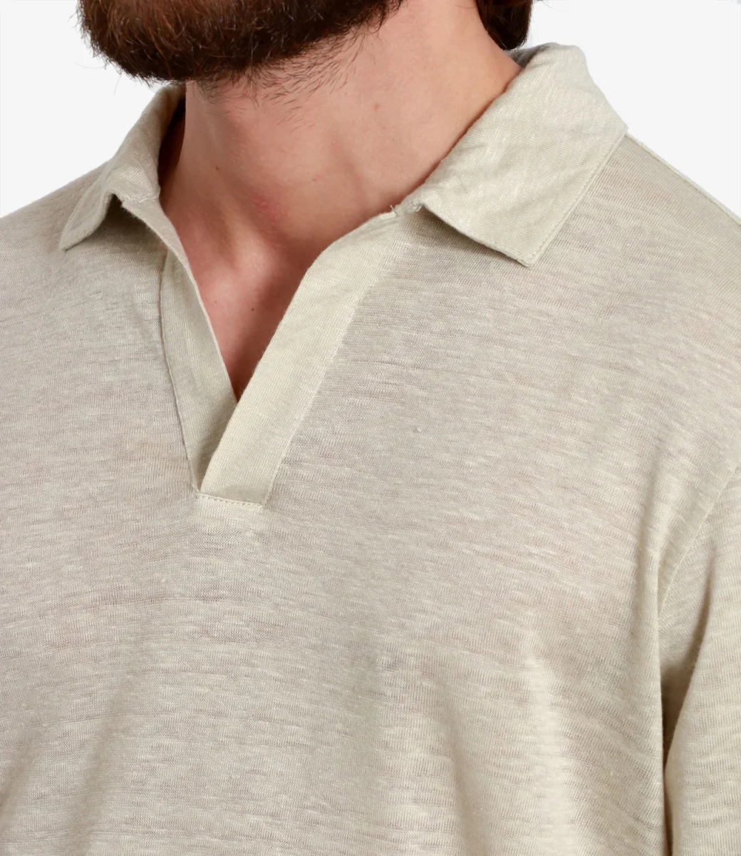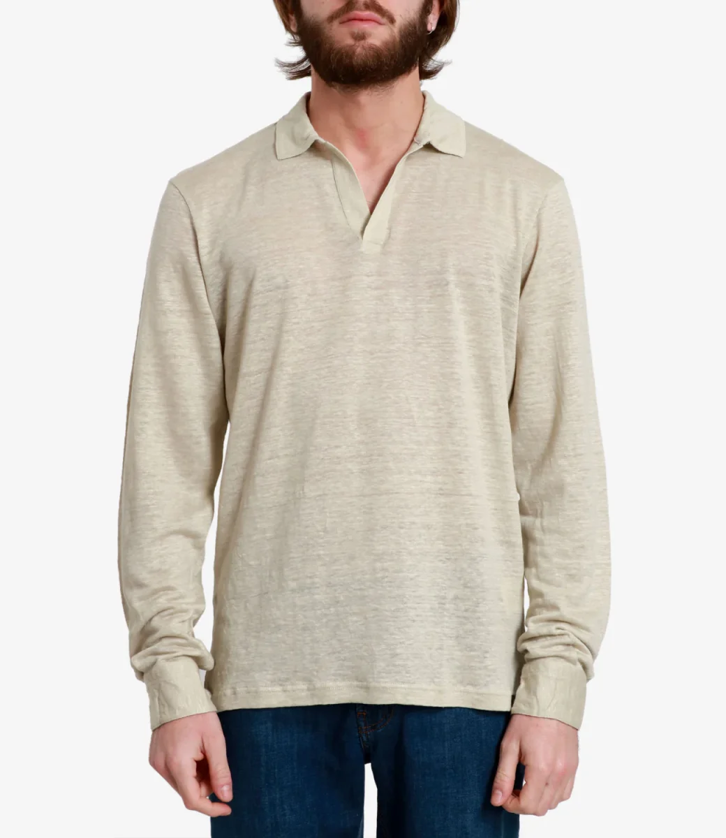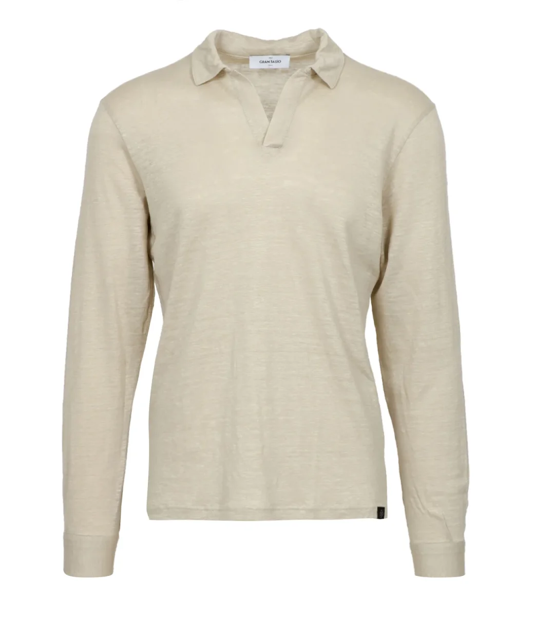 Polo Gran Sasso realizzata con filo in lino. Modello con maniche lunghe, colletto classico, scollo a V. Ricercata eleganza per outfit classici dai tessuti e lavorazioni che si distinguono.
