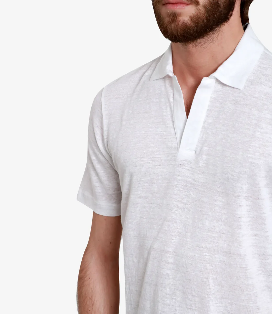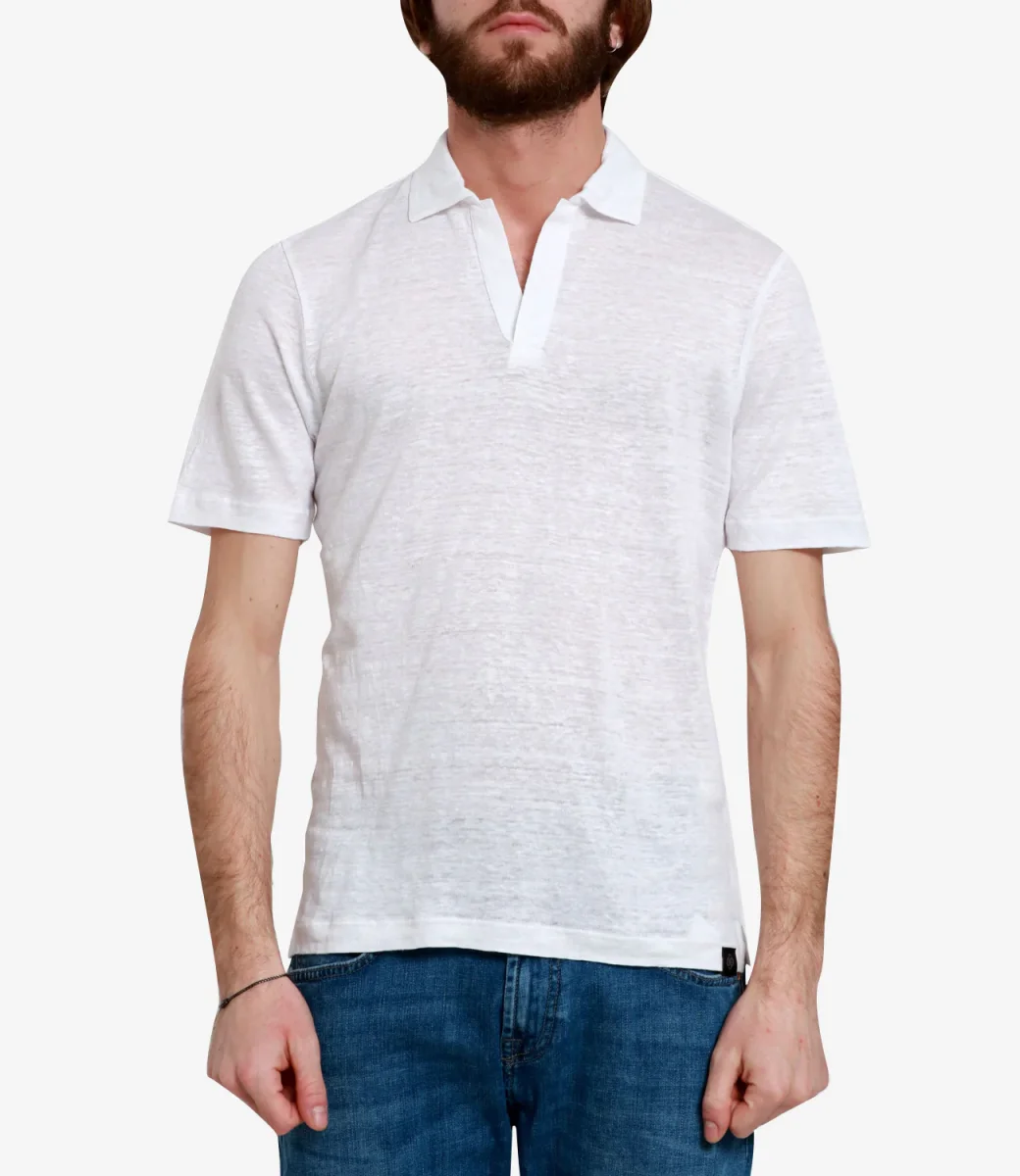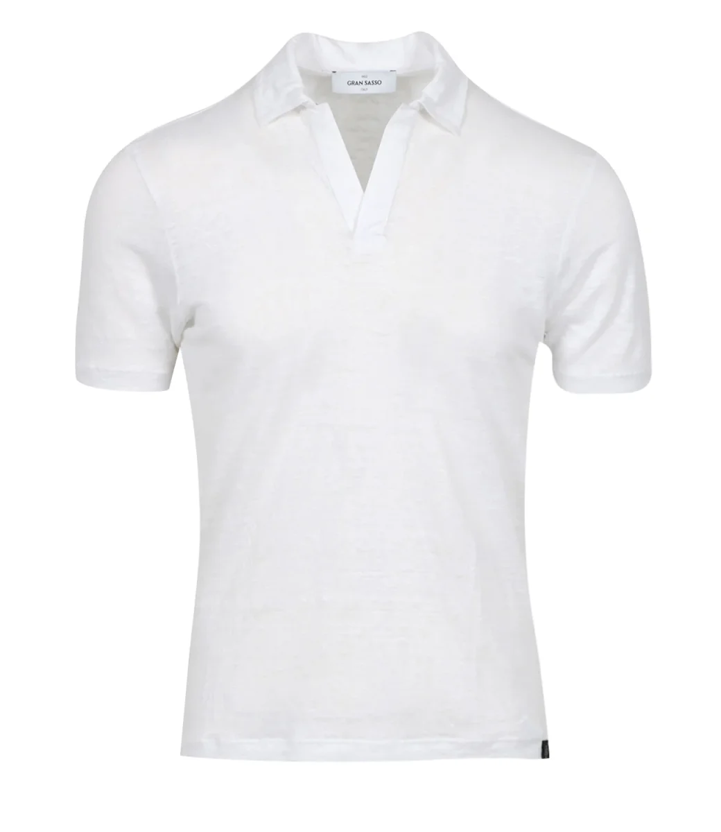 Polo Gran Sasso realizzata con filo in lino. Modello con maniche corte, colletto classico, scollo a V. Ricercata eleganza per outfit classici dai tessuti e lavorazioni che si distinguono.
