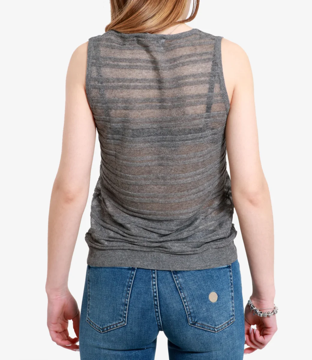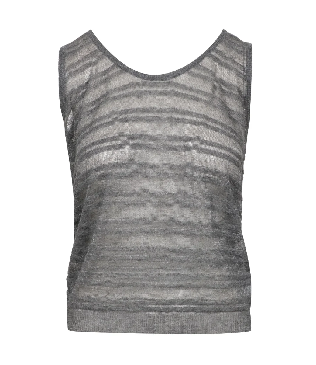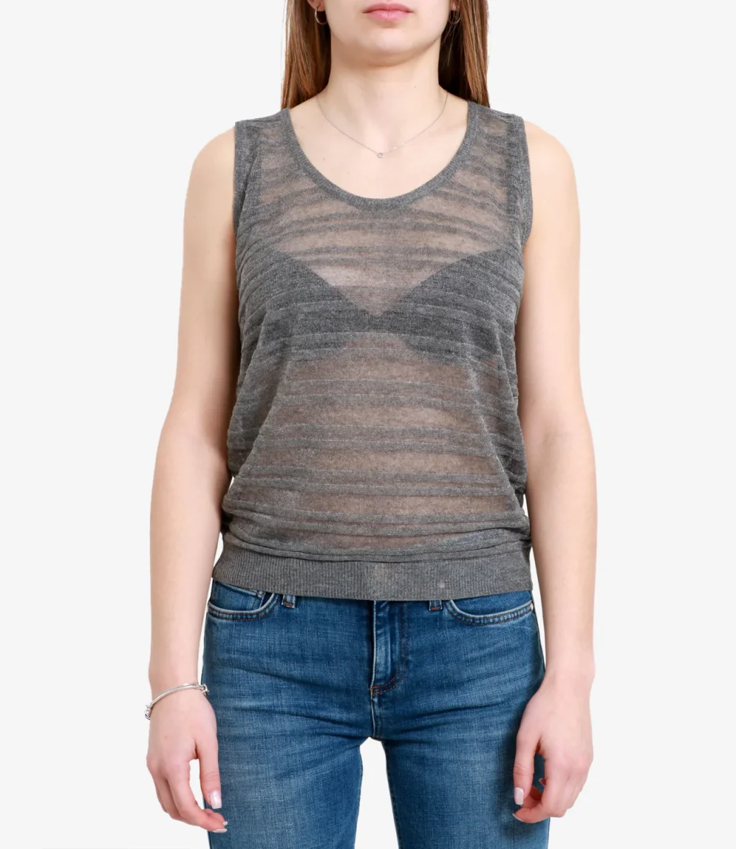 Canotta Grifoni realizzata in filo lavorato a maglia con motivo a rete a trama fitta rilasciando trasparenze e righe orizzontali in rilievo, per un look contemporaneo.