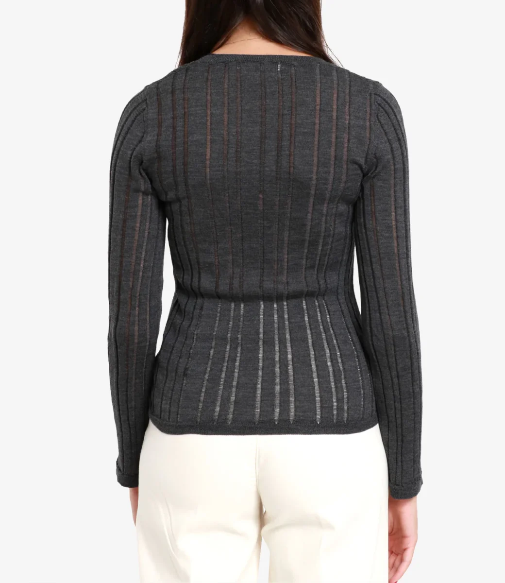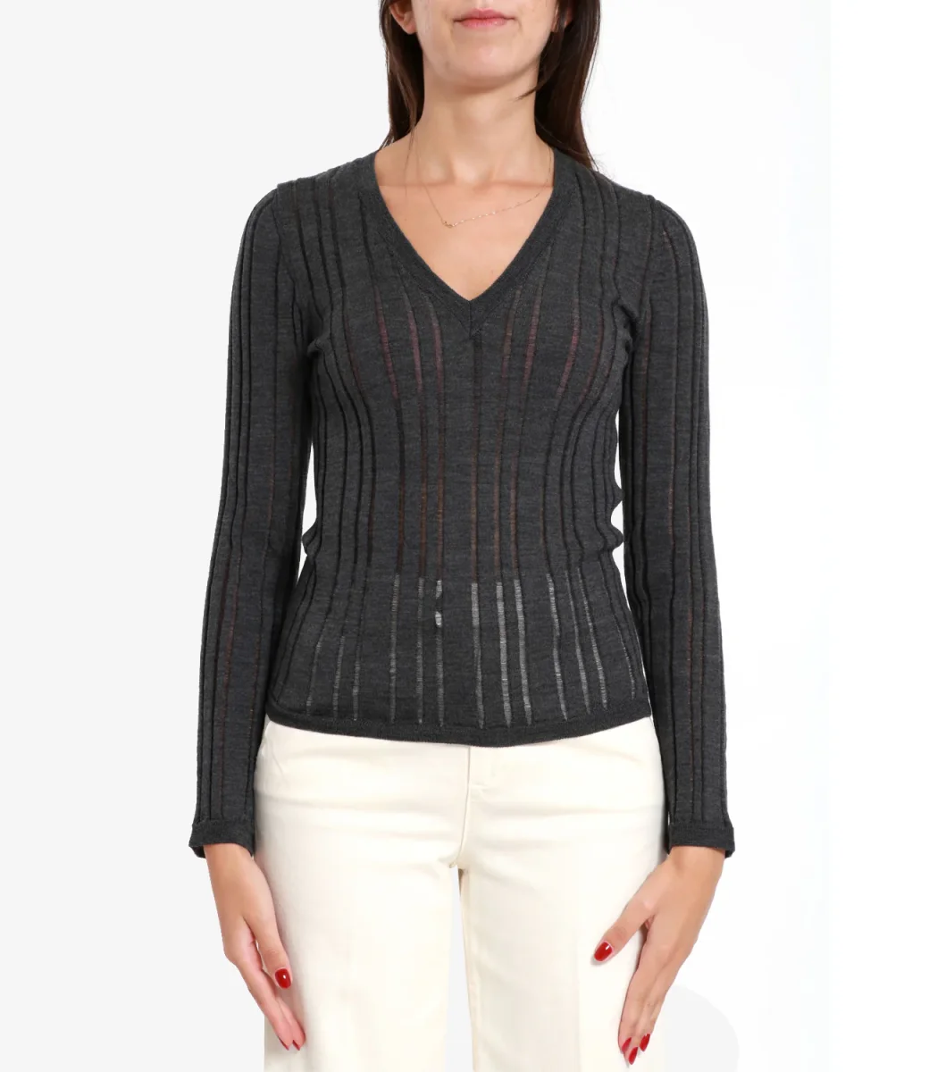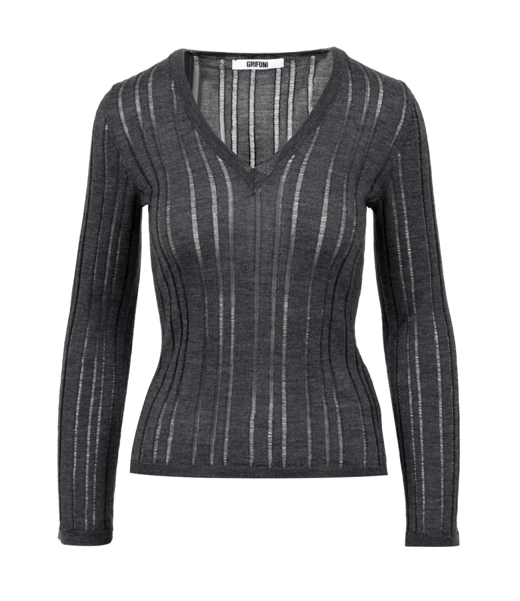Maglia Grifoni in lana vergine, lavorazione a coste alternate con motivo in trasparenza, scollo a V bordato a costine, maniche lunghe con polsino a costine.