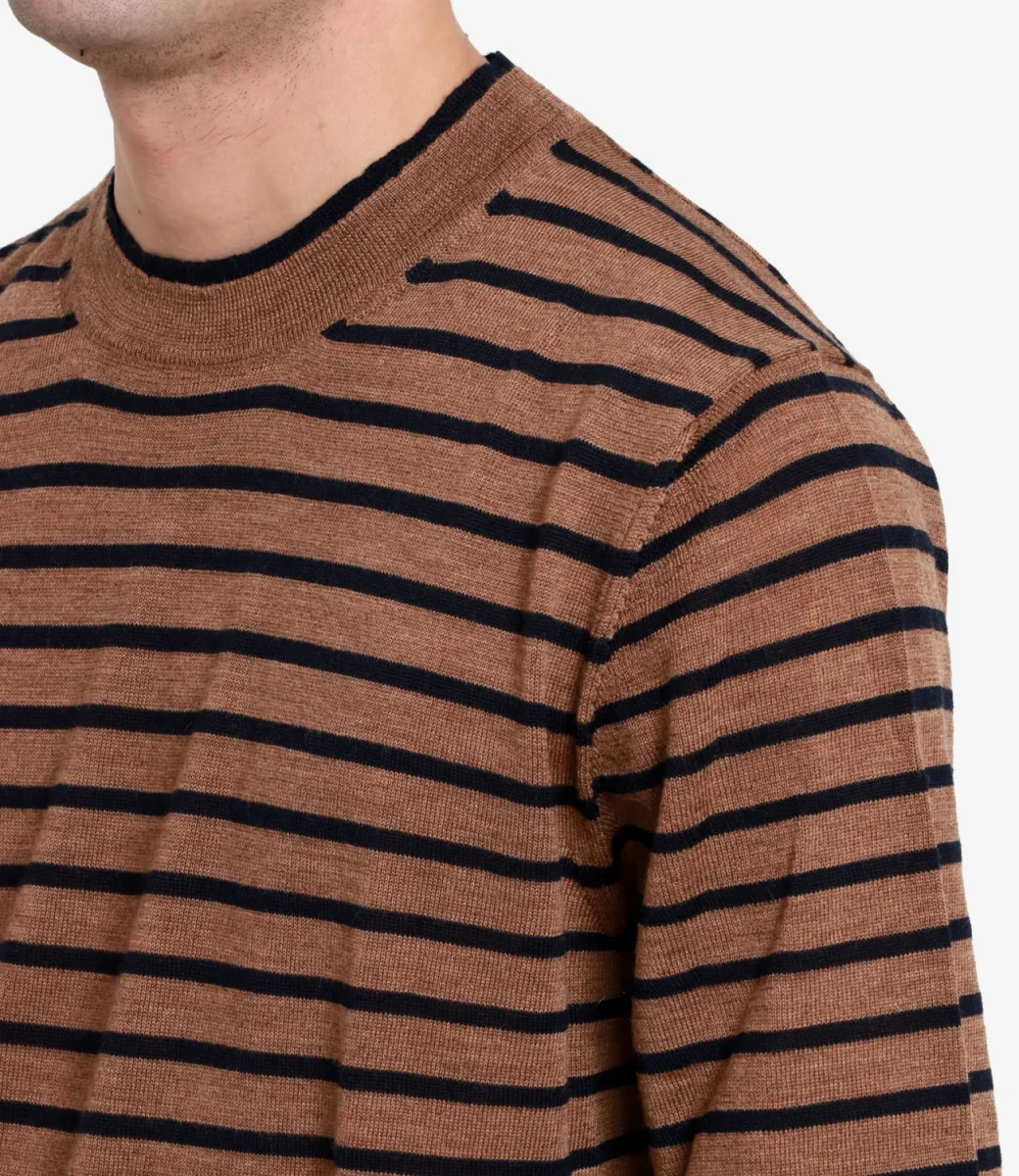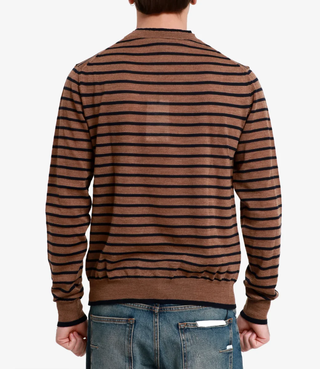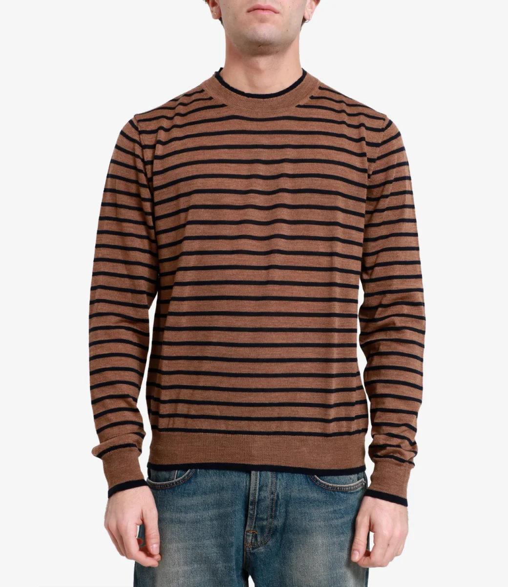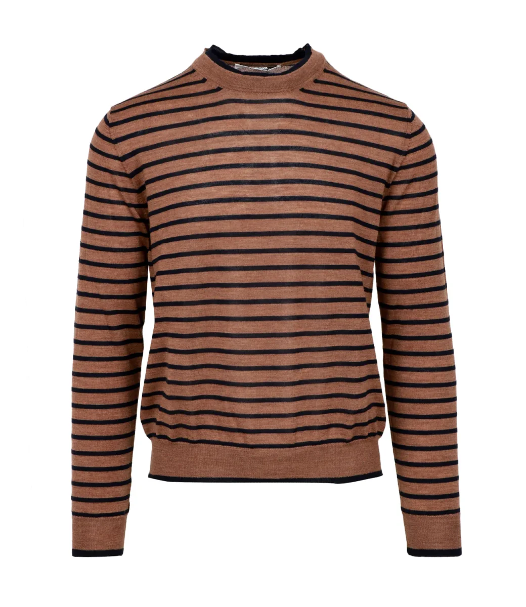 Maglia Grifoni in lana merino woolmark extrafine, lavorazione a maglia rasata leggera, silhouette accostata.