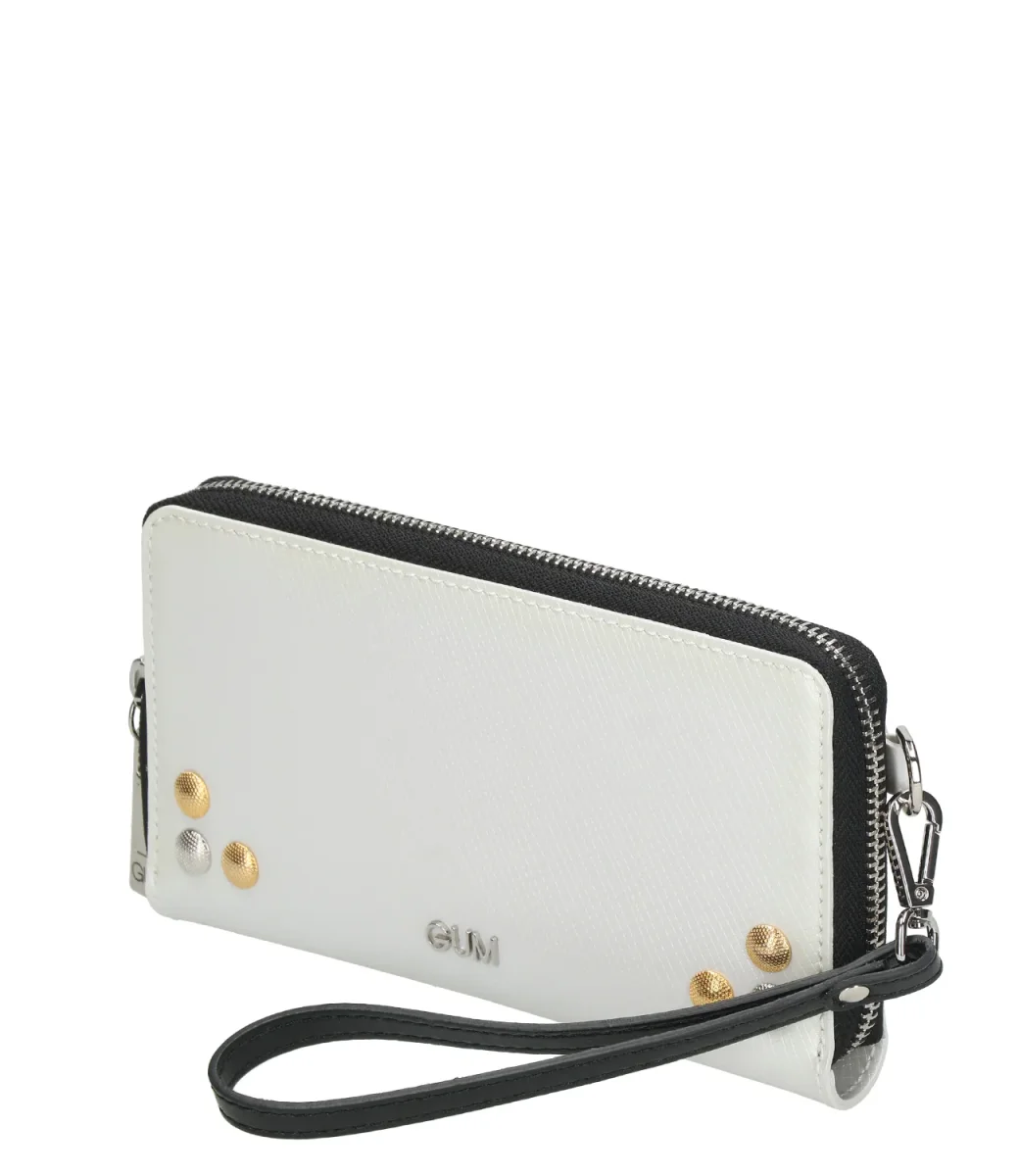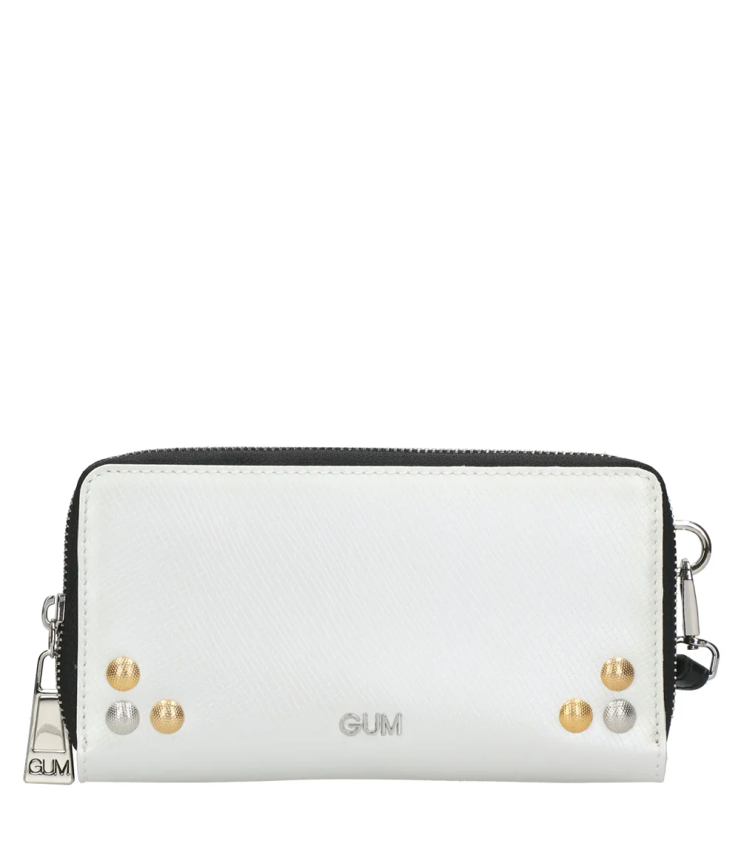 Portafoglio di manifattura italiana della linea Heart Jewel in vinile tinta unita con borchie applicate davanti. Chiusura con zip e tira zip a forma di cuore logato. Tasche piatte interne e tasca con zip porta spiccioli. Manico in tono removibile tramite moschettone.