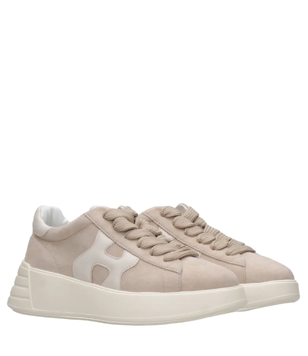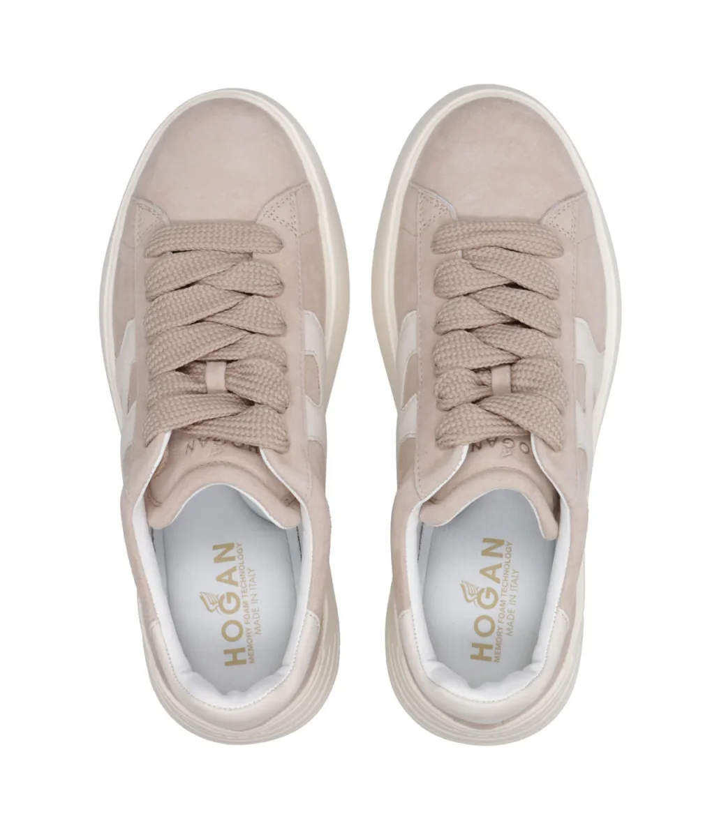 SneakersHogan Rebel H562 silhouette dall linee morbide realizzata in pelle scamosciata, iconica H laterale ondulata in pelle. La soletta in memory foam, chiusura con lacci.
