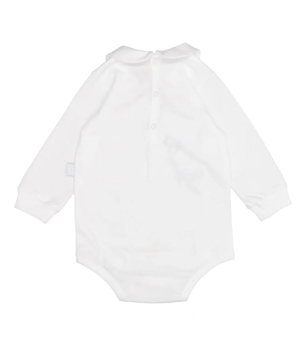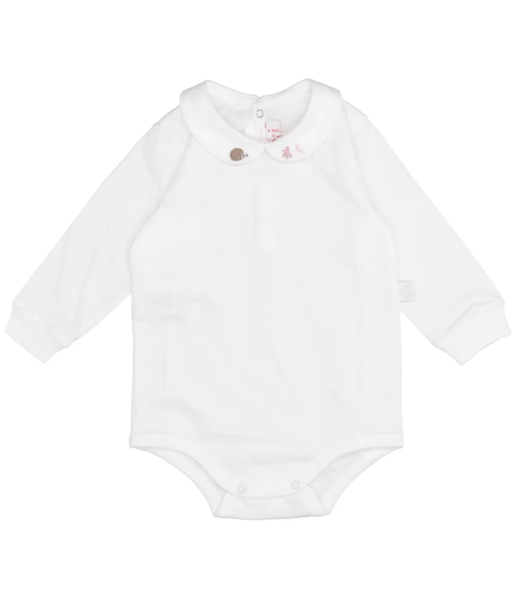 Body camicia Il Gufo da neonato in jersey 100% cotone bianco latte con maniche lunghe e colletto tondo impreziosito da un simpatico riccio sui toni del beige e da delicate foglioline sui toni del rosa ricamati a contrasto. Apertura con pratici bottoncini a pressione sul retro e sul fondo.