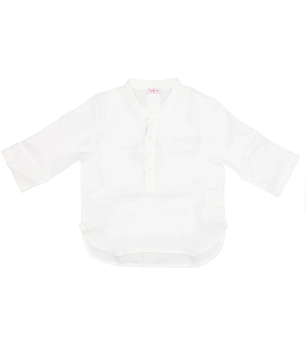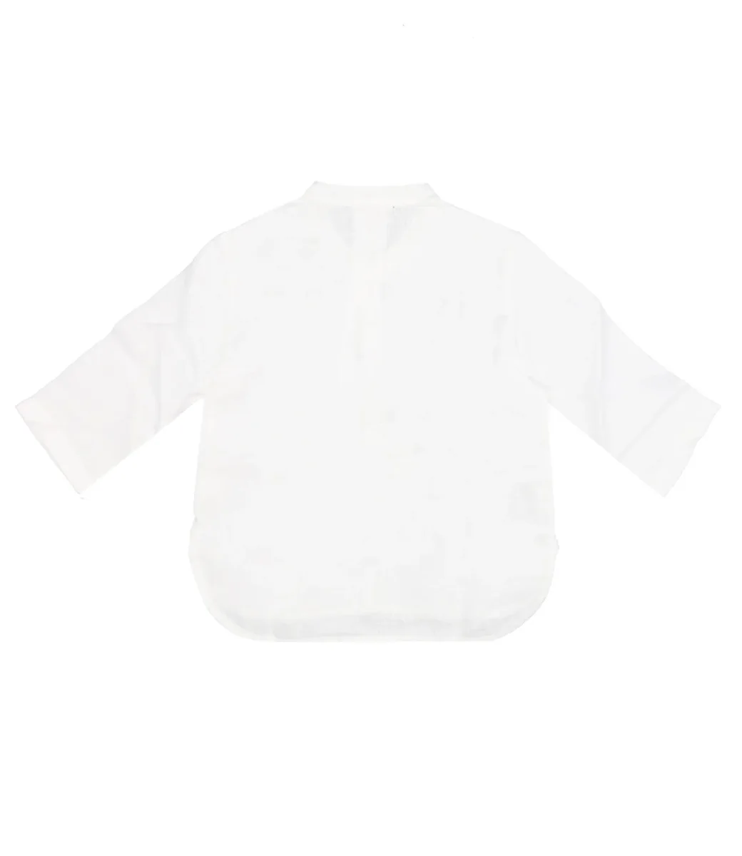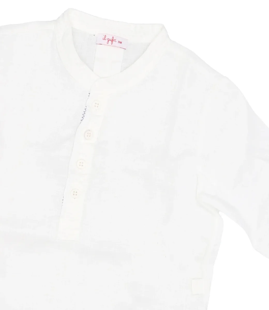 Camicia Il Gufo in lino di colore bianco dal fit morbido con colletto alla coreana. Chiusura frontale a 4 bottoni con profili ricamati in celeste scuro a contrasto. Fondo del capo dal design stondato con spacchetti laterali. Capo perfetto sia per occasioni informali che per cerimonie.
